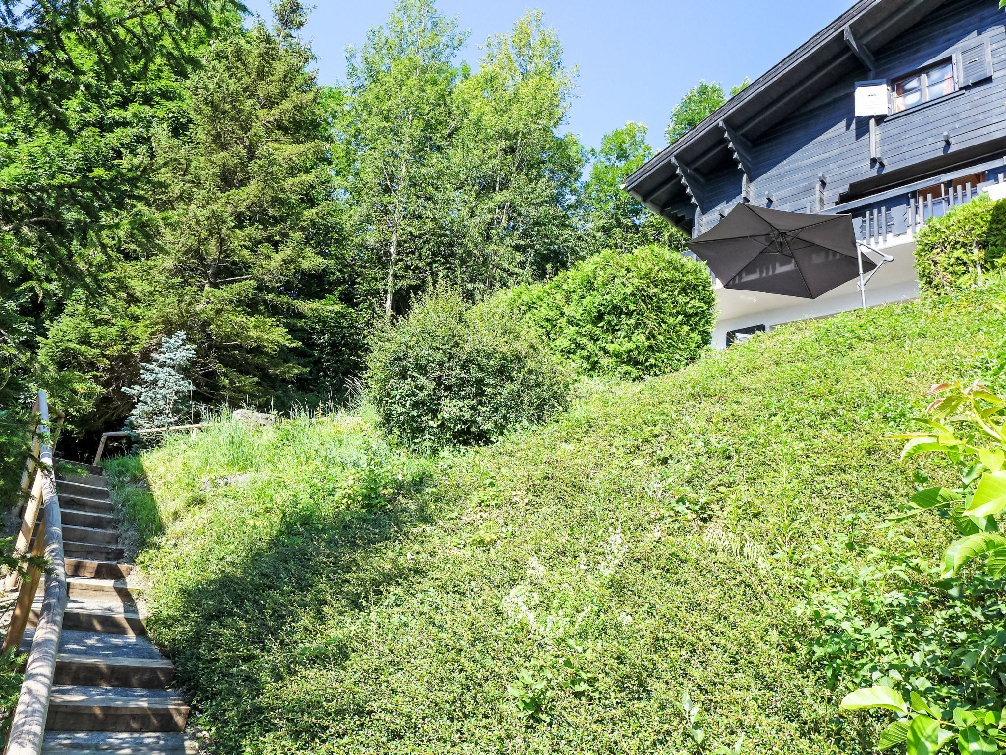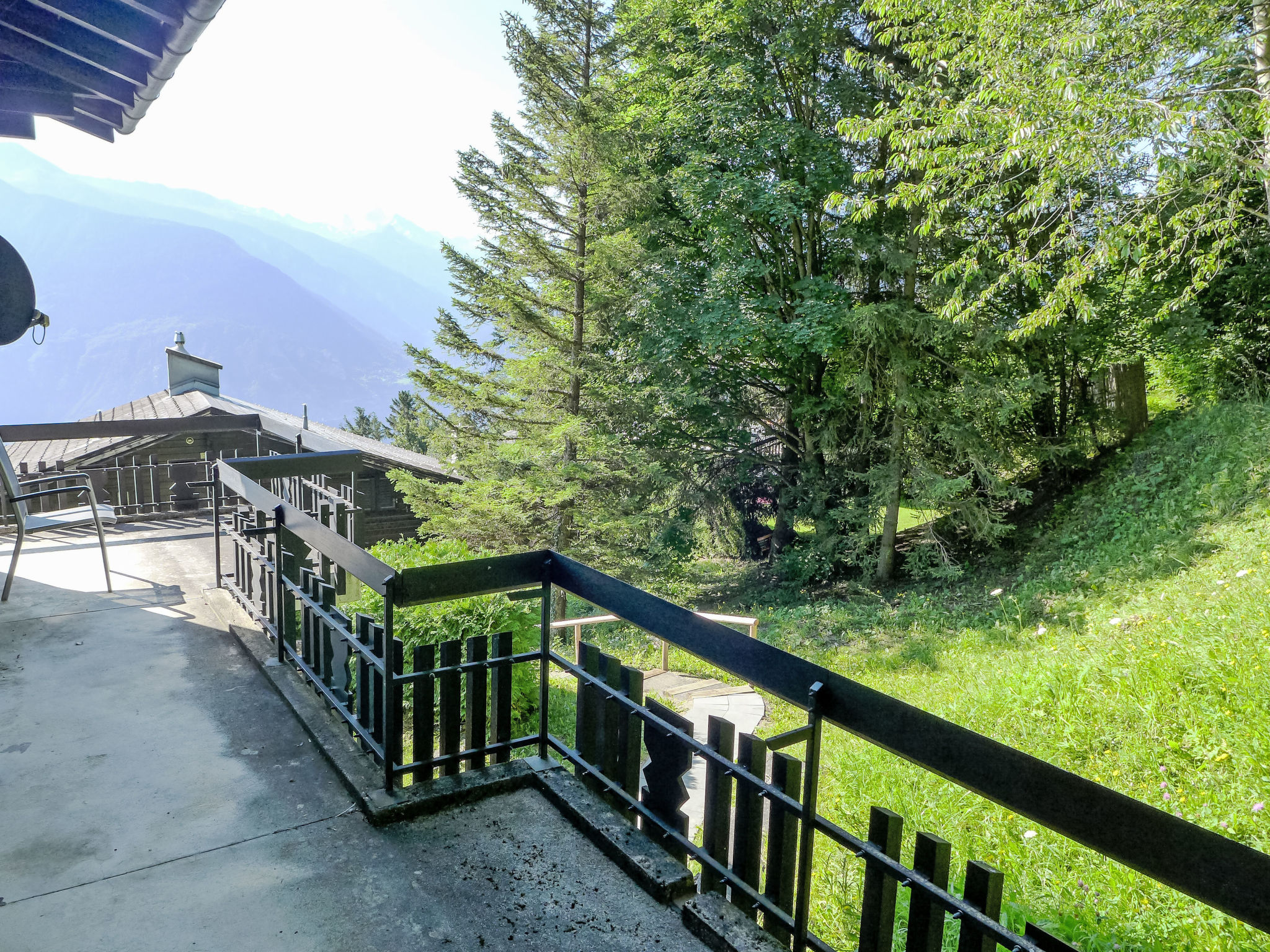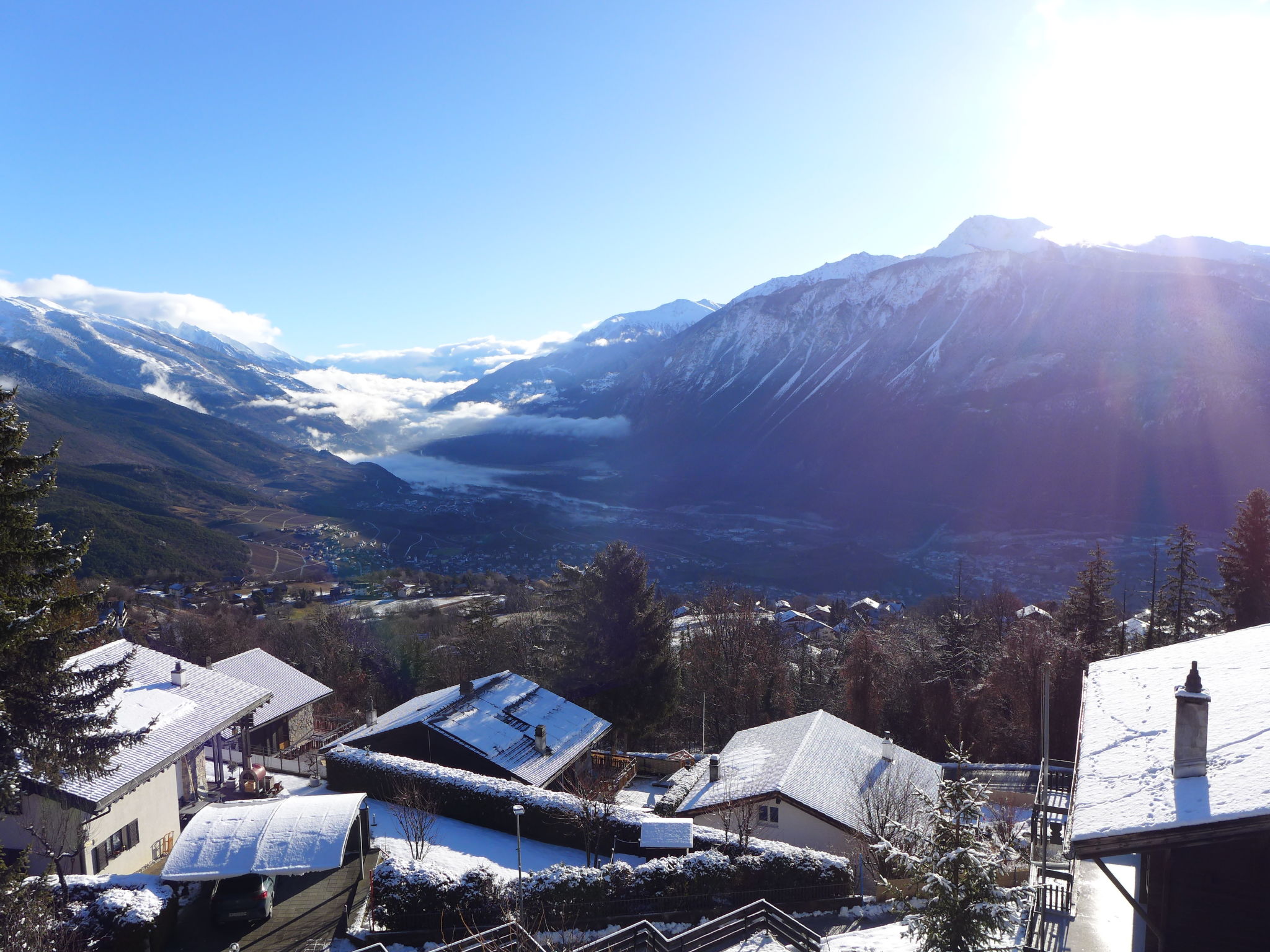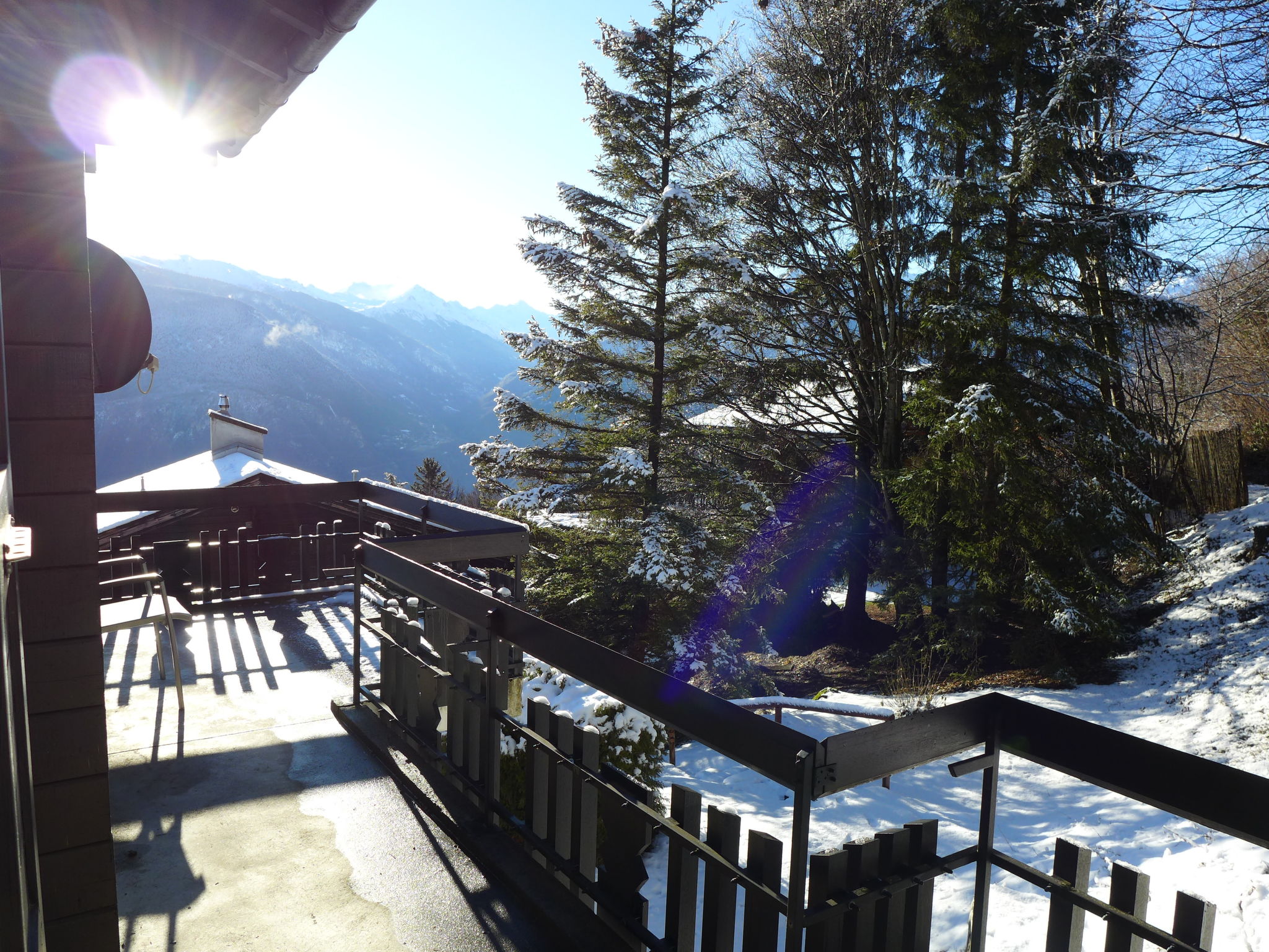 "Sans Nom", metà di una villetta bifamiliare 5 locali 120 m2 su 3 piani, esposizione sud. Oggetto adatto a 4 adulti + 2 bambini. In parte restaurata nel 2024, arredamento confortevole e gradevole: soggiorno/sala da pranzo piccolo con camino, TV (via cavo), radio e CD. Uscita sulla terrazza. Cucina aperta (forno, lavastoviglie, 4 piastre cottura in vetroceramica, tostapane, bollitore elettrico, forno a microonde, congelatore, macchina da caffè elettrica, capsule per la macchina da caffè (Nespresso) extra, set per raclette, set per fondue (chinoise, formaggio)). Piano superiore: 1 camera grande con 1 letto doppio (2 x 90 cm, lunghezza 200 cm). Uscita sul balcone. 1 camera con 1 letto (90 cm, lunghezza 190 cm). Vasca/WC, WC separato. 2. piano superiore: 1 camera mansardata con 2 letti (90 cm, lunghezza 200 cm). 1 camera per bambini mansardata con 1 letto (90 cm, lunghezza 190 cm). Doccia/WC. Balcone 15 m2, esposizione sud e esposizione est, terrazza 20 m2, esposizione sud. Mobili da terrazza, mobili da balcone, barbecue (portatile), sedie a sdraio (1). Bella vista sulle montagne, sulla valle e sul bosco. A disposizione: lavatrice, ferro da stiro, seggiolone, lettino per bimbi fino 2 anni, asciugacapelli. Internet (wifi, gratis). Garage (1 Auto), altezza 195 cm, larghezza 220 cm. Prego notare: casa per non fumatori. 1 animale/cane di piccola taglia consentito.