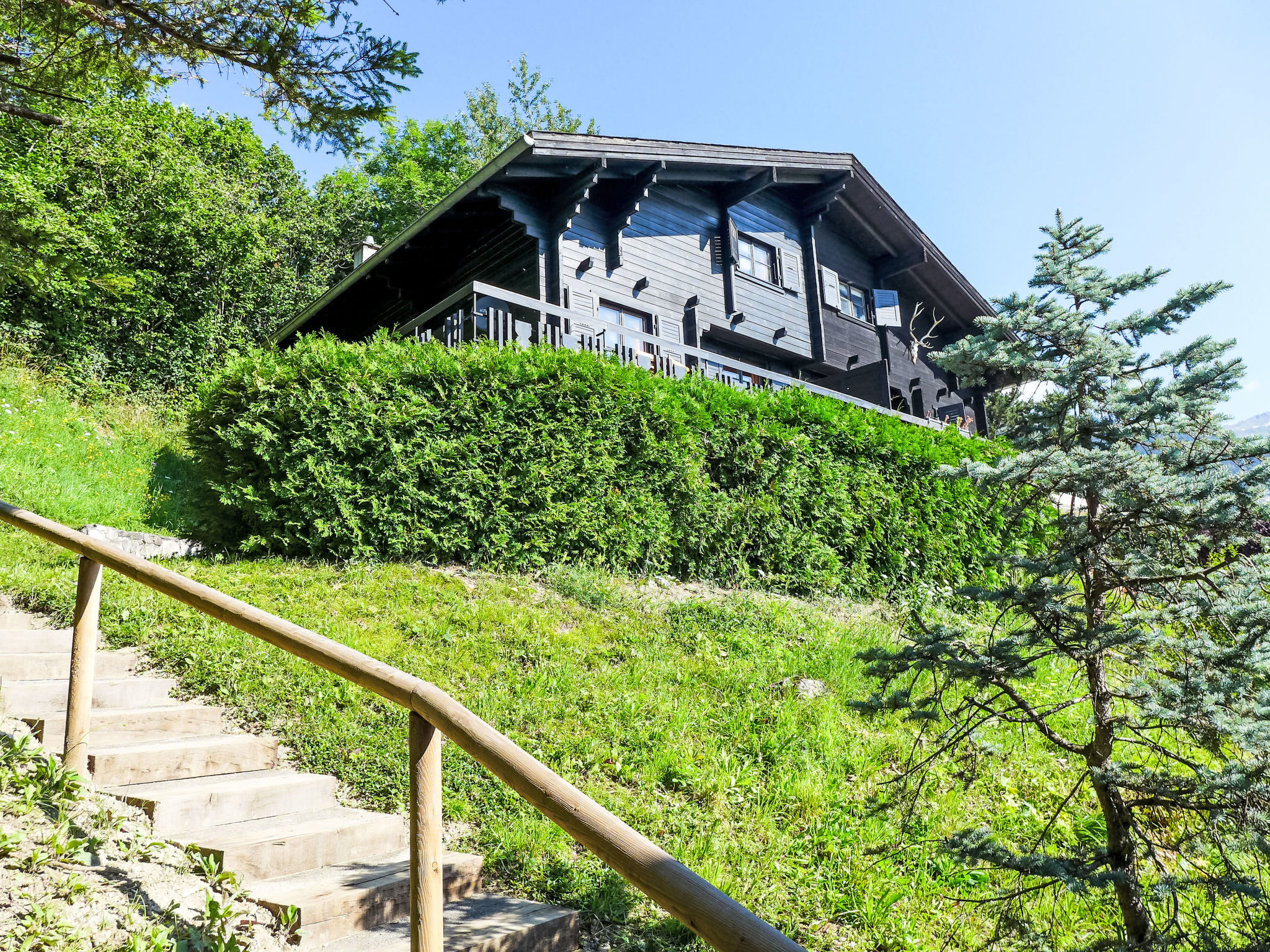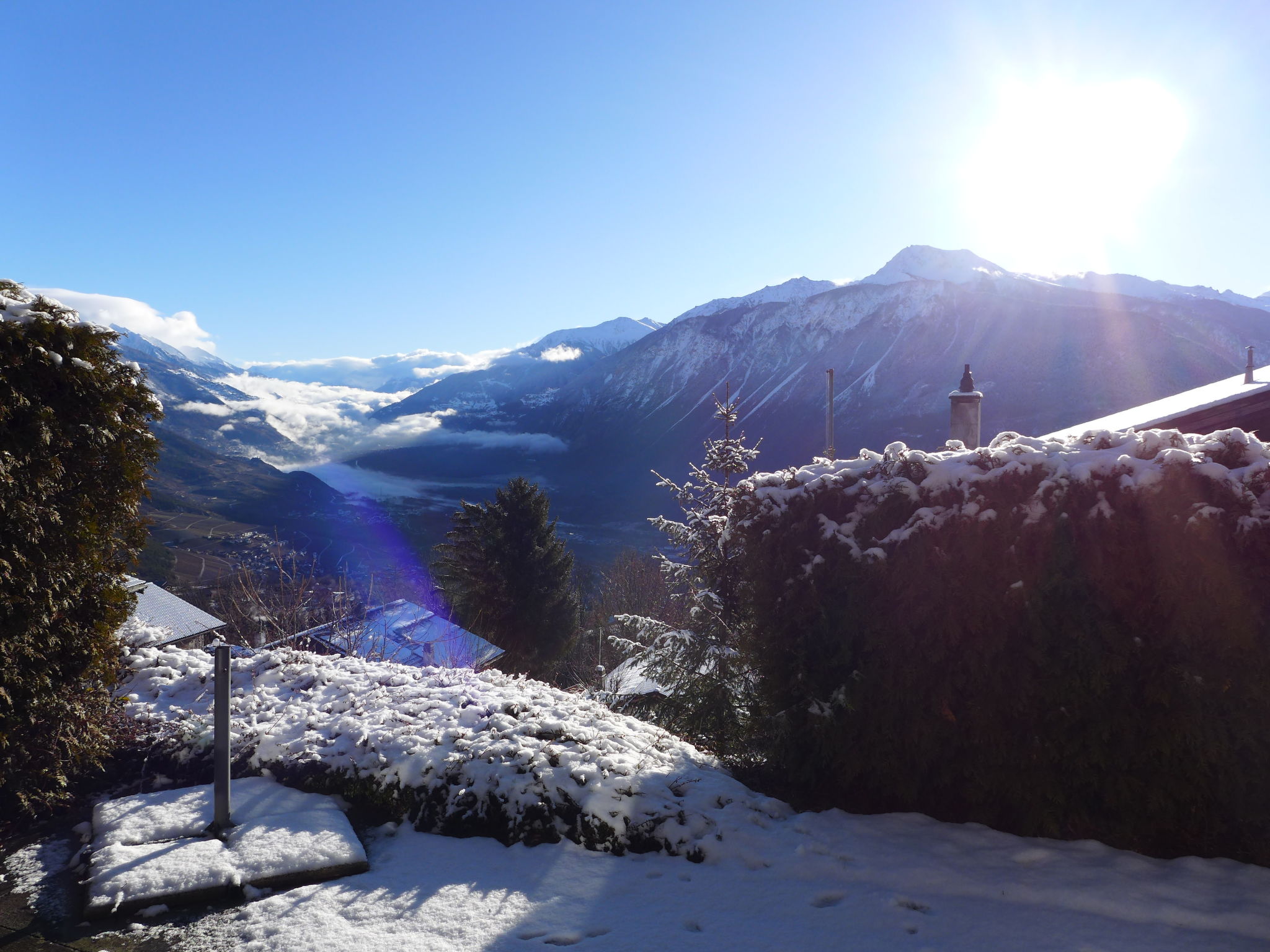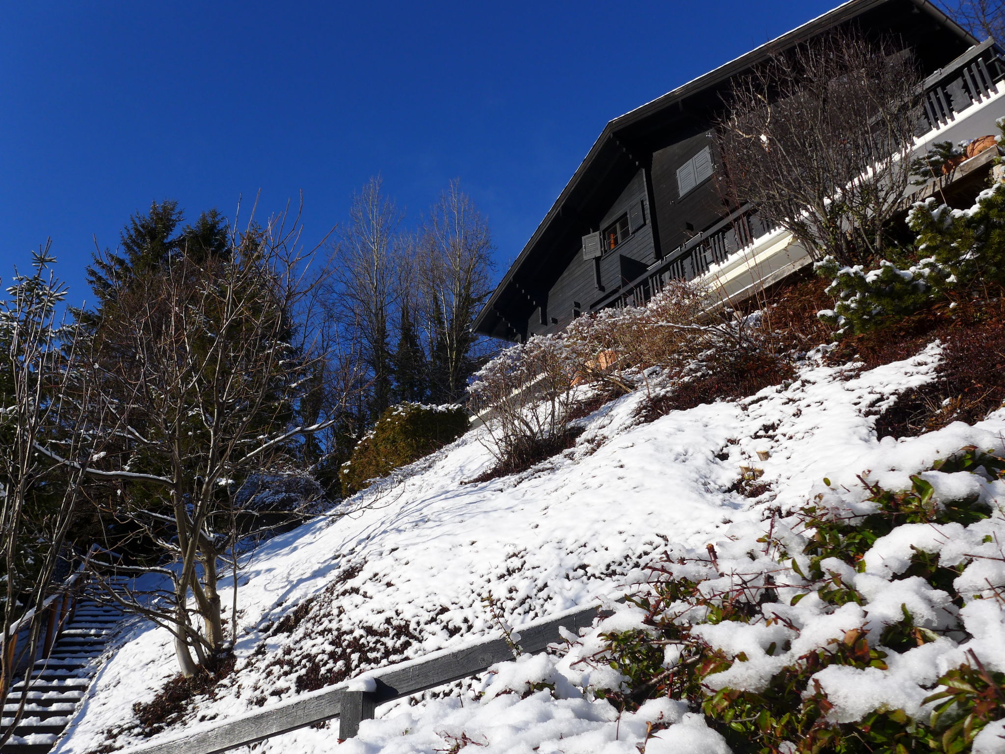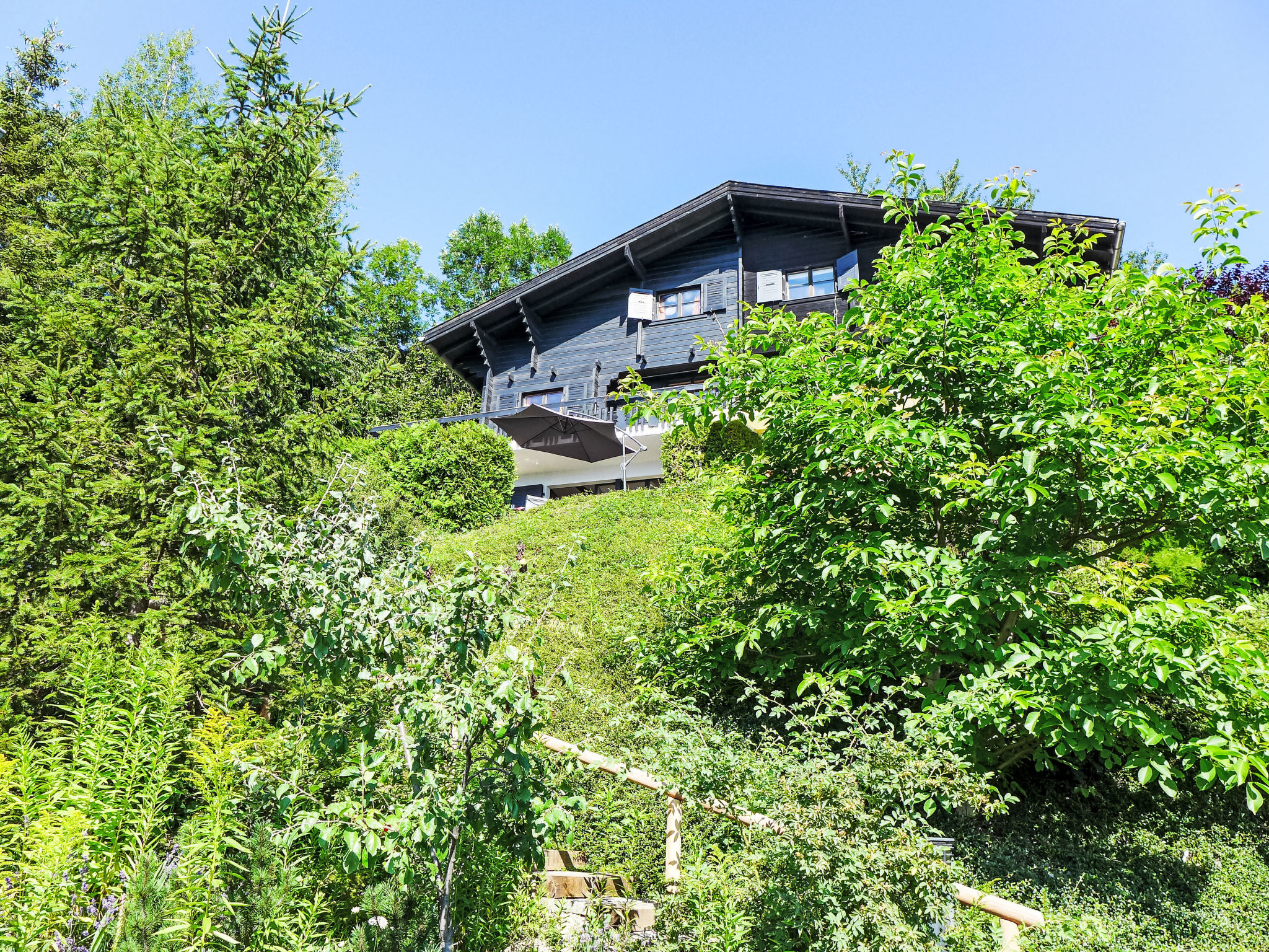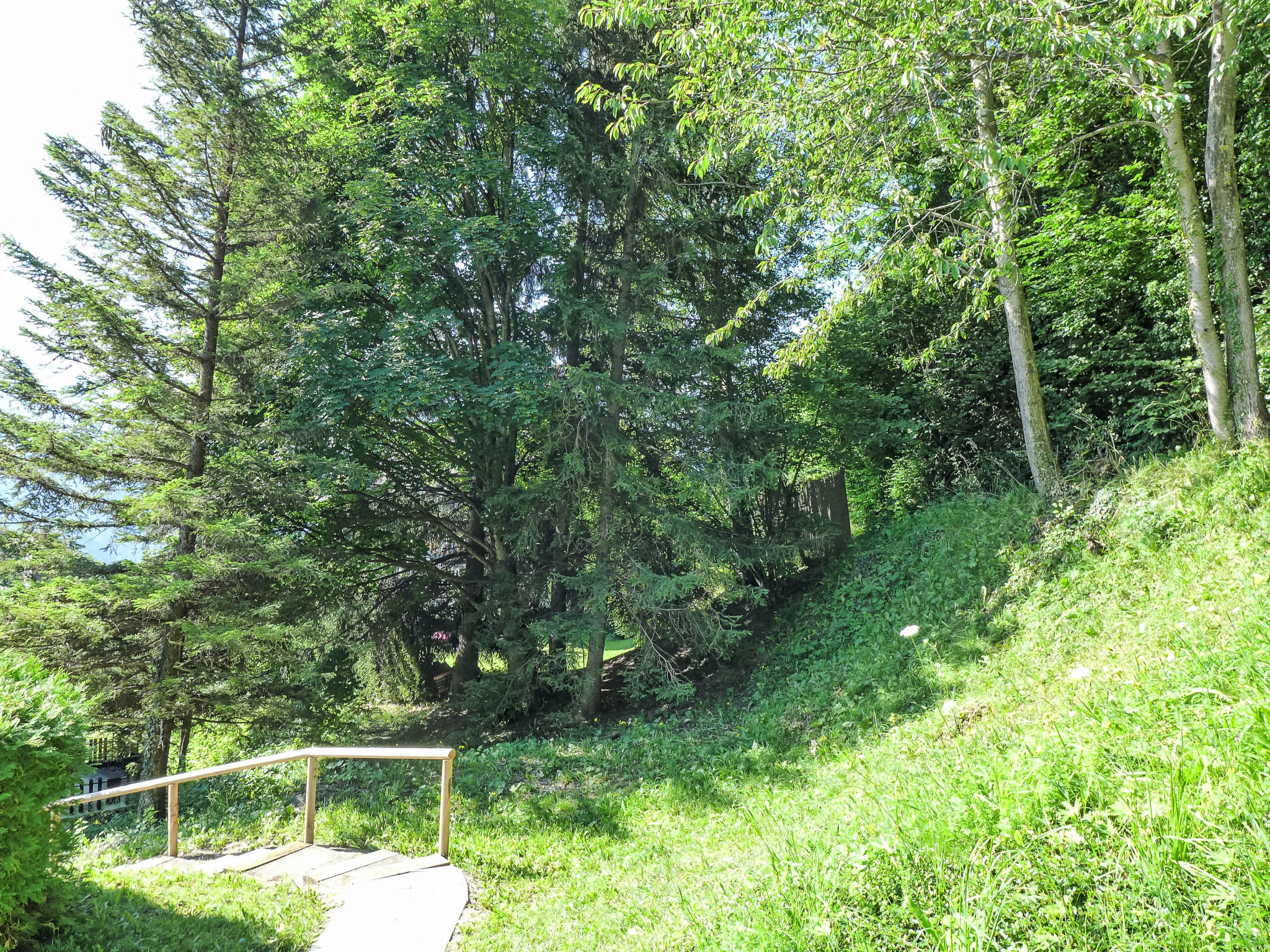 "Sans Nom", metà di una villetta bifamiliare 5 locali 120 m2 su 3 piani, esposizione sud. Oggetto adatto a 4 adulti + 2 bambini. In parte restaurata nel 2024, arredamento confortevole e gradevole: soggiorno/sala da pranzo piccolo con camino, TV (via cavo), radio e CD. Uscita sulla terrazza. Cucina aperta (forno, lavastoviglie, 4 piastre cottura in vetroceramica, tostapane, bollitore elettrico, forno a microonde, congelatore, macchina da caffè elettrica, capsule per la macchina da caffè (Nespresso) extra, set per raclette, set per fondue (chinoise, formaggio)). Piano superiore: 1 camera grande con 1 letto doppio (2 x 90 cm, lunghezza 200 cm). Uscita sul balcone. 1 camera con 1 letto (90 cm, lunghezza 190 cm). Vasca/WC, WC separato. 2. piano superiore: 1 camera mansardata con 2 letti (90 cm, lunghezza 200 cm). 1 camera per bambini mansardata con 1 letto (90 cm, lunghezza 190 cm). Doccia/WC. Balcone 15 m2, esposizione sud e esposizione est, terrazza 20 m2, esposizione sud. Mobili da terrazza, mobili da balcone, barbecue (portatile), sedie a sdraio (1). Bella vista sulle montagne, sulla valle e sul bosco. A disposizione: lavatrice, ferro da stiro, seggiolone, lettino per bimbi fino 2 anni, asciugacapelli. Internet (wifi, gratis). Garage (1 Auto), altezza 195 cm, larghezza 220 cm. Prego notare: casa per non fumatori. 1 animale/cane di piccola taglia consentito.