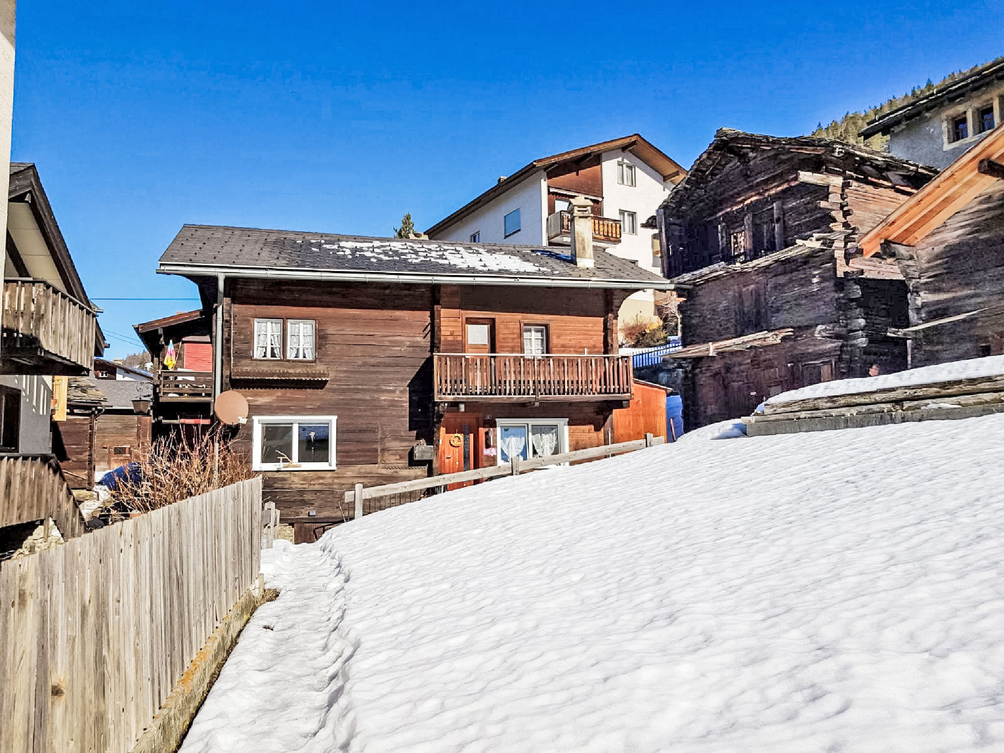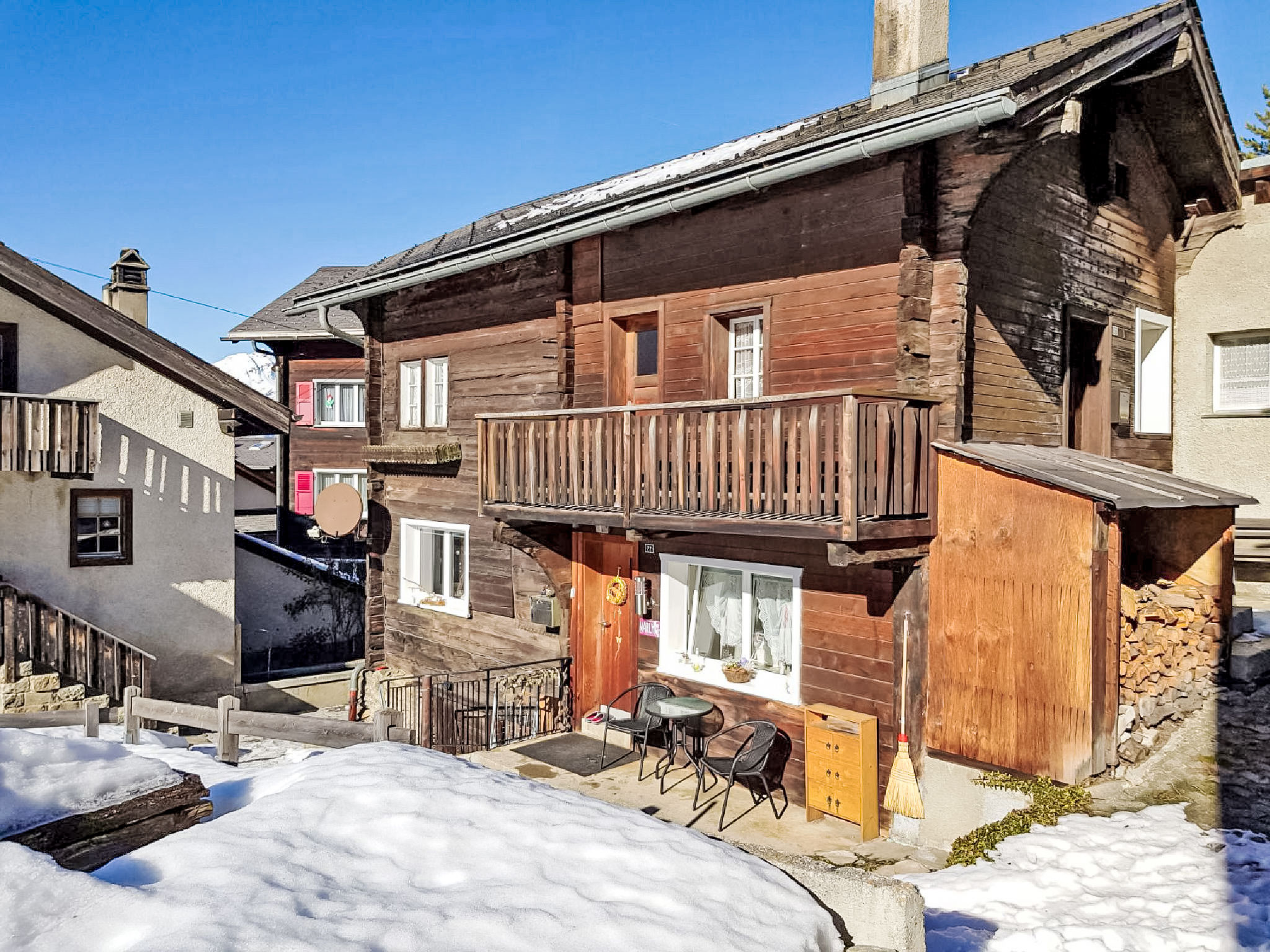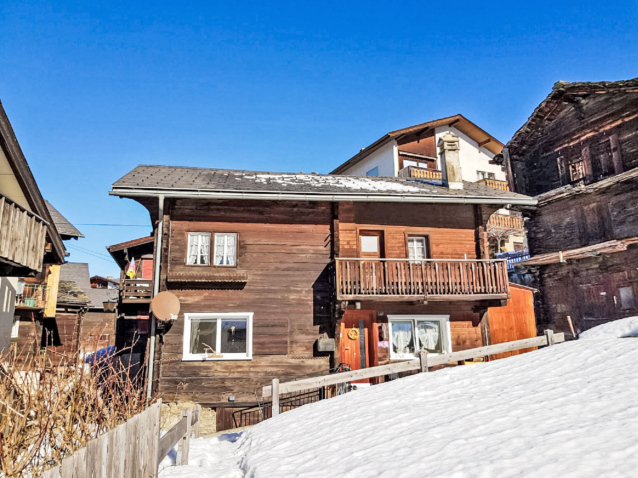 Visperterminen 9 km da Visp: Chalet "Marilyn", 1'330 m s.l.m., accogliente, rustico su 2 piani. Nella località, posizione tranquilla, soleggiata, a 200 m dall'area sciistica. Nella casa: riscaldamento centralizzato. Accesso fino 50 m da alla casa (strada di montagna). 50 m sentiero pedonale fino alla casa. Garage pubblico a 200 m, parcheggio pubblico 100 m extra. Negozio alimentare 300 m, shopping center 10 km, ristorante 200 m, fermata bus 200 m, stazione ferroviaria "Visp" 10 km, piscina 10 km, piscina coperta 10 km. Sciovia, seggiovia, impianti di risalita, piste da sci, scuola di sci, pista per slitte, pattinaggio, parco giochi 200 m. Rinomate località sciistiche: Zermatt 45 km, Saas Fee 40 km.