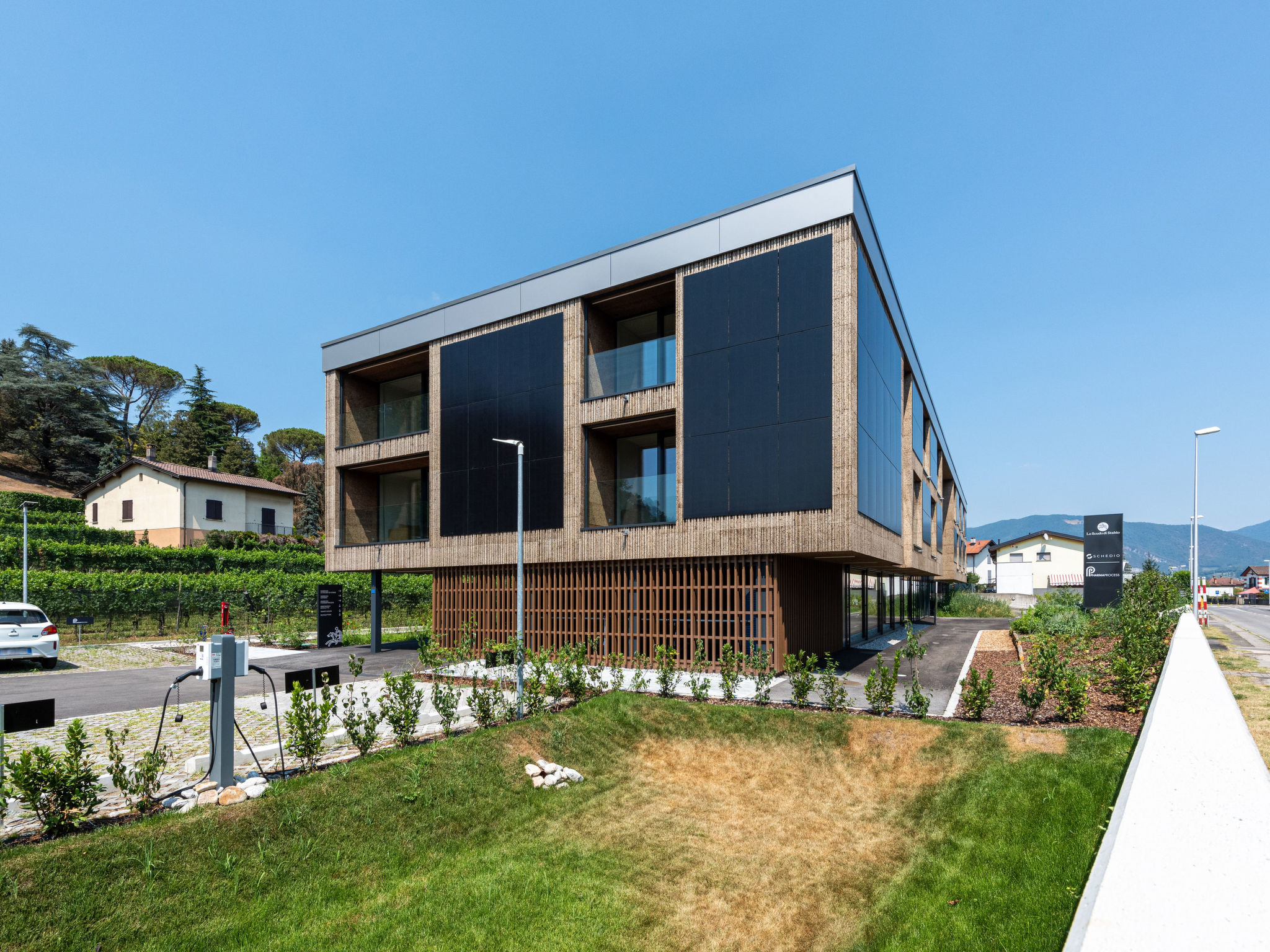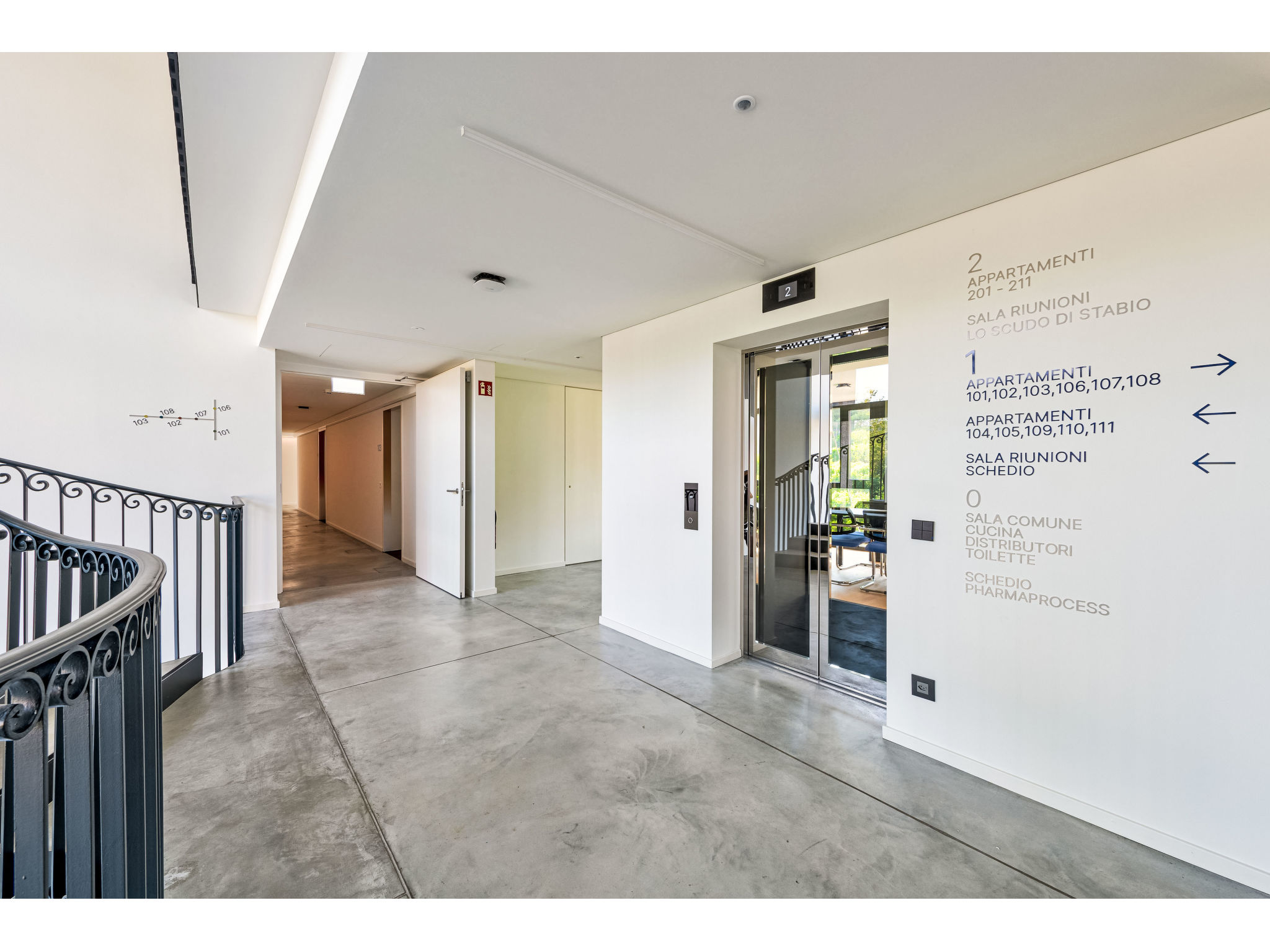 Stabio 20 km da Lugano Centro: Apart-hotel "Lo Scudo di Stabio", 350 m s.l.m., moderno, confortevole su 2 piani, indipendente, costruito nel 2022, circondato da prati e vigne. 15 appartamenti nel residence. Nella località, a 1 km dal centro di Stabio, in una strada principale, esposizione nord-est. In comune: terreno 1'000 m2, grande, bello giardino prato e piante. Nella casa: reception, sala comune con TV, wifi, ascensore, deposito biciclette, riscaldamento centralizzato, climatizzazione. Cambio biancheria giornaliero (ulteriori extra). Cambio asciugamani giornaliero (ulteriori extra). Pulizia dell'appartamento giornaliera su richiesta (extra). Accesso fino alla casa. Parcheggio nella proprietà. Stazione di ricarica elettrica. Supermercato 1 km, bar 550 m, fermata bus 1 m, stazione ferroviaria "Stabio" 1.2 km. Attrazioni nelle vicinanze: Fossilienmuseum Arzo 4.8 km, Chicco d'Oro Kaffee Museum 5 km, Villa Braghenti 8 km, La Vecchia Stazione 8 km, Torre Pezza 9 km, Madonna di San Bernardino 9 km. Laghi famosi: Lago di Lugano 5 km. Sentieri escursionistici: Monte San Giorgio 9 km, Monte Generoso, Valle di Muggio. Esterni: Area picnic, mobili da giardino, giardino. Area comune con lounge/zona TV condivisa, distributori automatici di snack, distributori automatici, set per la preparazione di caffè e tè. Servizi business: Sale conferenze ed eventi. Lo Scudo di Stabio coniuga un'ospitalità flessibile con una sostenibilità costante: 22 appartamenti arredati (35–50 m²), completati da aree comuni come una sala comune di 130 m² e una sala riunioni di 26 m². L'approccio è olisticamente sostenibile: strutture portanti prevalentemente in legno con struttura prefabbricata, materiali isolanti naturali, un tetto verde e impiantistica ad alta efficienza per ridurre il consumo energetico e le emissioni durante l'intero ciclo di vita. Le facciate in sughero a vista integrano moduli fotovoltaici sui lati sud e ovest, coniugando la produzione di energia con l'identità architettonica. La mobilità dolce è supportata da stazioni di ricarica per auto elettriche, una stazione di servizio per biciclette e un deposito biciclette sicuro al piano terra. L'insieme è il primo edificio in Ticino ad essere certificato SNBS, ha ottenuto la certificazione Minergie-P-ECO (n. TI-011-P-ECO) e il marchio Swisstainable - Livello II, a testimonianza della sua qualità ecologica, sociale ed economica. È stato inoltre selezionato/riconosciuto agli Active House Awards 2022, sottolineando l'attenzione al comfort degli utenti (luce, aria, benessere) e all'efficienza energetica.