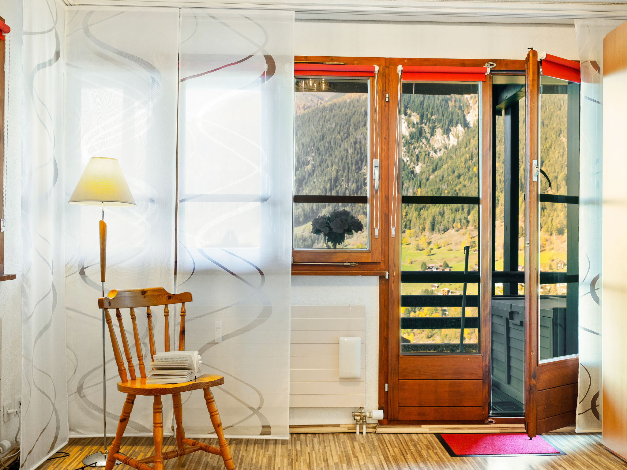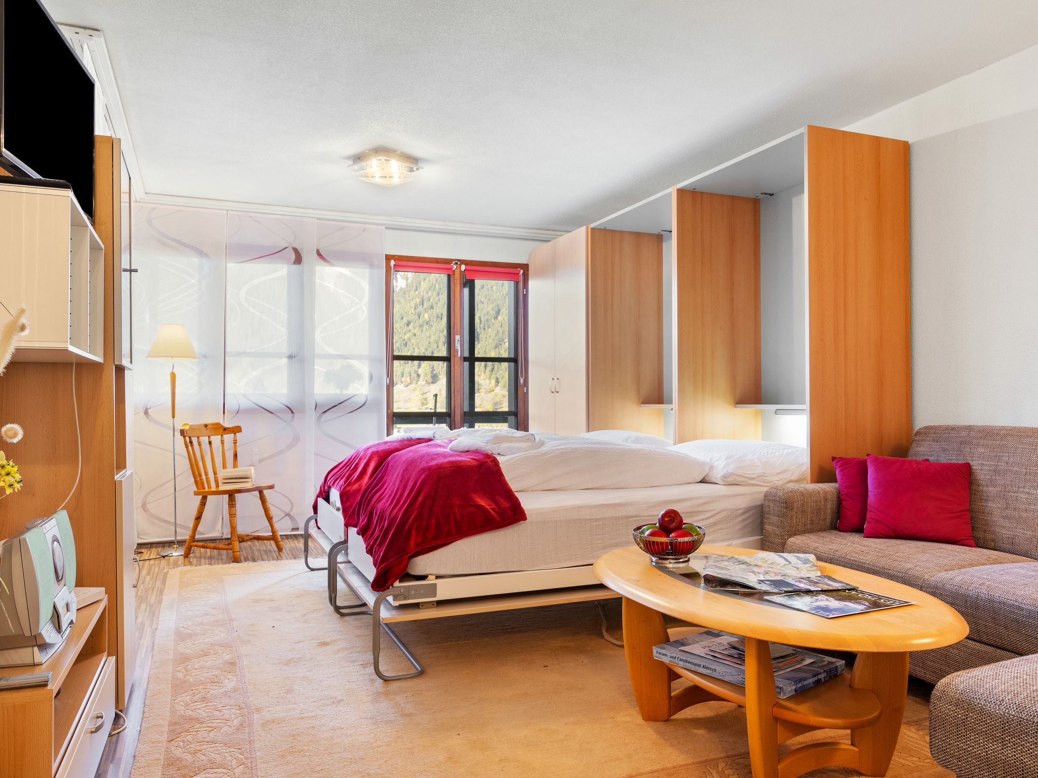 "Aragon B47" monolocale 38 m2 al 1. piano. In parte restaurato, arredamento accogliente: soggiorno/sala da pranzo con 2 letti ad armadio e TV (via cavo) (schermo piatto), radio. Uscita sul balcone. Cucina aperta (forno, lavastoviglie, 4 piastre cottura in vetroceramica, forno a microonde). Vasca/WC. Balcone. Mobili da balcone. Splendida vista sulle montagne, sulla valle e sul paesaggio. A disposizione: lettino per bimbi (extra). Internet (wifi, gratis). Garage nr. 14. Prego notare: appartamento per non fumatori.