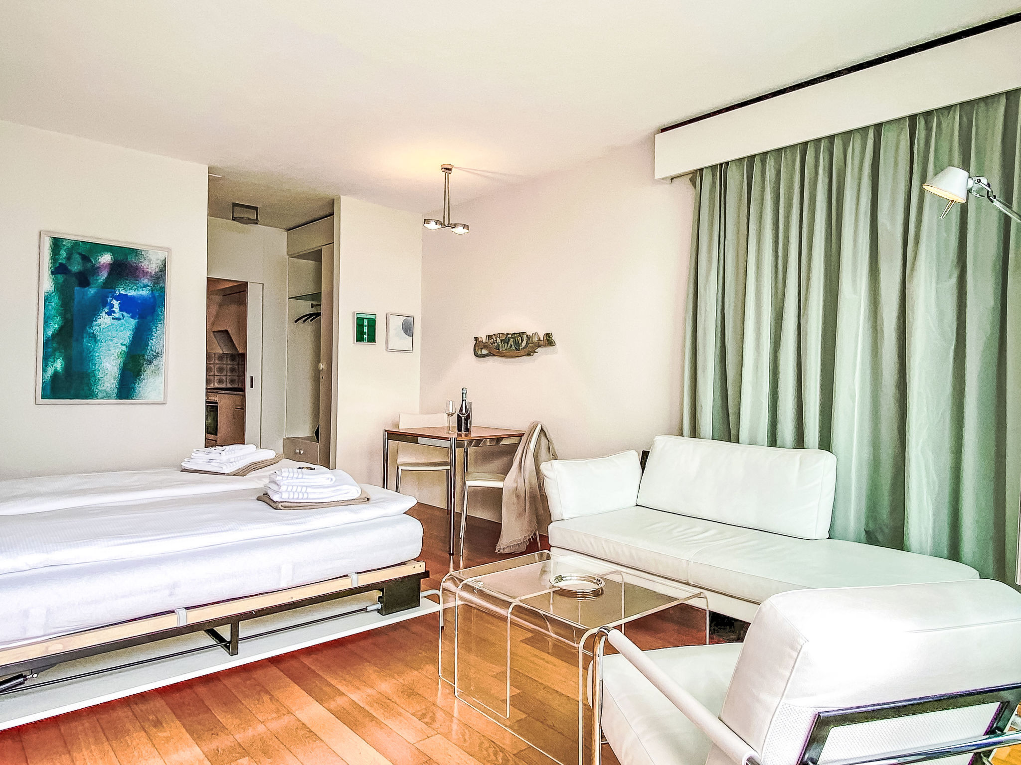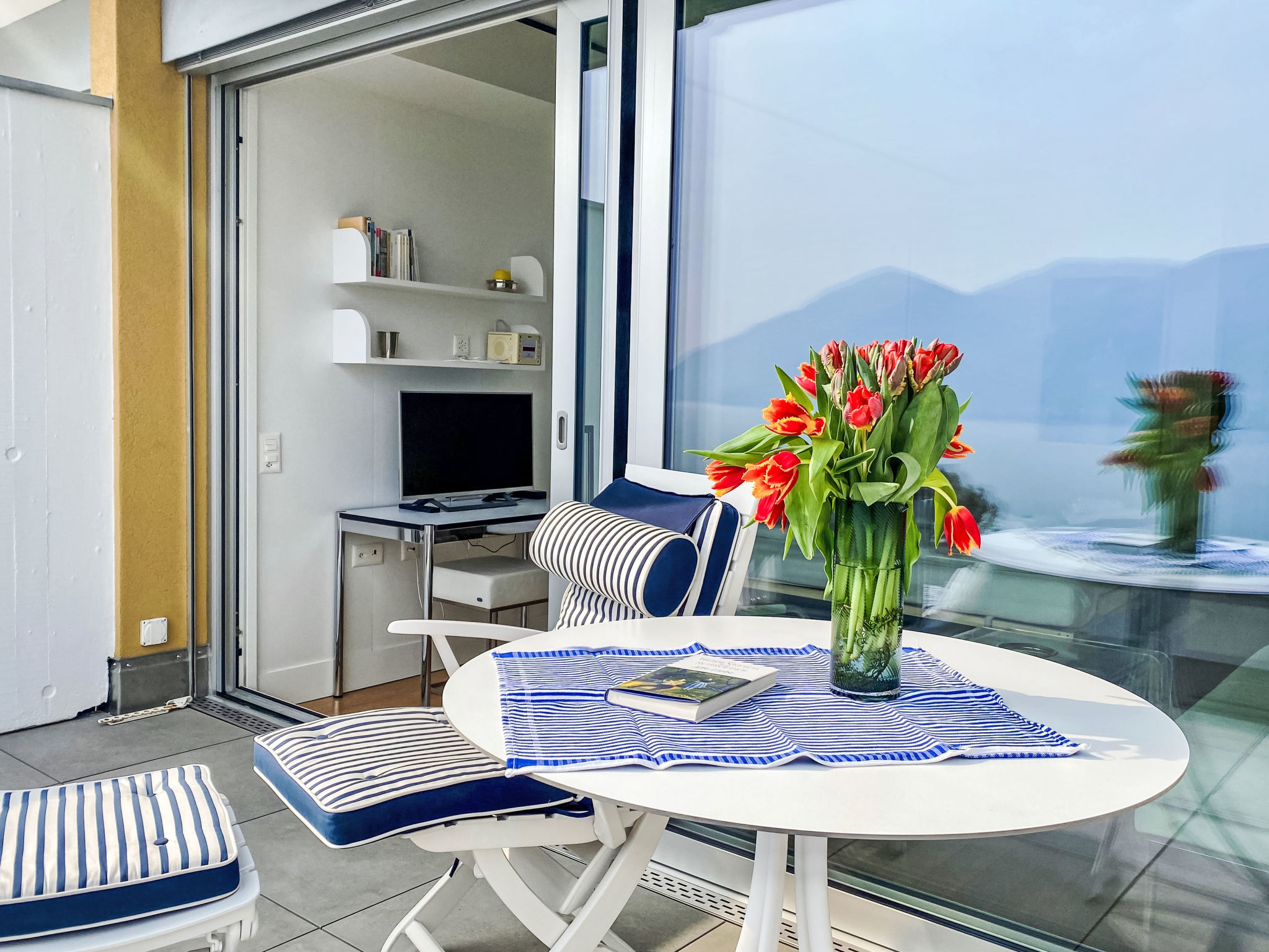 "Lakeview App. 603" monolocale 36 m2 al 6. piano, esposizione sud-est. Luminoso, arredamento confortevole e di buon gusto: soggiorno/sala da pranzo aperto con finestra panoramica con 1 letto doppio ad armadio (2 x 90 cm, lunghezza 200 cm), tavolo da pranzo, TV (satellite), schermo piatto, radio e CD. Uscita sulla terrazza. Angolo cottura nell'ingresso (forno, 4 piastre cottura in vetroceramica). Doccia/WC. Riscaldamento. Terrazza in parte coperta, esposizione sud e esposizione est. Mobili da terrazza. Magnifica vista panoramica sul lago, sulle montagne e sul paesaggio. A disposizione: asciugacapelli. Parcheggio nr. 25. Prego notare: appartamento per non fumatori. Bagno recentemente rinnovato. NL-00011471