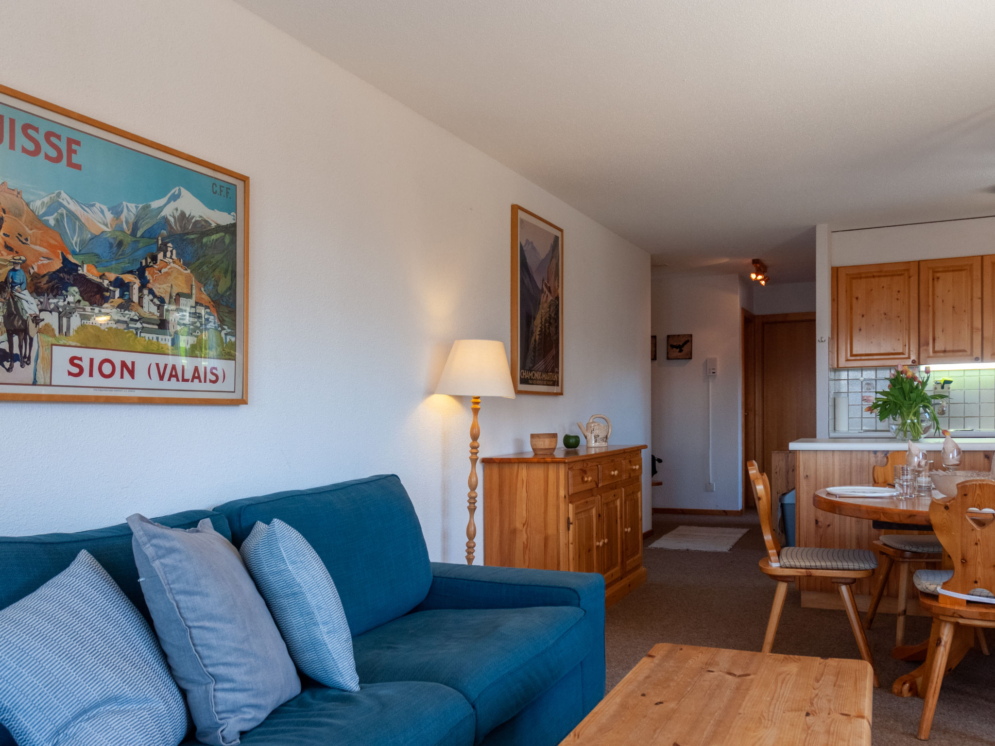 Apt. di 4 locali 80 m2. Arredamento confortevole e gradevole: soggiorno/sala da pranzo con camino (solo con funzione decorativa), TV (via cavo). Uscita sul balcone. 2 camere, ogni camera con 1 letto alla francese (2 x 90 cm, lunghezza 200 cm). 1 camera con 2 letti (90 cm, lunghezza 200 cm), vasca/WC. Cucina aperta (forno, lavastoviglie, 4 piastre cottura in vetroceramica, tostapane, bollitore elettrico, forno a microonde, macchina da caffè elettrica, set per raclette, set per fondue (formaggio)). Doccia/WC. 2 balconi, esposizione nord-ovest e esposizione sud. Magnifica vista panoramica sulle montagne e sulla valle. A disposizione: Internet (wifi, gratis). Prego notare: appartamento per non fumatori, senza parcheggio.