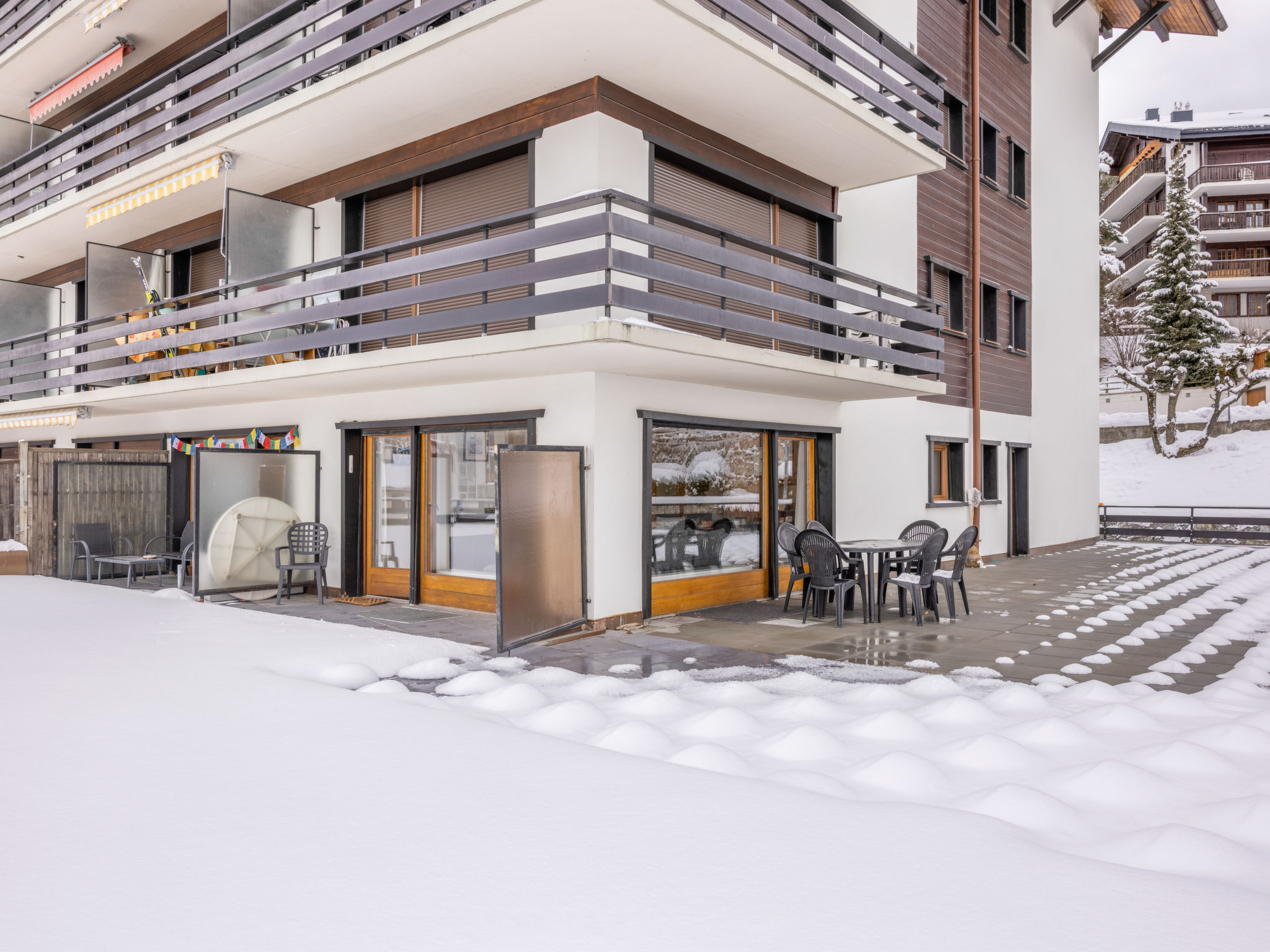 "Cerisiers Hrez", apt. di 3 locali 70 m2, al pianterreno. Soggiorno/sala da pranzo con camino (solo con funzione decorativa), TV (via cavo) (schermo piatto). 1 camera con 2 letti (90 cm, lunghezza 190 cm). 1 camera piccola con 1 x 2 letti a castello (90 cm, lunghezza 180 cm), 1 letto estraibile (2 pers. 2 x 90 cm, lunghezza 190 cm). Cucina (3 punti cottura, forno, forno a microonde, macchina da caffè elettrica, capsule per la macchina da caffè (Nespresso), set per raclette, set per fondue (formaggio)). Vasca/WC, WC separato. Grande terrazza, esposizione sud-est. Mobili da terrazza. Vista sulle montagne. A disposizione: Internet (wifi, gratis). Prego notare: appartamento per non fumatori, senza parcheggio.