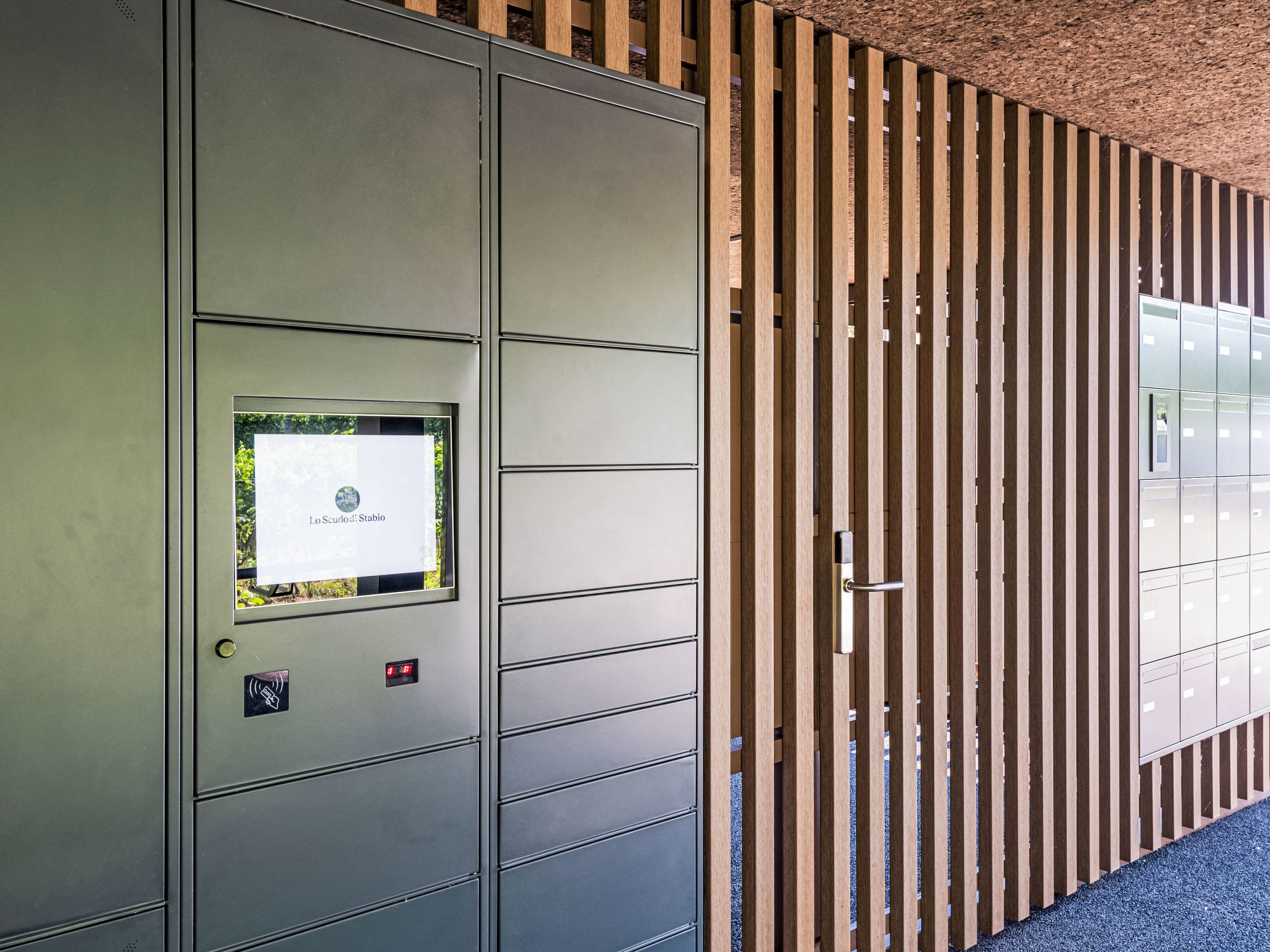 Stabio 20 km da Lugano Centro: Apart-hotel "Lo Scudo di Stabio", 350 m s.l.m., moderno, confortevole su 2 piani, indipendente, costruito nel 2022, circondato da prati e vigne. 15 appartamenti nel residence. Nella località, a 1 km dal centro di Stabio, in una strada principale, esposizione nord-est. In comune: terreno 1'000 m2, grande, bello giardino prato e piante. Nella casa: reception, sala comune con TV, wifi, ascensore, deposito biciclette, riscaldamento centralizzato, climatizzazione. Cambio biancheria giornaliero (ulteriori extra). Cambio asciugamani giornaliero (ulteriori extra). Pulizia dell'appartamento giornaliera su richiesta (extra). Accesso fino alla casa. Parcheggio nella proprietà. Stazione di ricarica elettrica. Supermercato 1 km, bar 550 m, fermata bus 1 m, stazione ferroviaria "Stabio" 1.2 km. Attrazioni nelle vicinanze: Fossilienmuseum Arzo 4.8 km, Chicco d'Oro Kaffee Museum 5 km, Villa Braghenti 8 km, La Vecchia Stazione 8 km, Torre Pezza 9 km, Madonna di San Bernardino 9 km. Laghi famosi: Lago di Lugano 5 km. Sentieri escursionistici: Monte San Giorgio 9 km, Monte Generoso, Valle di Muggio. Esterni: Area picnic, mobili da giardino, giardino. Area comune con lounge/zona TV condivisa, distributori automatici di snack, distributori automatici, set per la preparazione di caffè e tè. Servizi business: Sale conferenze ed eventi. Lo Scudo di Stabio coniuga un'ospitalità flessibile con una sostenibilità costante: 22 appartamenti arredati (35–50 m²), completati da aree comuni come una sala comune di 130 m² e una sala riunioni di 26 m². L'approccio è olisticamente sostenibile: strutture portanti prevalentemente in legno con struttura prefabbricata, materiali isolanti naturali, un tetto verde e impiantistica ad alta efficienza per ridurre il consumo energetico e le emissioni durante l'intero ciclo di vita. Le facciate in sughero a vista integrano moduli fotovoltaici sui lati sud e ovest, coniugando la produzione di energia con l'identità architettonica. La mobilità dolce è supportata da stazioni di ricarica per auto elettriche, una stazione di servizio per biciclette e un deposito biciclette sicuro al piano terra. L'insieme è il primo edificio in Ticino ad essere certificato SNBS, ha ottenuto la certificazione Minergie-P-ECO (n. TI-011-P-ECO) e il marchio Swisstainable - Livello II, a testimonianza della sua qualità ecologica, sociale ed economica. È stato inoltre selezionato/riconosciuto agli Active House Awards 2022, sottolineando l'attenzione al comfort degli utenti (luce, aria, benessere) e all'efficienza energetica.