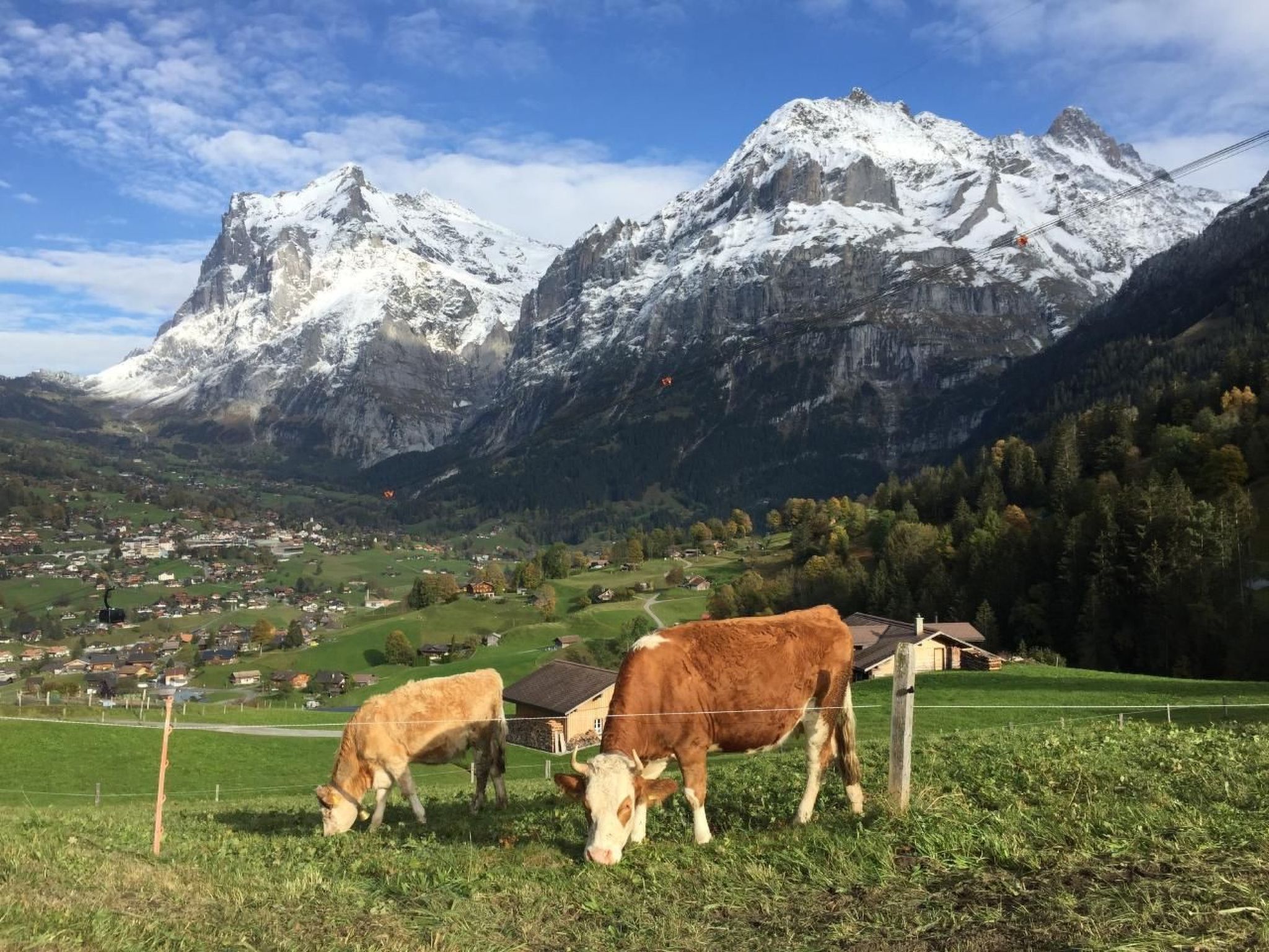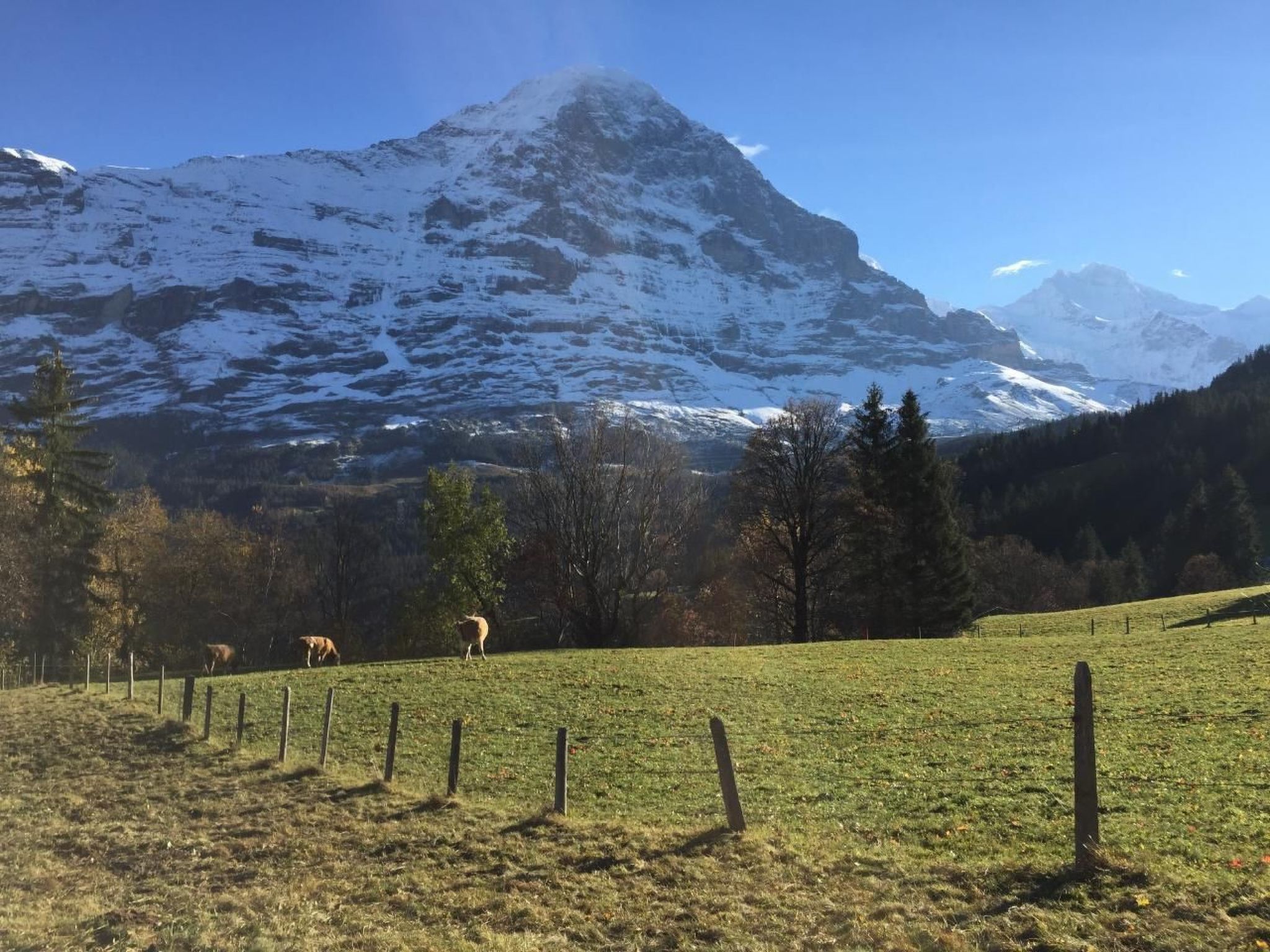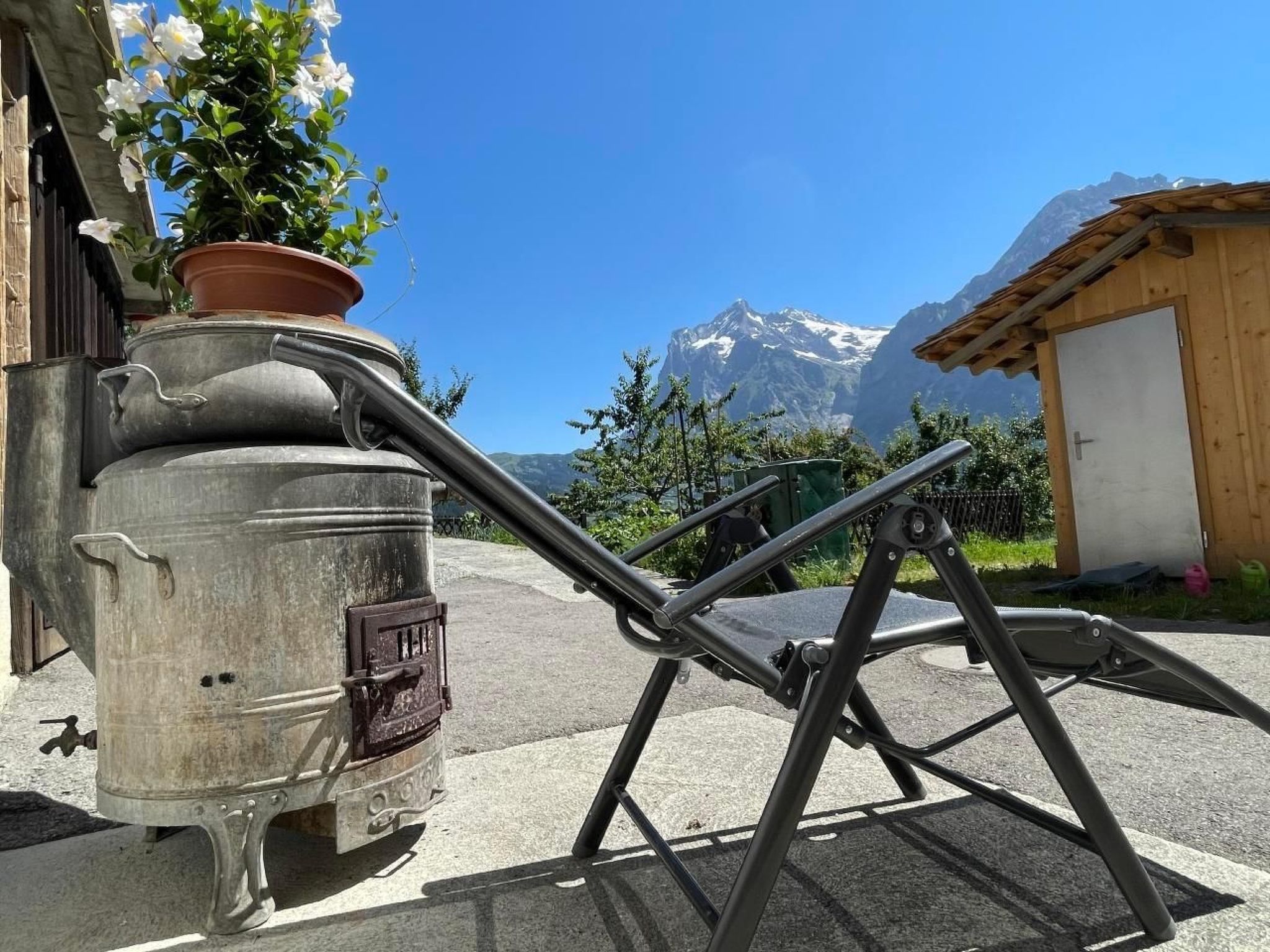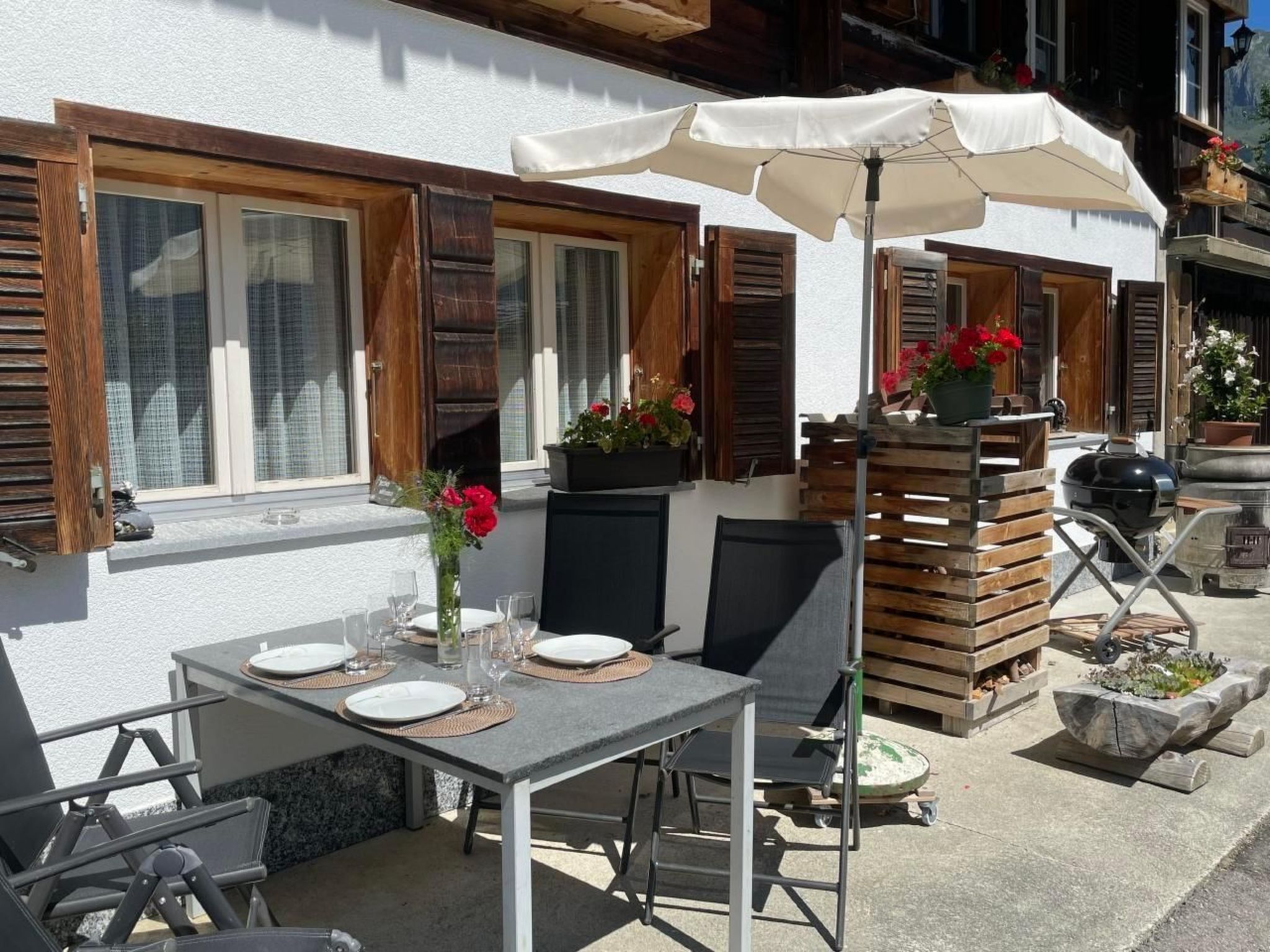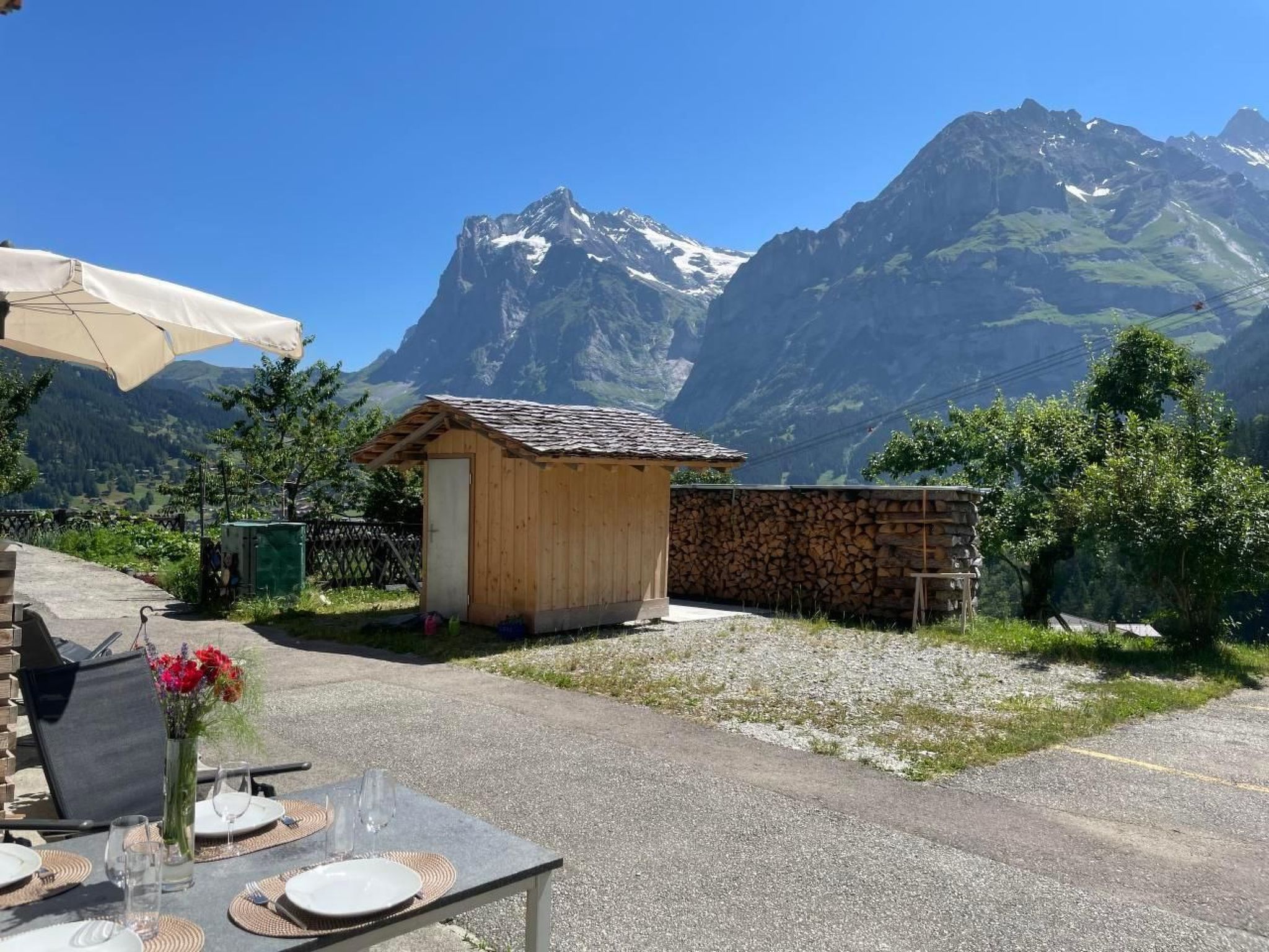 Away from mass tourism and the hustle and bustle, we rent a 2-room flat of 50m2 on the ground floor of our home. In addition to the double bed, it is possible to accommodate two more guests on a comfortable sofa bed (in the living room). The flat has a well-equipped kitchen, bathroom/WC, satellite TV/radio and Wifi.Enjoy one of your three outdoor seating areas with a view of Grindelwald and the impressive mountain scenery.We provide our guests with bed linen and kitchen towels, washing-up liquid, toilet paper and hand soap.Dogs are welcome if they are well behaved. Please note: In winter, a four-wheel drive car or snow chains are required to reach our chalet safely. Please inform yourself about the current road conditions before your arrival! The visitor's tax is not included in the price. With the guest card (visitor's tax) you have free travel on the public bus in Grindelwald and receive various other reductions in Grindelwald.Excursions: you will find lots of useful information on the Grindelwald website.Other living room equipment (living room 1): Lounge table, large TV screen, shelf, information folderOther bedroom furnishings (bedroom1): The bedroom has a wardrobe, bedside table shelves, reading lamps, a large mirror, two chairs and a small wardrobe. We are happy to provide a cot on request.Other kitchen equipment (kitchen1): Fondue and raclette utensils are available, coffee machine is a Néspresseo. We have some capsules in stock, but you are also welcome to bring your own.Sports facilities in the surrounding area: mountaineering, ice skating, golf course, climbing, mountain biking, paragliding, cycling, rafting, tobogganing, alpine skiing, cross-country skiing, tennis. 2694207