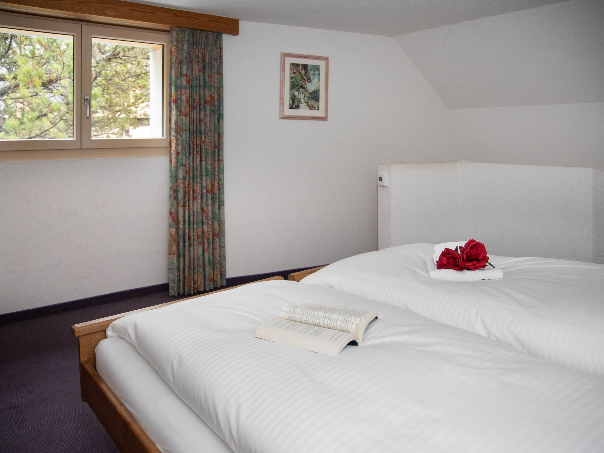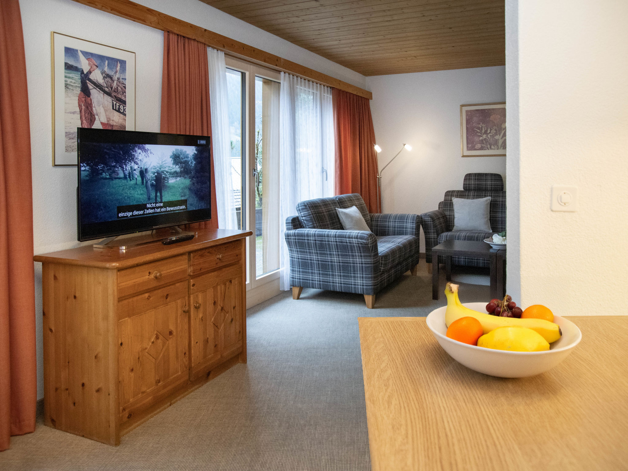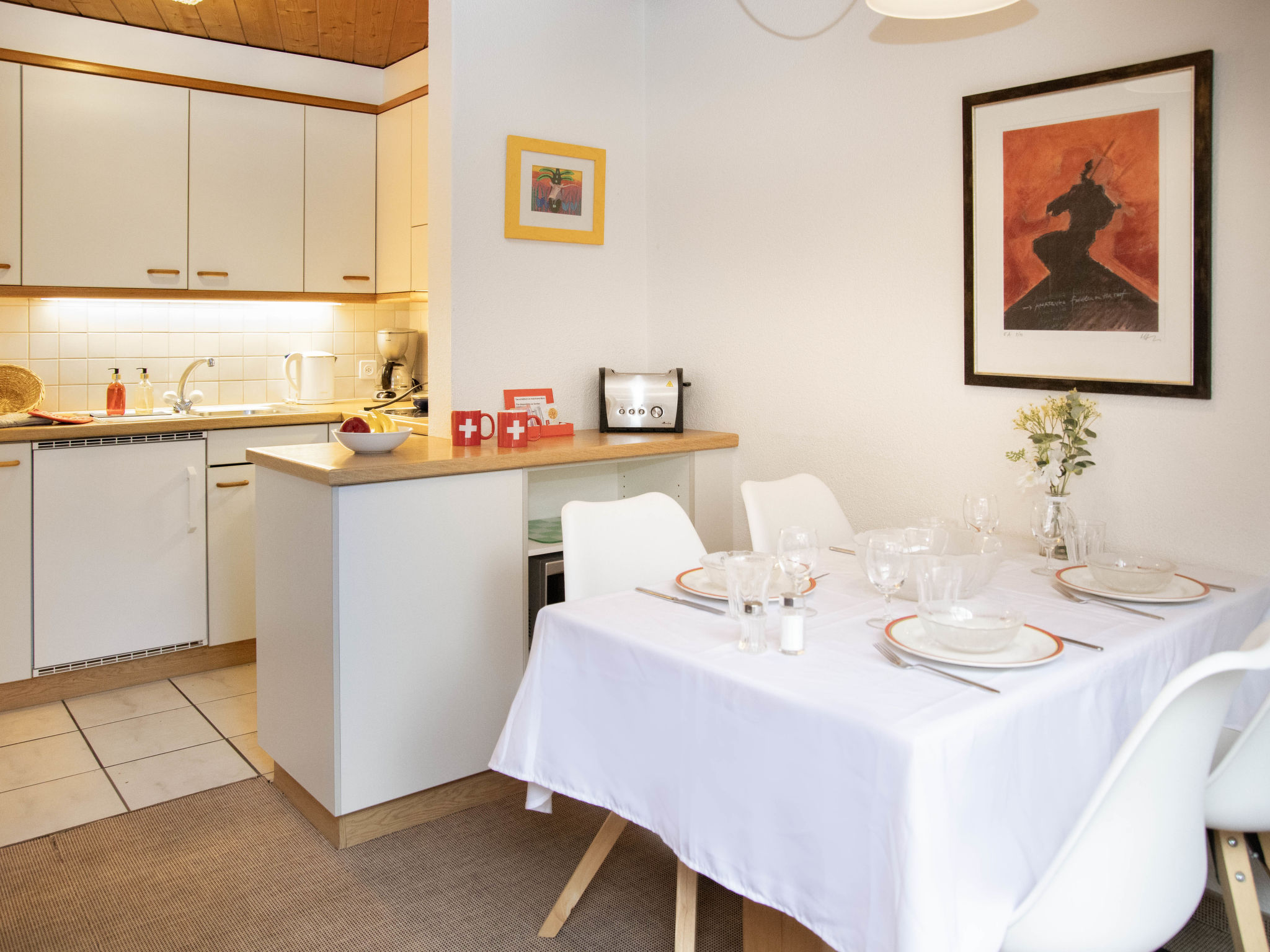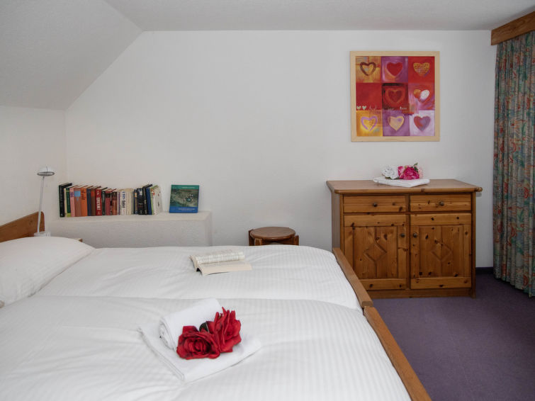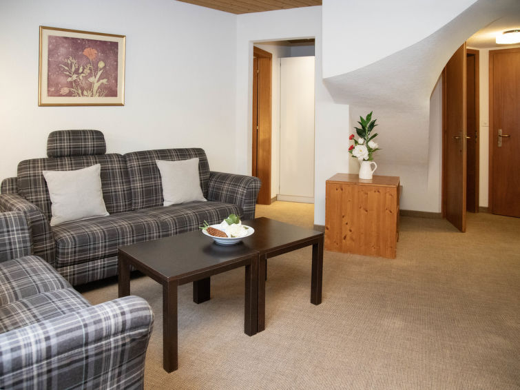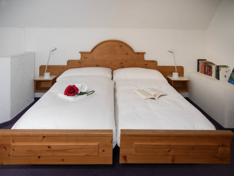 Apt. di 3 locali 62 m2 su 2 piani al 1. piano, esposizione est. Soggiorno/sala da pranzo con TV (via cavo) (schermo piatto). 1 camera matrimoniale. Cucina aperta (forno, 4 piastre cottura in vetroceramica, tostapane, bollitore elettrico, macchina da caffè elettrica, capsule per la macchina da caffè (Nespresso) extra). Vasca/WC. Piano superiore: 1 camera matrimoniale. Terrazza, esposizione est. Mobili da terrazza. Vista sulle montagne. A disposizione: asciugacapelli. Internet (wifi, gratis). Prego notare: appartamento per non fumatori. Massimo 1 animale/cane consentito. Alla reception è possibile prendere in prestito un set per fonduta (carne o formaggio) e un forno per raclette.