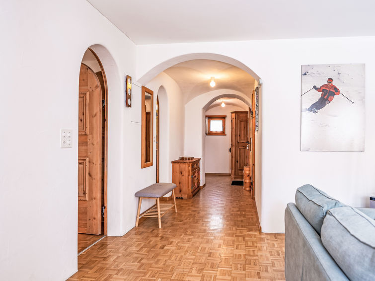 "Chesa Mezzaun", apt. di 3 locali 98 m2, al pianterreno. Arredamento molto confortevole e gradevole: soggiorno/sala da pranzo con camino e TV. Uscita sul balcone, esposizione sud. 1 camera matrimoniale con 1 letto alla francese (1 x 160 cm, lunghezza 195 cm). 1 camera matrimoniale con 1 letto alla francese (1 x 160 cm, lunghezza 190 cm). Cucina aperta (4 punti cottura, forno, lavastoviglie, tostapane, bollitore elettrico, congelatore, macchina da caffè elettrica, capsule per la macchina da caffè (Nespresso) extra, set per raclette, set per fondue (formaggio)) con angolo pranzo. Vasca/bidet/WC, WC separato. Riscaldamento. Mobili da balcone. Laterale, sulle montagne e sulla località. A disposizione: asciugacapelli. Internet (wifi, gratis). Garage nr. 48, altezza 205 cm, larghezza 200 cm. Prego notare: appartamento per non fumatori. Massimo 1 animale/cane consentito.