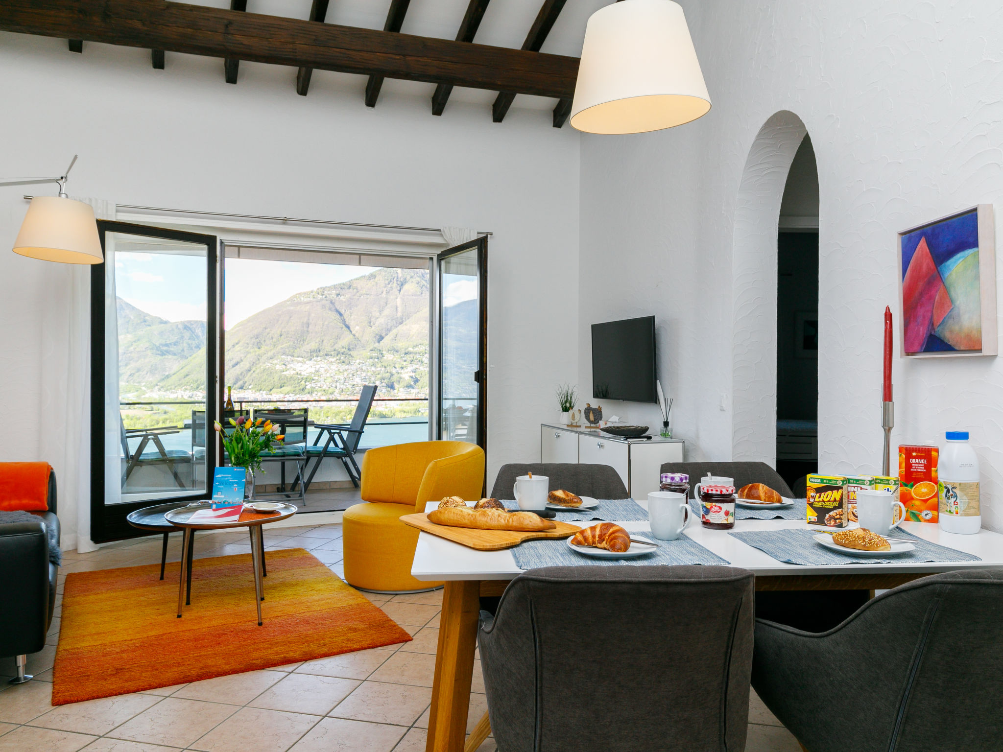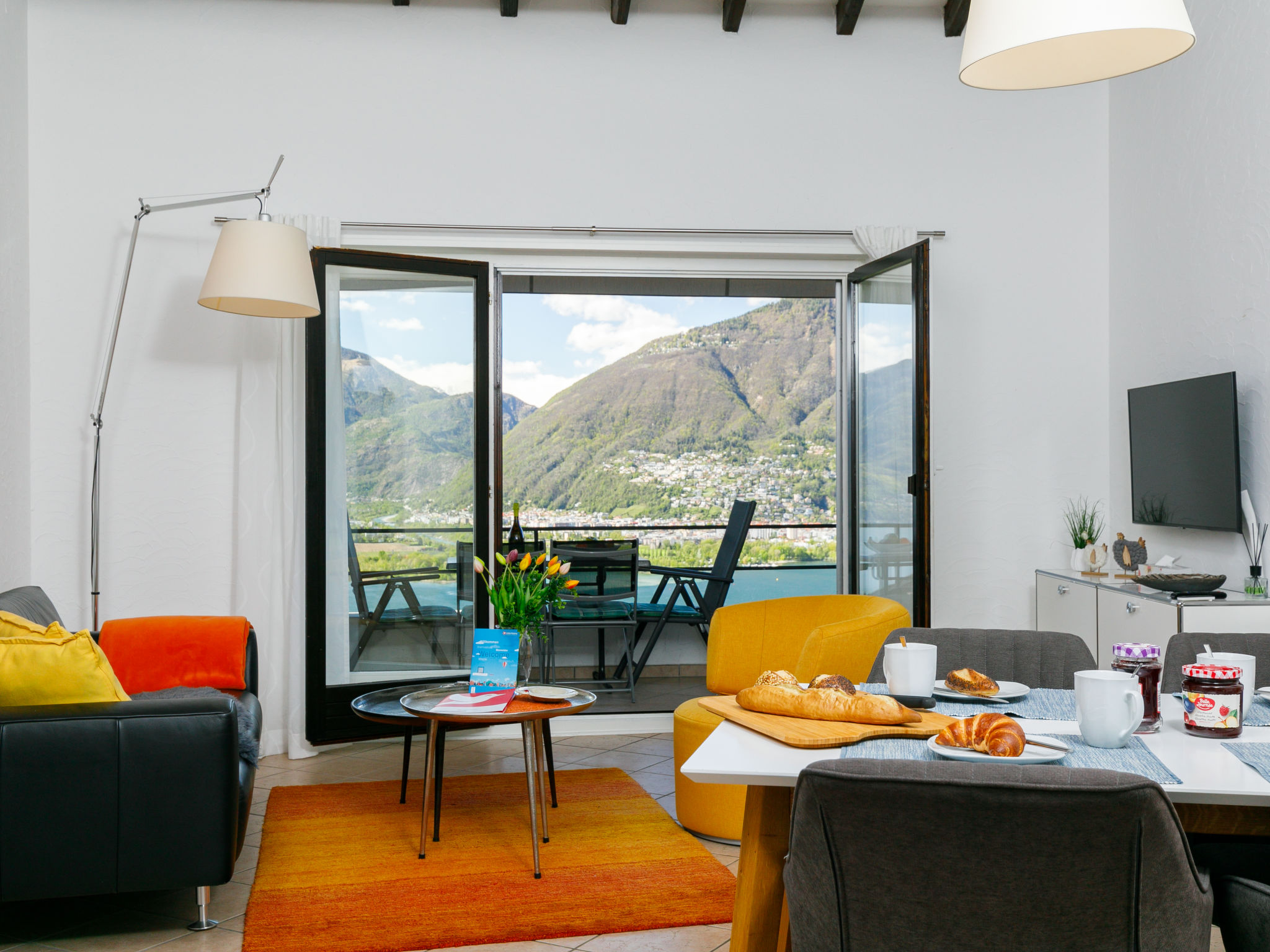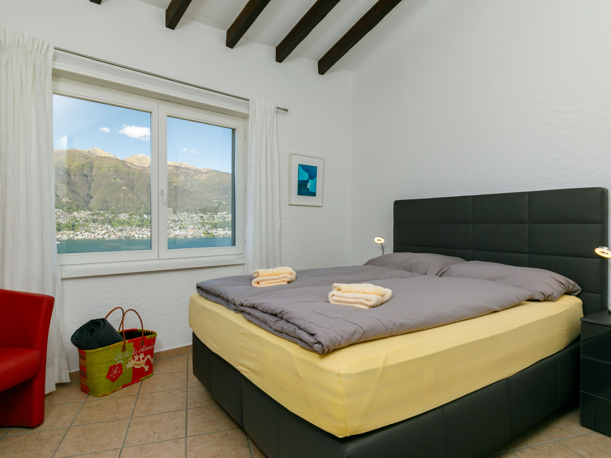 "Residenza Miralago Apt. A5", apt. di 3 locali 66 m2 al 1. piano, esposizione sud. Oggetto adatto a 2 adulti + 1 bambino. Spazioso e luminoso, completamente restaurato nel 2019, arredamento di buon gusto e accogliente: soggiorno/sala da pranzo aperto con tavolo da pranzo e TV (satellite) (schermo piatto), radio e CD. Uscita sul balcone. 1 camera matrimoniale con 1 letto doppio (160 cm, lunghezza 200 cm). Uscita sul balcone. 1 camera per bambini con 1 letto (90 cm, lunghezza 200 cm). Cucina aperta nell'ingresso (forno, lavastoviglie, 4 piastre ad induzione, macchina da caffè elettrica, capsule per la macchina da caffè (Nespresso) extra). Doccia/WC. Riscaldamento. Balcone. Mobili da balcone. Magnifica vista panoramica sul lago, sulle montagne e sul paesaggio. Prego notare: appartamento per non fumatori. NL-00003540