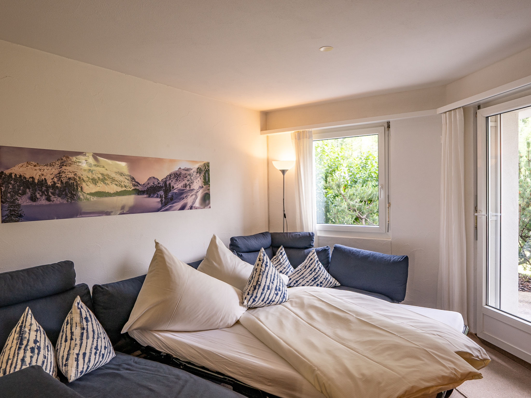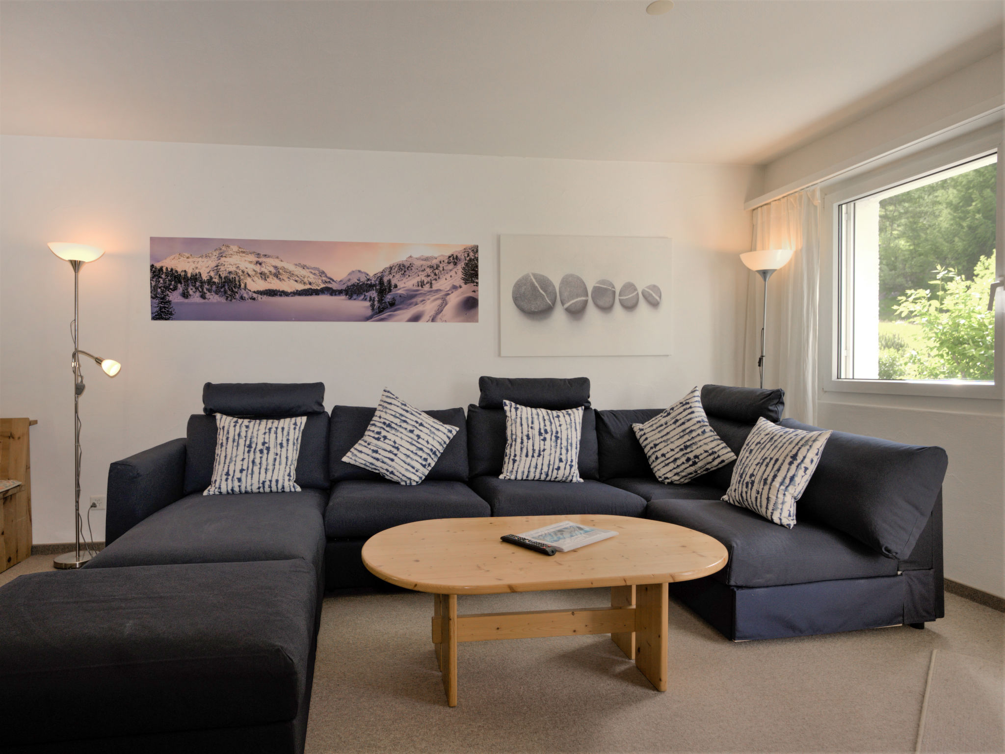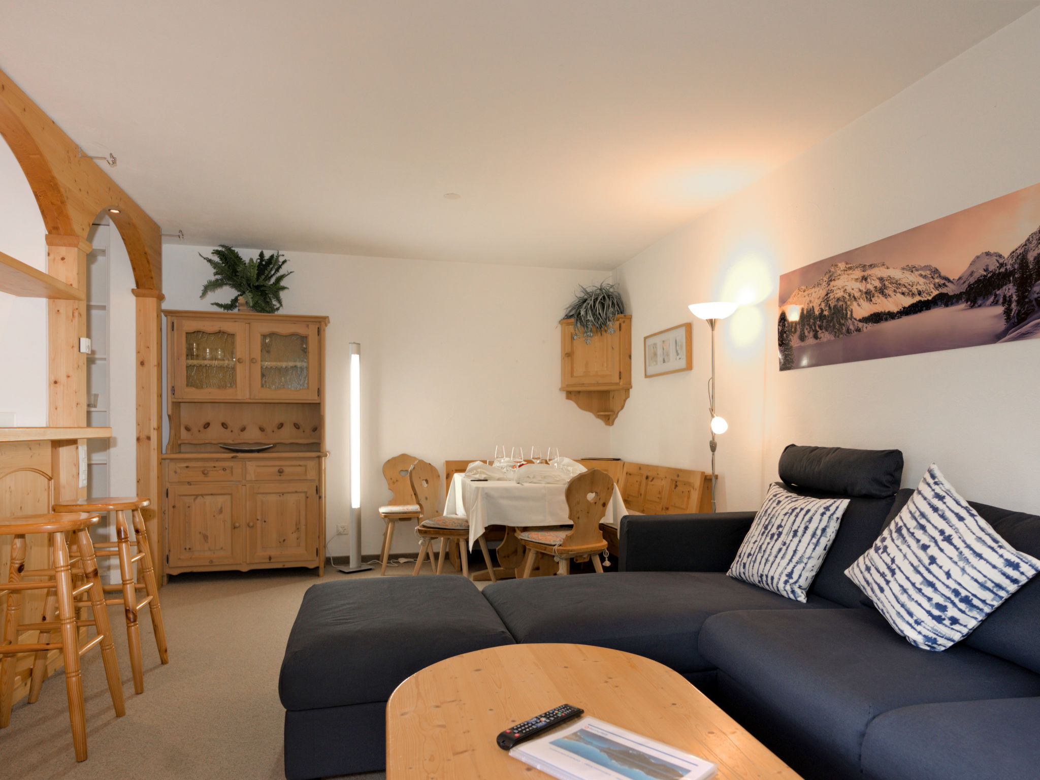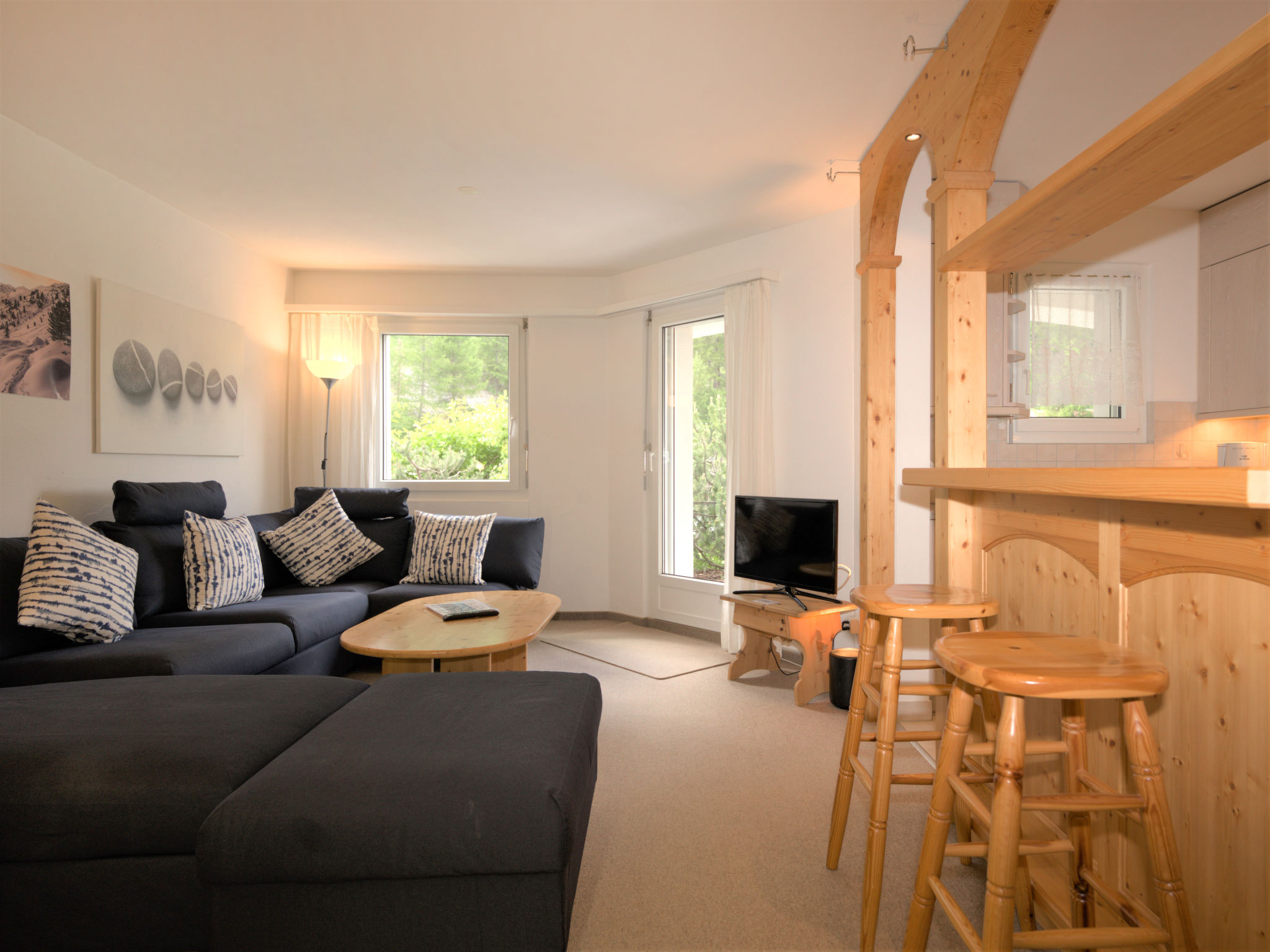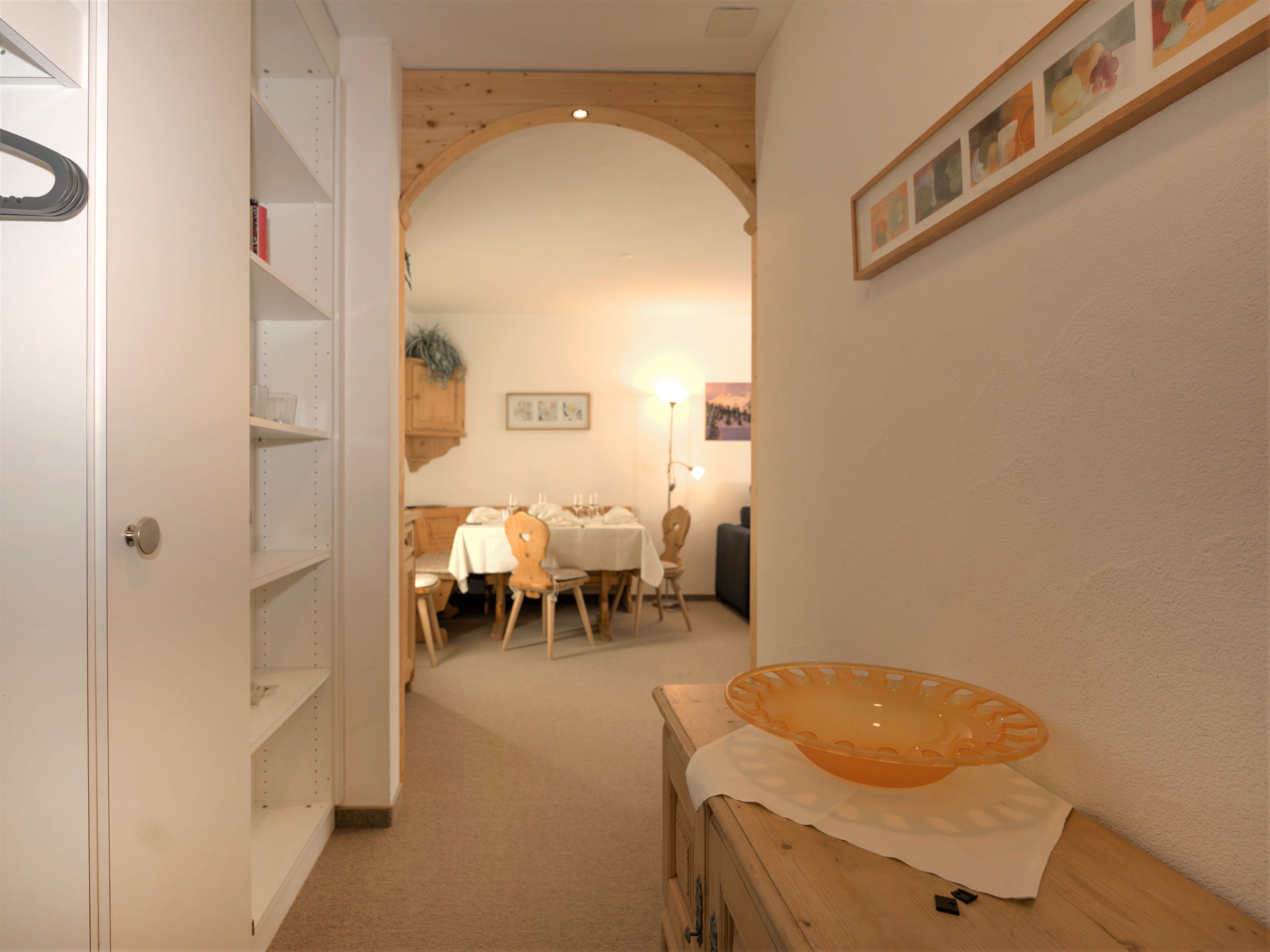 "Chesa Flora 53", apt. di 2 locali 66 m2, al pianterreno. Luminoso, arredamento confortevole e accogliente: soggiorno/sala da pranzo con 1 divano letto doppio (140 cm, lunghezza 190 cm), TV (satellite). Uscita verso il patio. 1 camera con 1 letto doppio (2 x 90 cm, lunghezza 200 cm). Cucina aperta (forno, lavastoviglie, 4 piastre cottura in vetroceramica, tostapane, bollitore elettrico, macchina da caffè elettrica, set per raclette, set per fondue (chinoise, formaggio)) con piccolo bancone. Vasca/WC. Riscaldamento. Moquette. Piccolo patio. Mobili da terrazza. Vista sul bosco. A disposizione: asciugacapelli. Internet (wifi, gratis). Garage nr. 22 (1 Auto), altezza 220 cm, larghezza 240 cm. Prego notare: appartamento per non fumatori.
