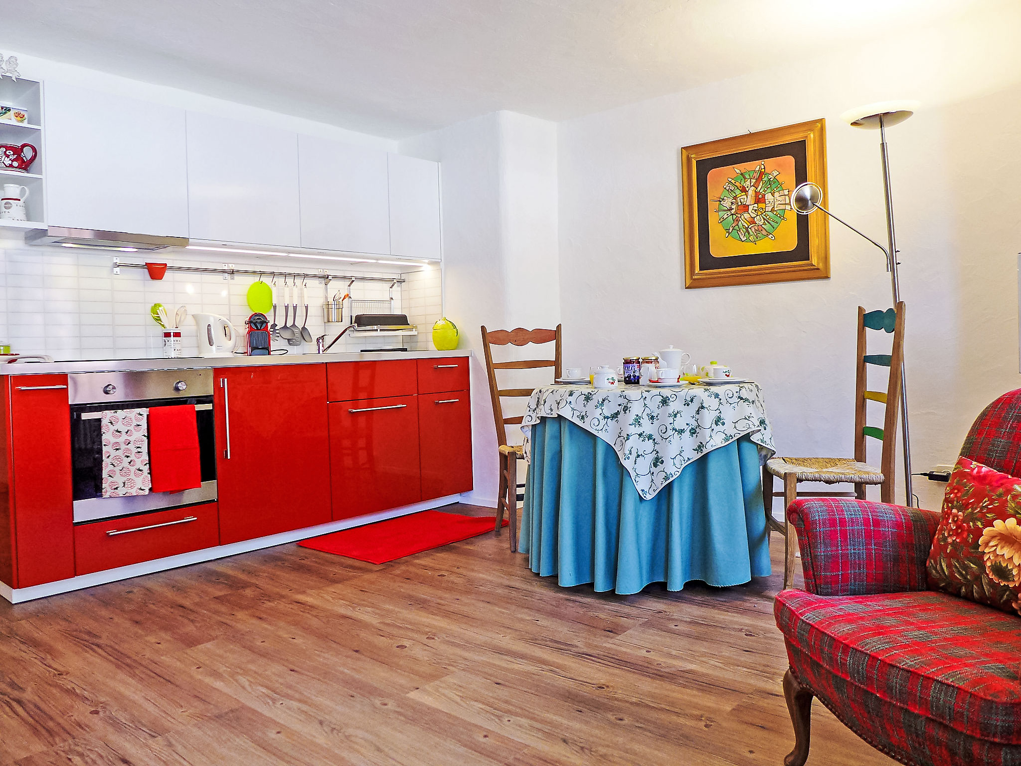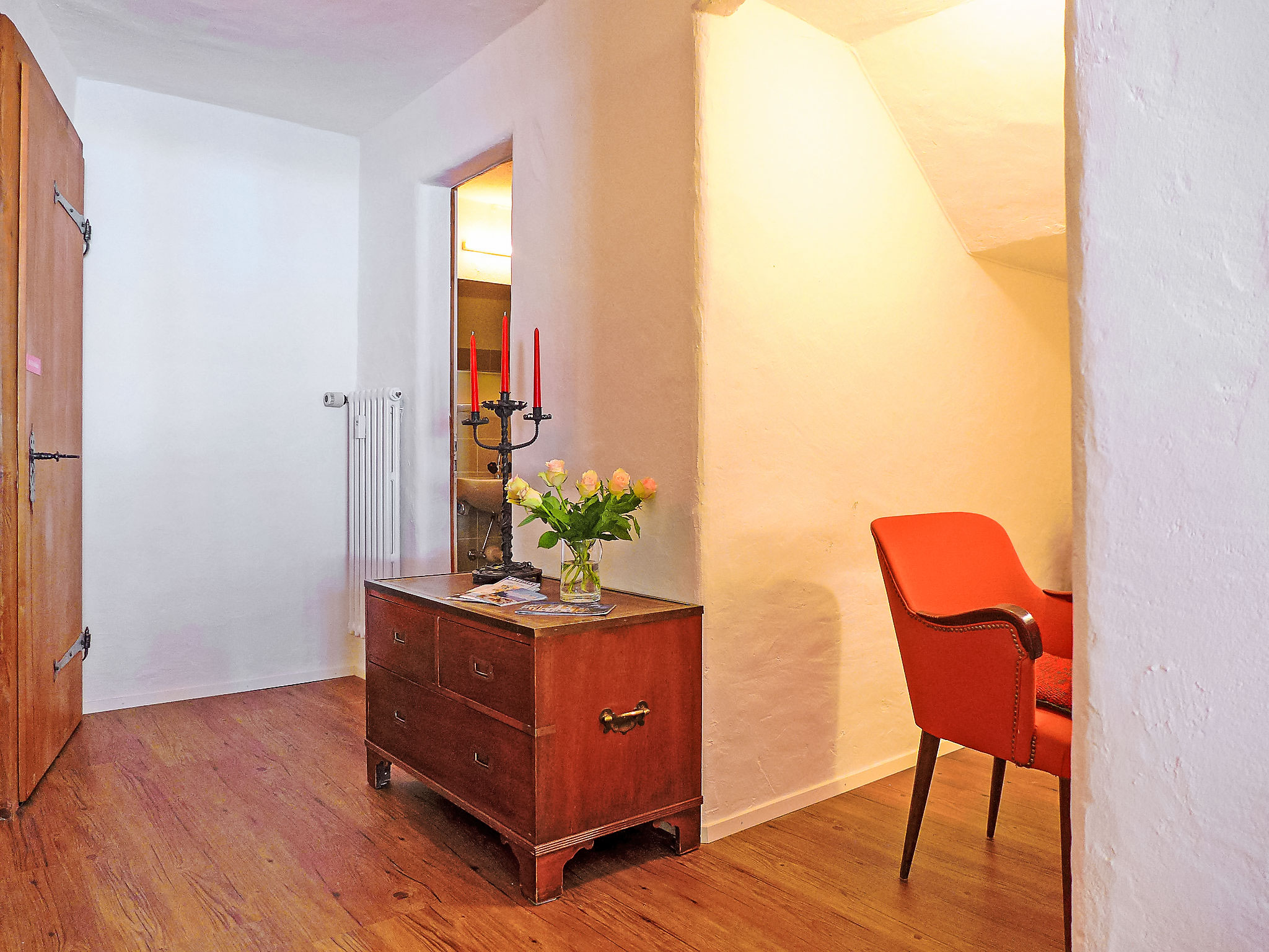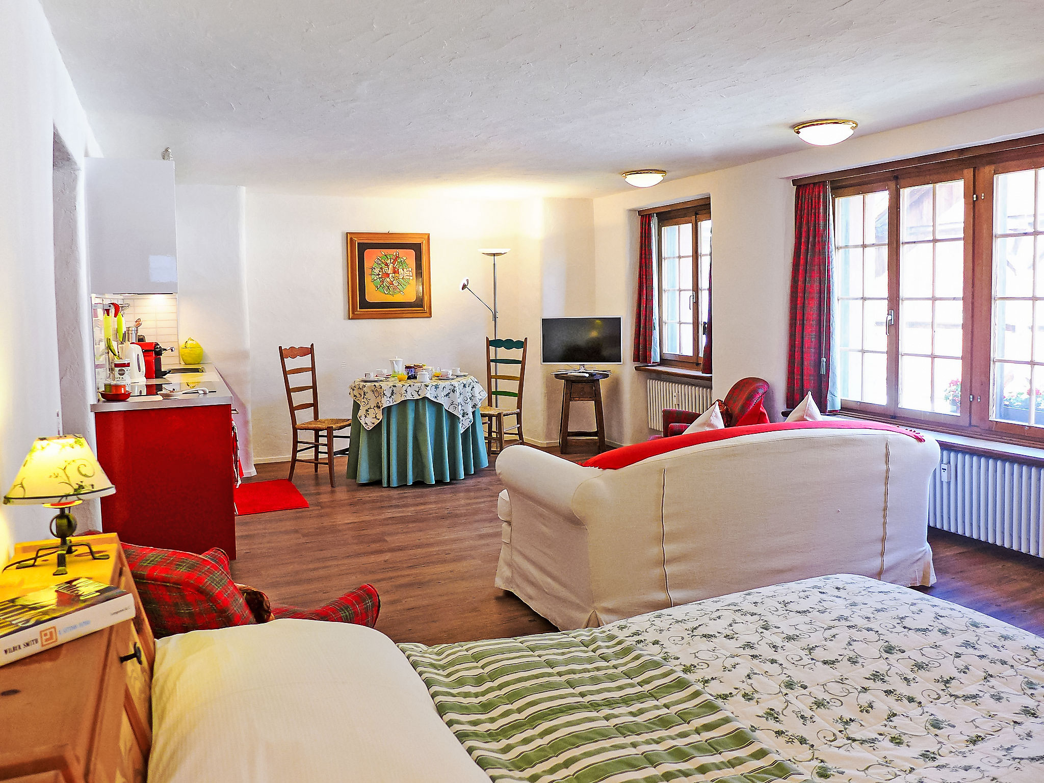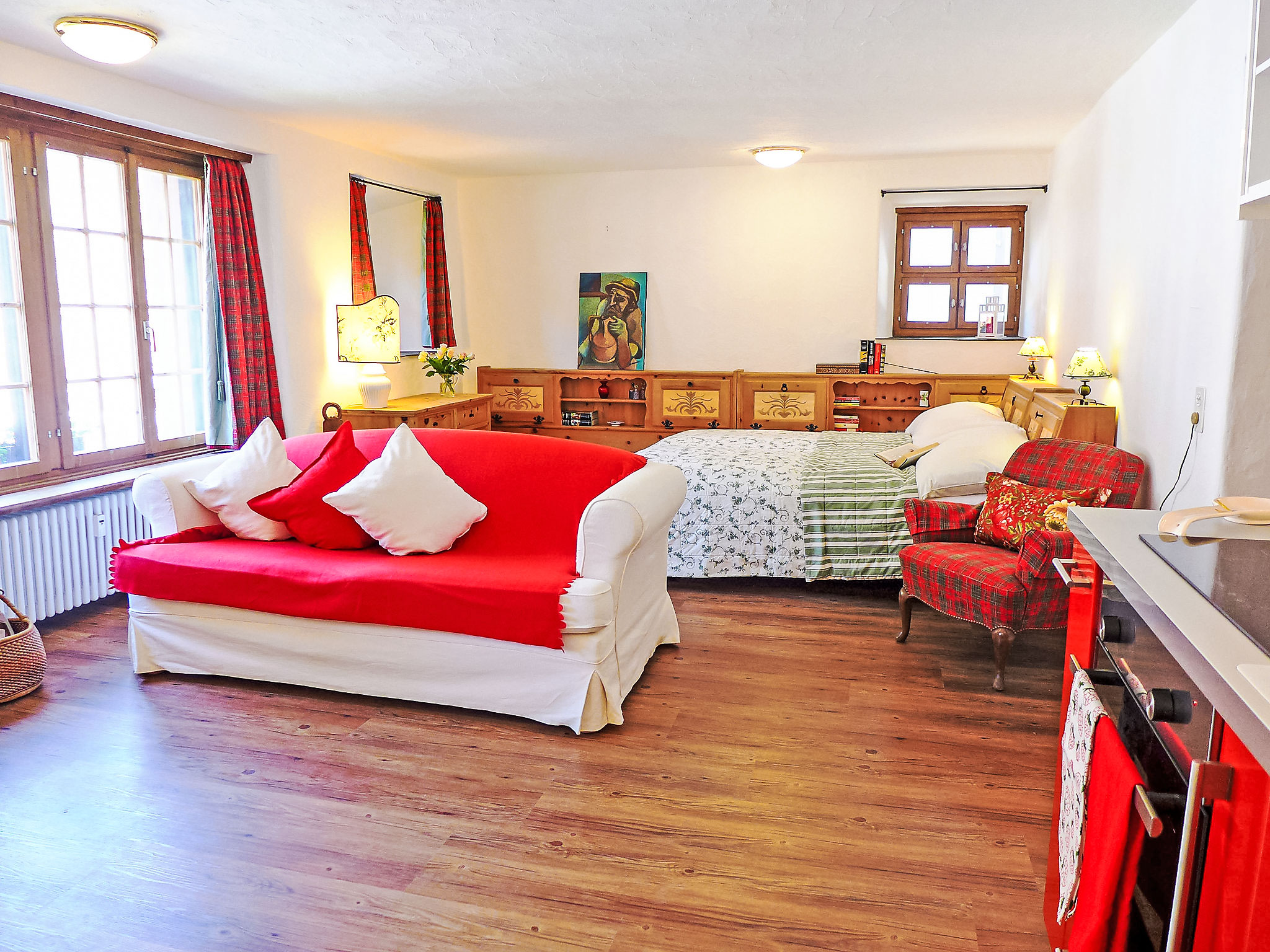 "Chesa Rossa" monolocale 60 m2, al mezzanino, esposizione nord-ovest. Spazioso e luminoso, in parte restaurato nel 2015, arredamento semplice e accogliente: soggiorno/camera grande con TV (schermo piatto) con 2 letti (85 cm, lunghezza 200 cm). Angolo cottura (forno, 4 piastre ad induzione, macchina da caffè elettrica, capsule per la macchina da caffè (Nespresso) extra). Vasca/WC. Piccolo patio. Vista sulle montagne e sul paesaggio. A disposizione: asciugacapelli. Internet (wifi, gratis). Garage a 80 m, altezza 240 cm, larghezza 297 cm. Prego notare: appartamento sul cortile. Appartamento per non fumatori.