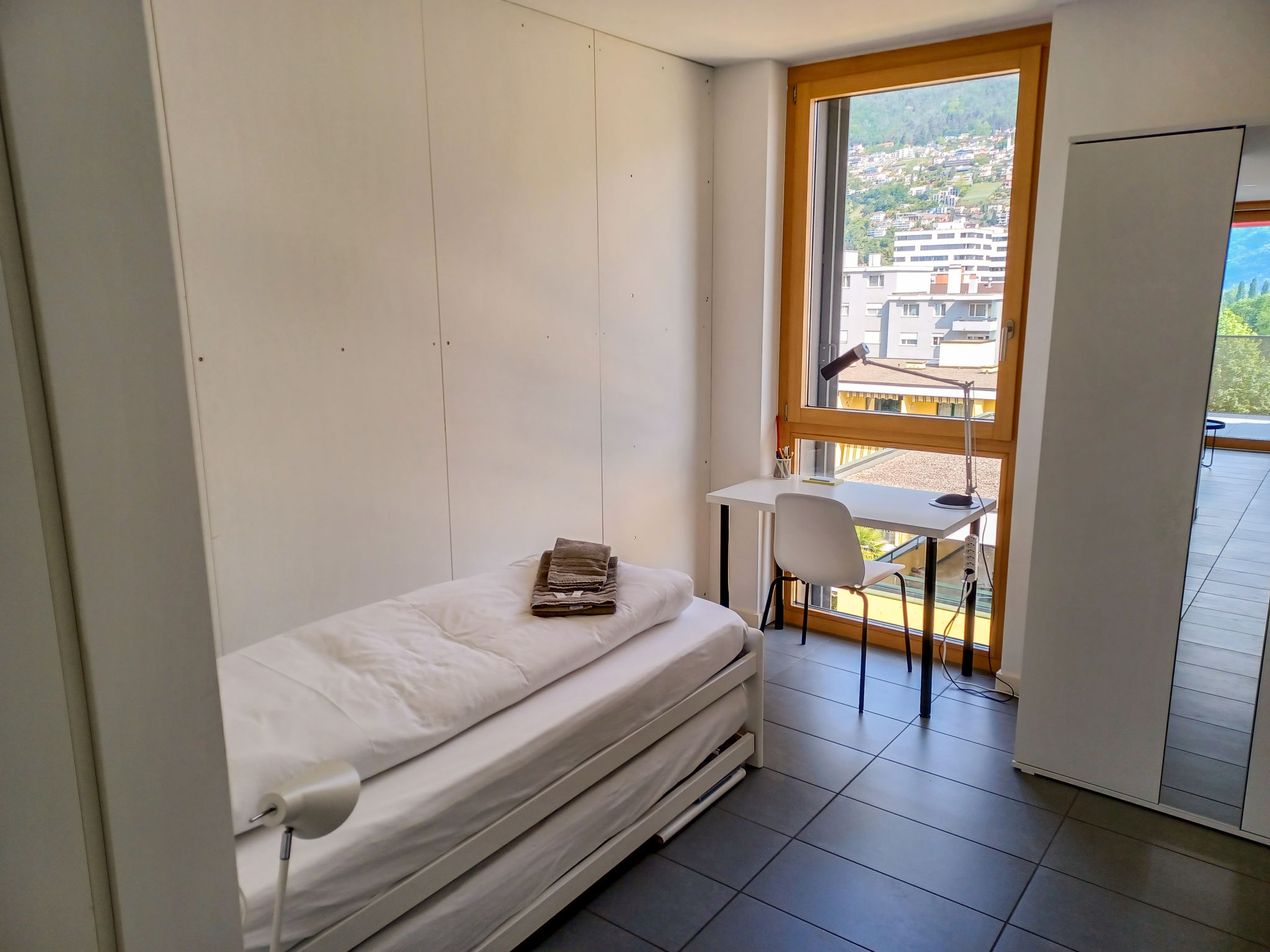 "Orizia", apt. di 3 locali 69 m2 al 6. piano, esposizione sud. Spazioso e luminoso, arredamento confortevole e moderno: soggiorno/sala da pranzo grande, aperto con finestra panoramica con tavolo da pranzo, TV (via cavo) e tv con canali internazionali (schermo piatto). Uscita sulla terrazza. 1 camera matrimoniale con 1 letto doppio (2 x 80 cm, lunghezza 200 cm). 1 camera con tenda con 1 letto estraibile (2 pers. 2 x 90 cm, lunghezza 200 cm). Cucina aperta (forno, lavastoviglie, 4 piastre cottura in vetroceramica, tostapane, bollitore elettrico, forno a microonde, congelatore, macchina da caffè elettrica, capsule per la macchina da caffè (Nespresso) extra, set per raclette, set per fondue (formaggio)). Vasca/WC. Riscaldamento ad aria calda, riscaldamento a pavimento. Grande terrazza 36 m2 in parte, esposizione sud. Splendida vista panoramica sulle montagne, sul paesaggio e sulla località. A disposizione: ferro da stiro, seggiolone, lettino per bimbi fino 2 anni, asciugacapelli. Internet (wifi, gratis). Parcheggio nr. 43. Prego notare: appartamento per non fumatori. NL-00009558