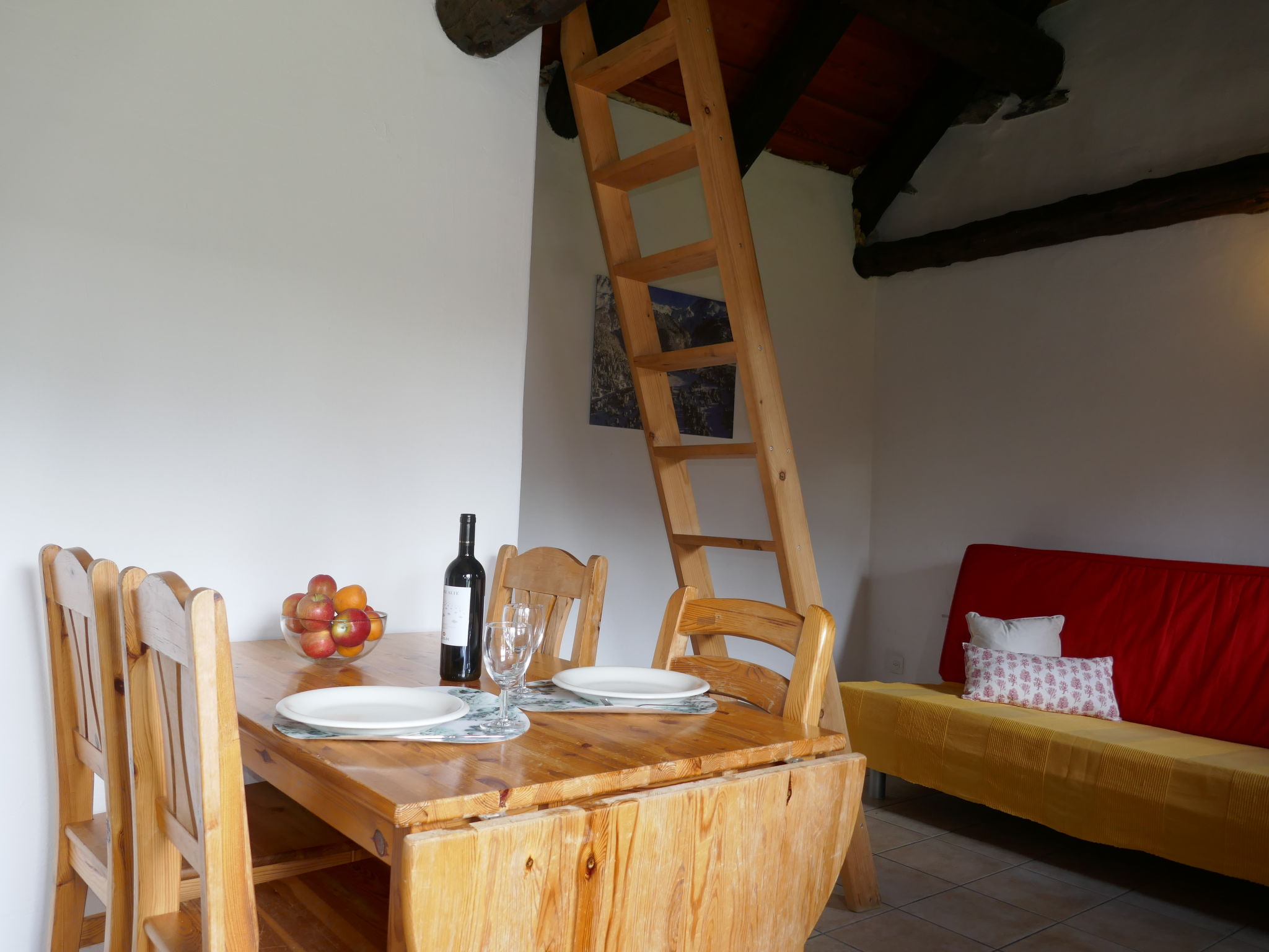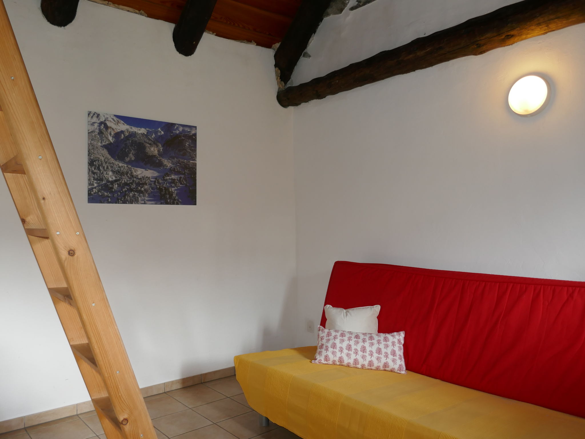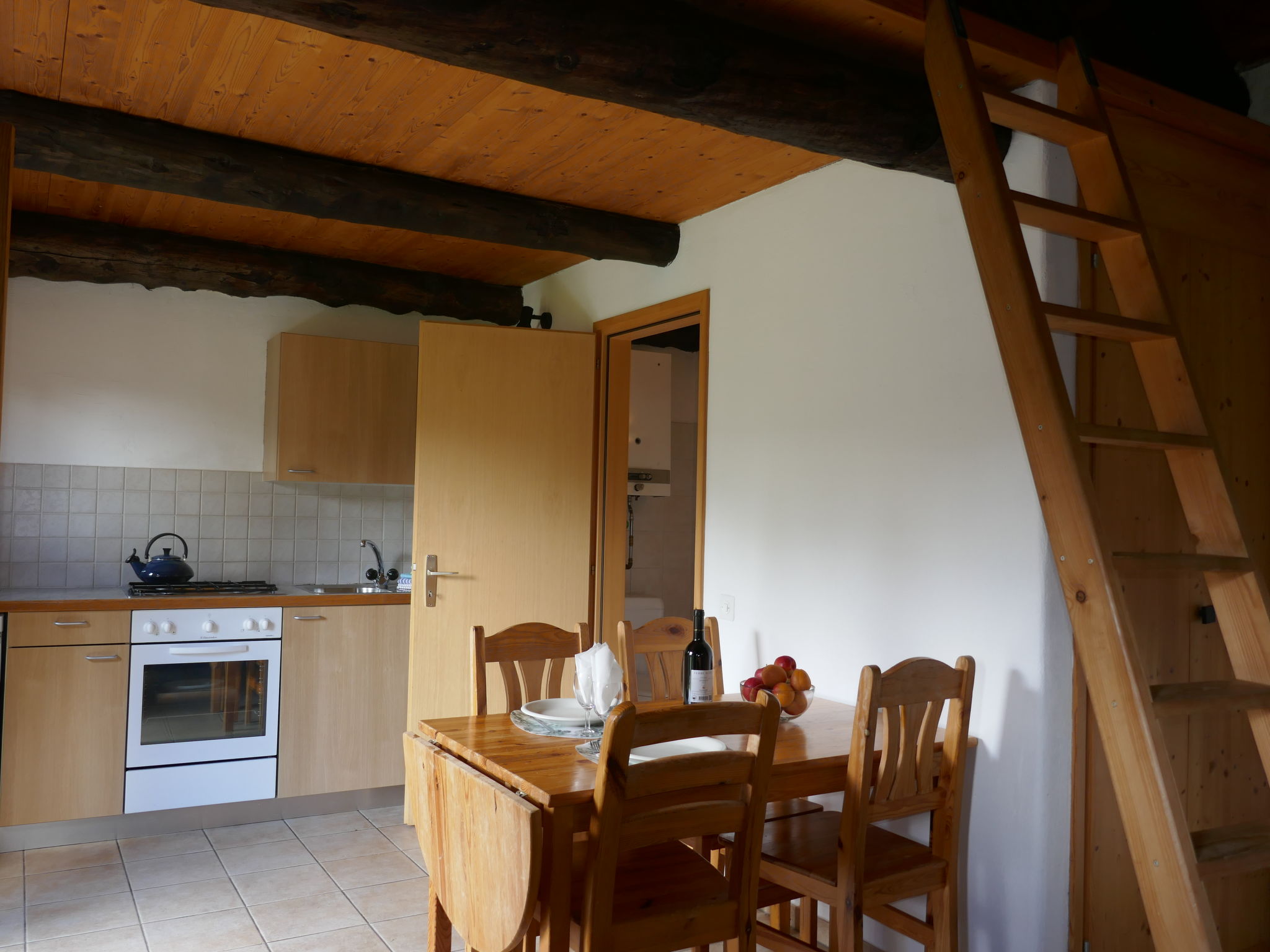 "Rustico Edel", monolocale casa di campagna. Mansardato, arredamento semplice e funzionale: soggiorno/camera aperto con 1 divano letto (160 cm, lunghezza 200 cm), tavolo da pranzo, radio e stufa a legna. Cucina aperta (forno, fornello a gas, 4 fuochi). Doccia/WC. Riscaldamento a legna. Corrente da energia solare. Piano superiore: (scala a pioli) mezzanino aperta con 2 letti (80 cm, lunghezza 200 cm). Magnifica vista panoramica sulle montagne, sulla valle e sul paesaggio. A disposizione: seggiolone, lettino per bimbi fino 2 anni (extra). Prego notare: casa per non fumatori. Massimo 1 animale/cane consentito. Estintore. NL-00002214