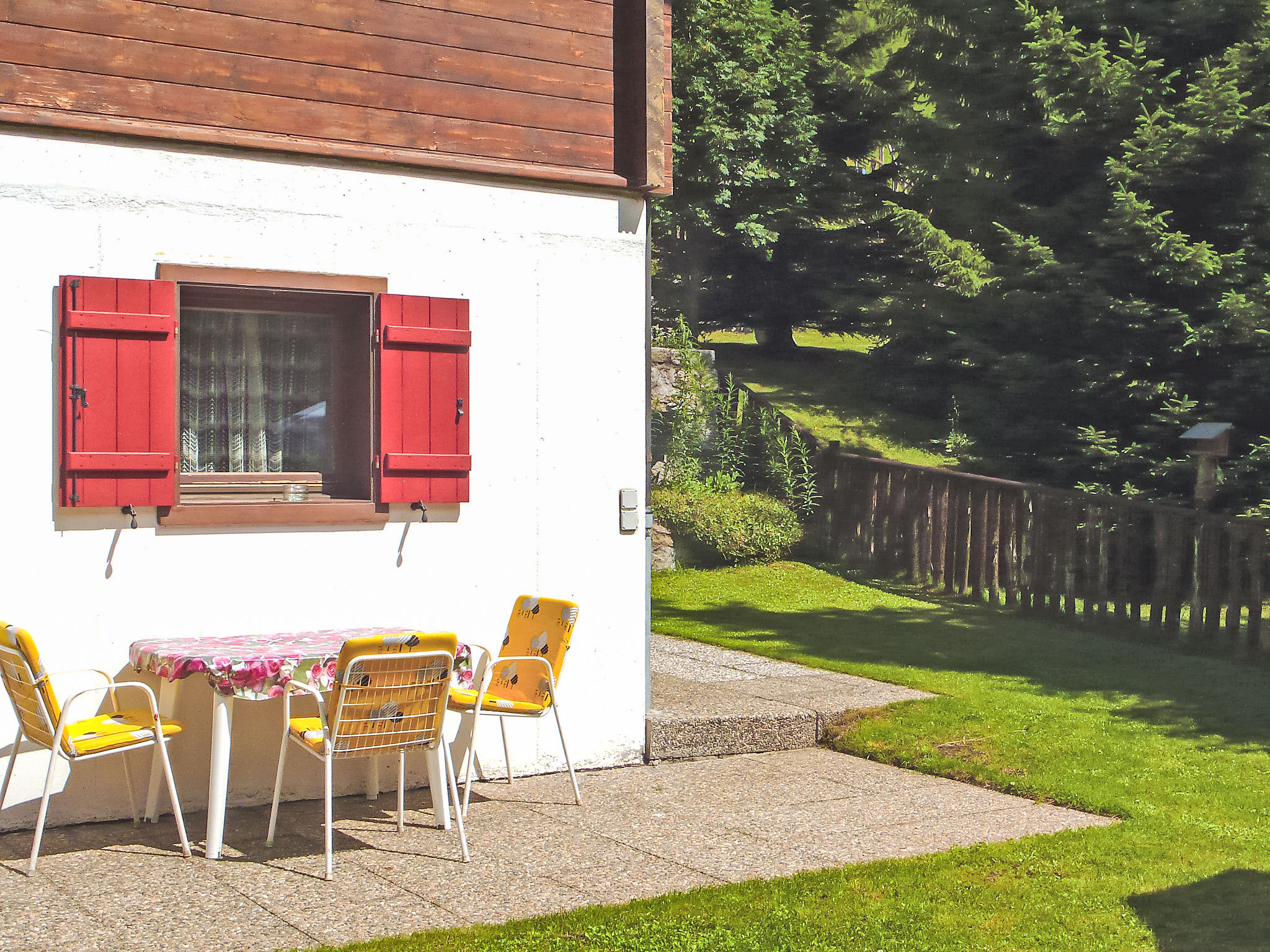 Apt. di 3 locali al pianterreno. Arredamento confortevole e accogliente: soggiorno/sala da pranzo aperto con 1 divano letto doppio, TV (satellite) e radio. Uscita verso il patio. 1 camera con 1 letto doppio. 1 camera per bambini con 2 letti. Cucina aperta (4 punti cottura, lavastoviglie, set per raclette, set per fondue (formaggio)) con tavolo da pranzo. Doccia/WC. Riscaldamento. Grande patio 45 m2. Sedie a sdraio (4), ripostiglio. Magnifica vista sulle montagne, sulla valle, sul paesaggio e sulla località. A disposizione: ferro da stiro, asciugacapelli. Internet (wifi). Prego notare: appartamento per non fumatori. Massimo 2 animali/cani consentiti. NL-00004291
