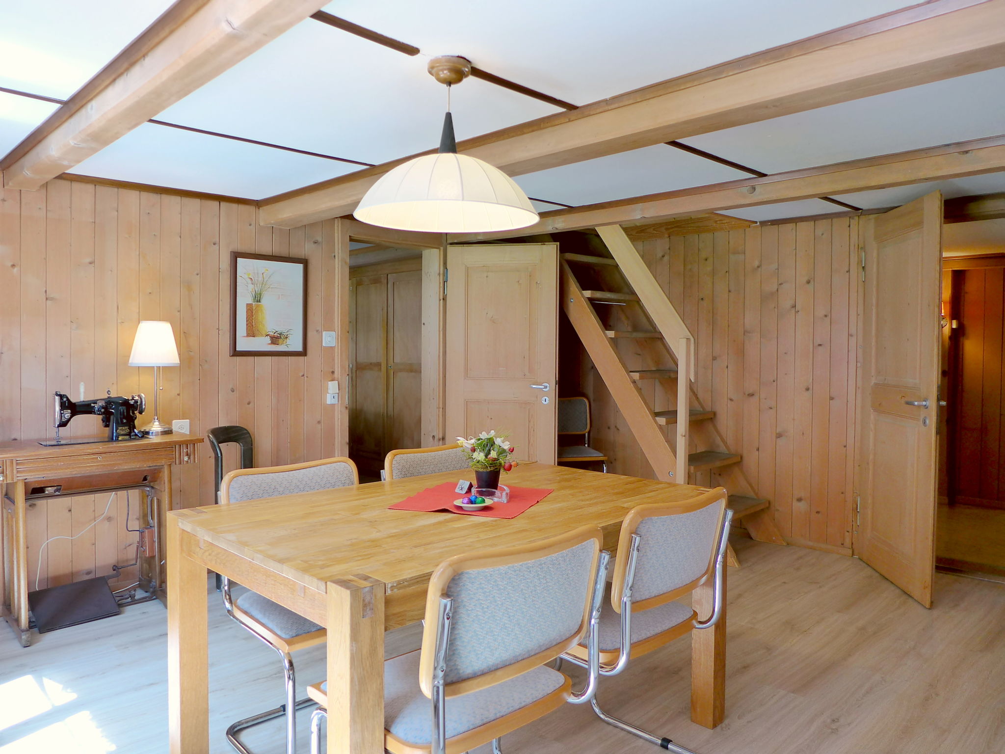 Apt. di 3 locali 80 m2 su 2 piani, piano rialzato. Spazioso, arredamento accogliente e con arredo in legno: altezza del soffitto 185 - 200 cm. Soggiorno/sala da pranzo con 1 divano letto, TV (satellite), schermo piatto e radio. 1 camera matrimoniale con 2 letti (90 cm, lunghezza 200 cm). Uscita sul balcone. Cucina aperta (3 punti cottura, forno, lavastoviglie, tostapane, bollitore elettrico, forno a microonde, macchina da caffè elettrica, set per raclette, set per fondue (formaggio)) con tavolo da pranzo. Doccia/WC. Piano superiore: (scala ripida) 1 camera matrimoniale grande con 2 letti (90 cm, lunghezza 200 cm). Piccolo balcone. Mobili da balcone, ripostiglio. Magnifica vista sulle montagne e sulla località. A disposizione: lavatrice, lettino per bimbi fino 2 anni (extra), asciugacapelli. Internet (wifi, gratis). Parcheggio. Prego notare: appartamento per non fumatori.