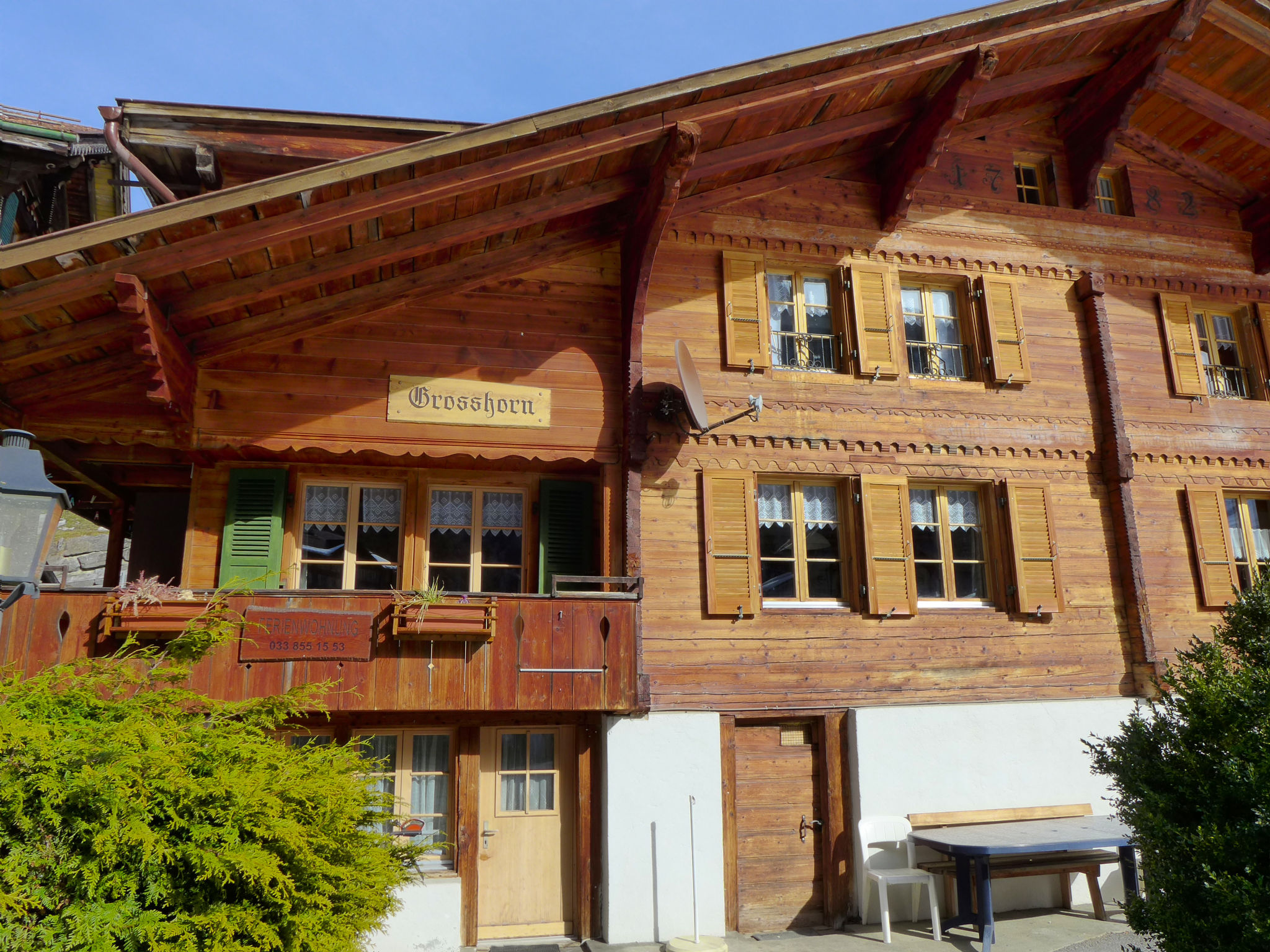 Lauterbrunnen: Chalet "Grosshorn", rustico, semplice su 2 piani. Nella frazione Ey, posizione soleggiata in una zona residenziale, su una strada. Nella casa: deposito biciclette, deposito sci, riscaldamento centralizzato. Parcheggio. Negozio 300 m, negozio alimentare 500 m, supermercato 600 m, ristorante 200 m, fermata bus 50 m, stazione ferroviaria 800 m, piscina 800 m. Tennis 200 m, mini golf, sentieri per passeggiate vicino alla casa 50 m, funicolare 800 m, impianti di risalita 4 km, fermata ski bus, pista di fondo 200 m, pattinaggio. Attrazioni nelle vicinanze: Trümmelbach Wasserfälle, Schilthorn Piz Gloria. Rinomate località sciistiche: Mürren Schilthorn, Wengen - Kleine Scheidegg. Laghi famosi: Brienzersee, Thunersee 15 km. Sentieri escursionistici: UNESCO-Welterbe Jungfau-Aletsch, Mürren, Hinteres Lauterbrunnental. Prego notare: skibus gratuito. Servizio Skibus gratuito per il comprensorio sciistico Mürren-Schilthorn. Prego notare: il proprietario vive nello stesso immobile. Vista delle cascate di Staubbach .