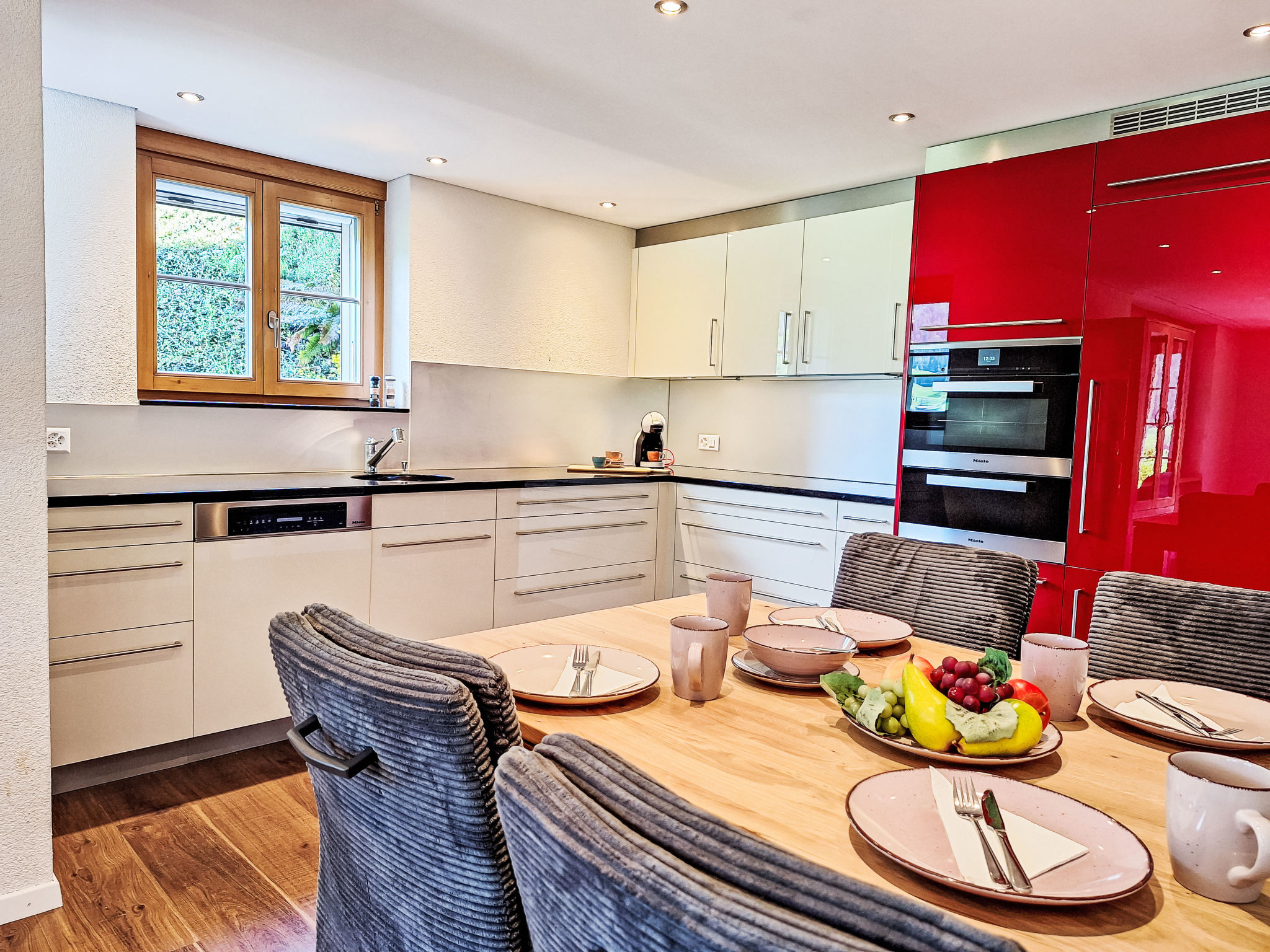 "Chalet Adlerhorst EG", apt. di 3 locali al pianterreno, esposizione sud. Spazioso e luminoso, arredamento molto confortevole e di buon gusto: soggiorno grande, aperto con TV (via cavo) e schermo piatto. Uscita sulla terrazza. 2 camere, ogni camera con 1 letto doppio (2 x 90 cm, lunghezza 200 cm). Grande cucina aperta (forno, lavastoviglie, 4 piastre cottura in vetroceramica, tostapane, bollitore elettrico, forno a microonde, macchina da caffè elettrica, capsule per la macchina da caffè (Dolce Gusto) extra) con tavolo da pranzo. Vasca/WC. Riscaldamento a pavimento. Grande terrazza, esposizione sud. Mobili da terrazza. Magnifica vista panoramica sulle montagne, sulla valle e sul paesaggio. A disposizione: asciugacapelli. Internet (wifi, gratis). Parcheggio. Prego notare: appartamento per non fumatori. Allarme antifumo, estintore.