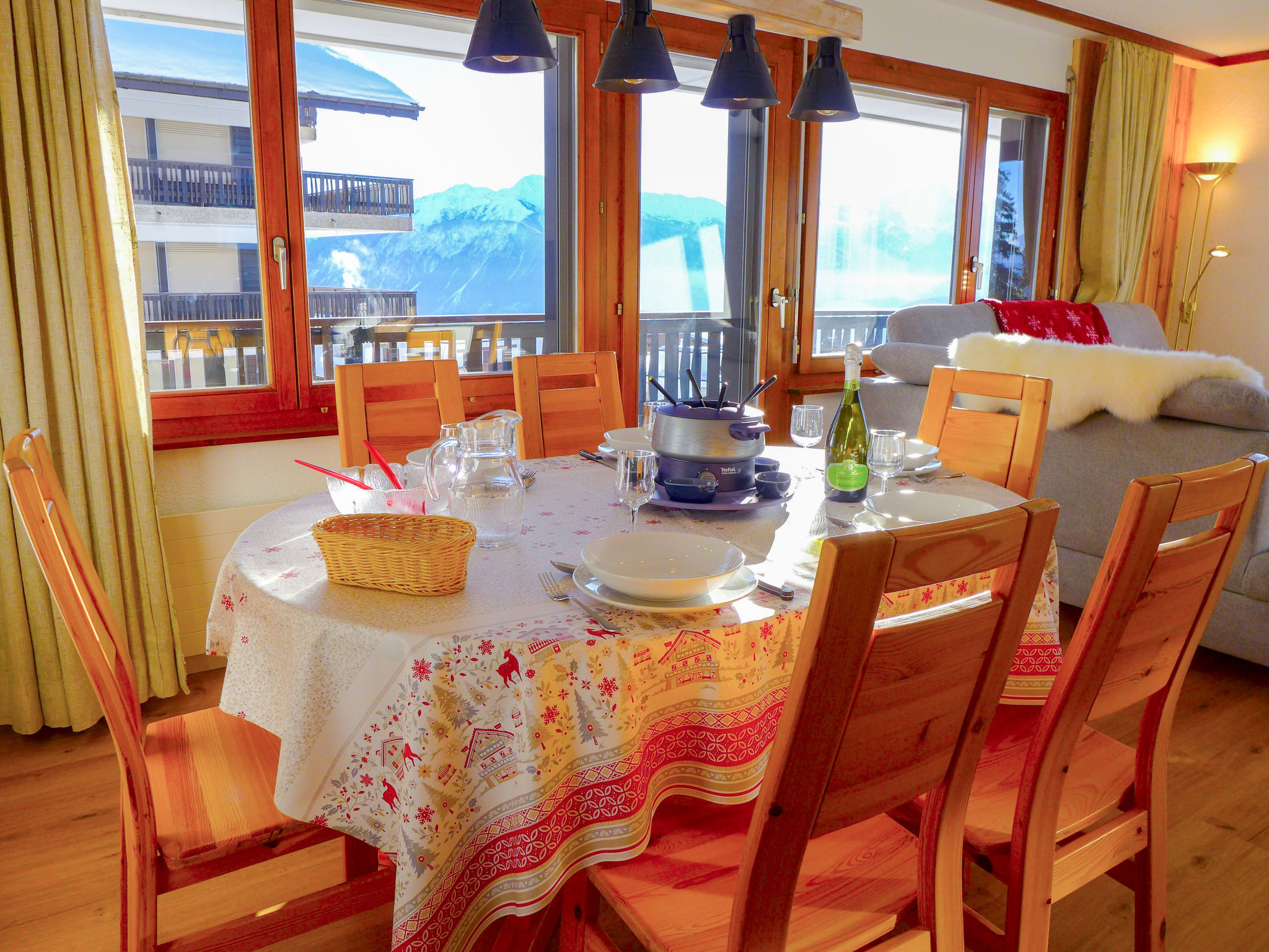 "Mandarin B 19", apt. di 3 locali 80 m2 al 2. piano. Luminoso, completamente restaurato nel 2023, arredamento confortevole e di buon gusto: soggiorno/sala da pranzo con camino, doccia/WC, TV (via cavo) e schermo piatto. Uscita sul balcone, esposizione sud e esposizione est. 1 camera con 1 letto alla francese (160 cm, lunghezza 200 cm) con vasca/WC. 1 camera con 1 letto (90 cm, lunghezza 200 cm), 1 x 2 letti a castello (90 cm, lunghezza 200 cm). Uscita sul balcone, esposizione nord. Cucina aperta (forno, lavastoviglie, 4 piastre cottura in vetroceramica, tostapane, bollitore elettrico, forno a microonde, congelatore, macchina da caffè elettrica, capsule per la macchina da caffè (NESPRESSO) extra, set per raclette, set per fondue (chinoise, formaggio)). Grande balcone 30 m2, esposizione sud e esposizione est. Mobili da balcone. Splendida vista sulle montagne e sul paesaggio. A disposizione: seggiolone, lettino per bimbi fino 2 anni, asciugacapelli. Internet (wifi, gratis). Garage nr. 10 (1 Auto), altezza 189 cm, larghezza 235 cm. Prego notare: appartamento per non fumatori. Allarme antifumo. Lettino pieghevole senza lenzuola e senza coperture.