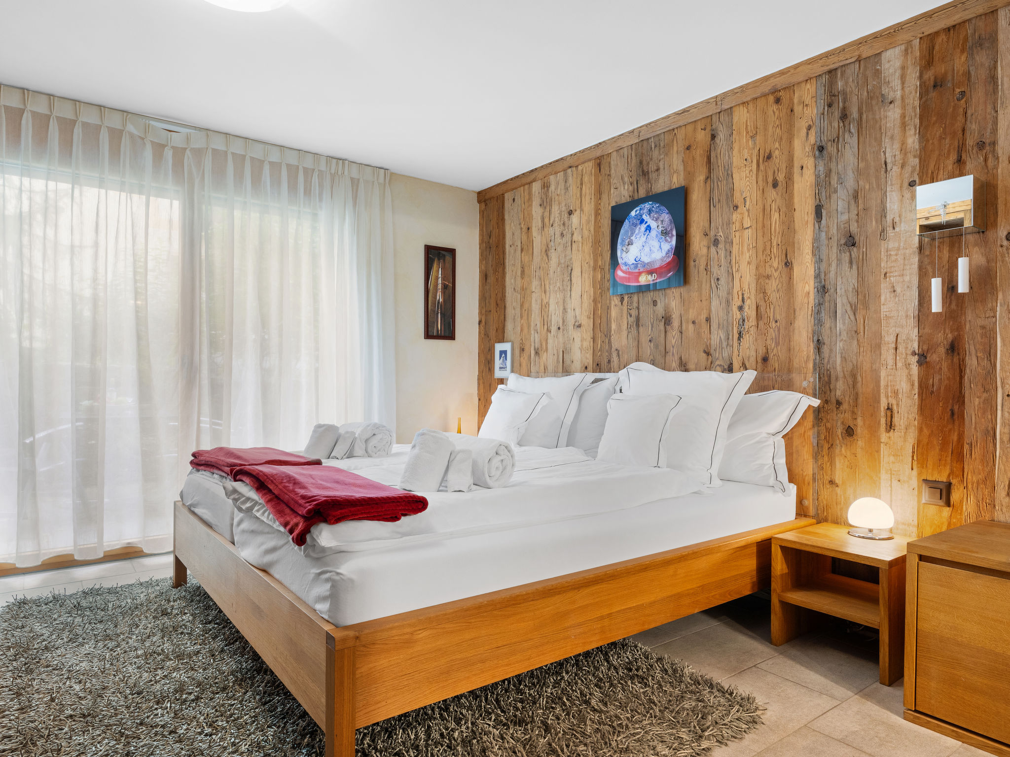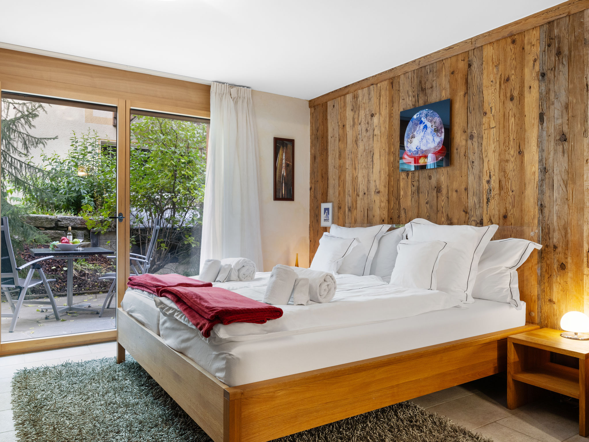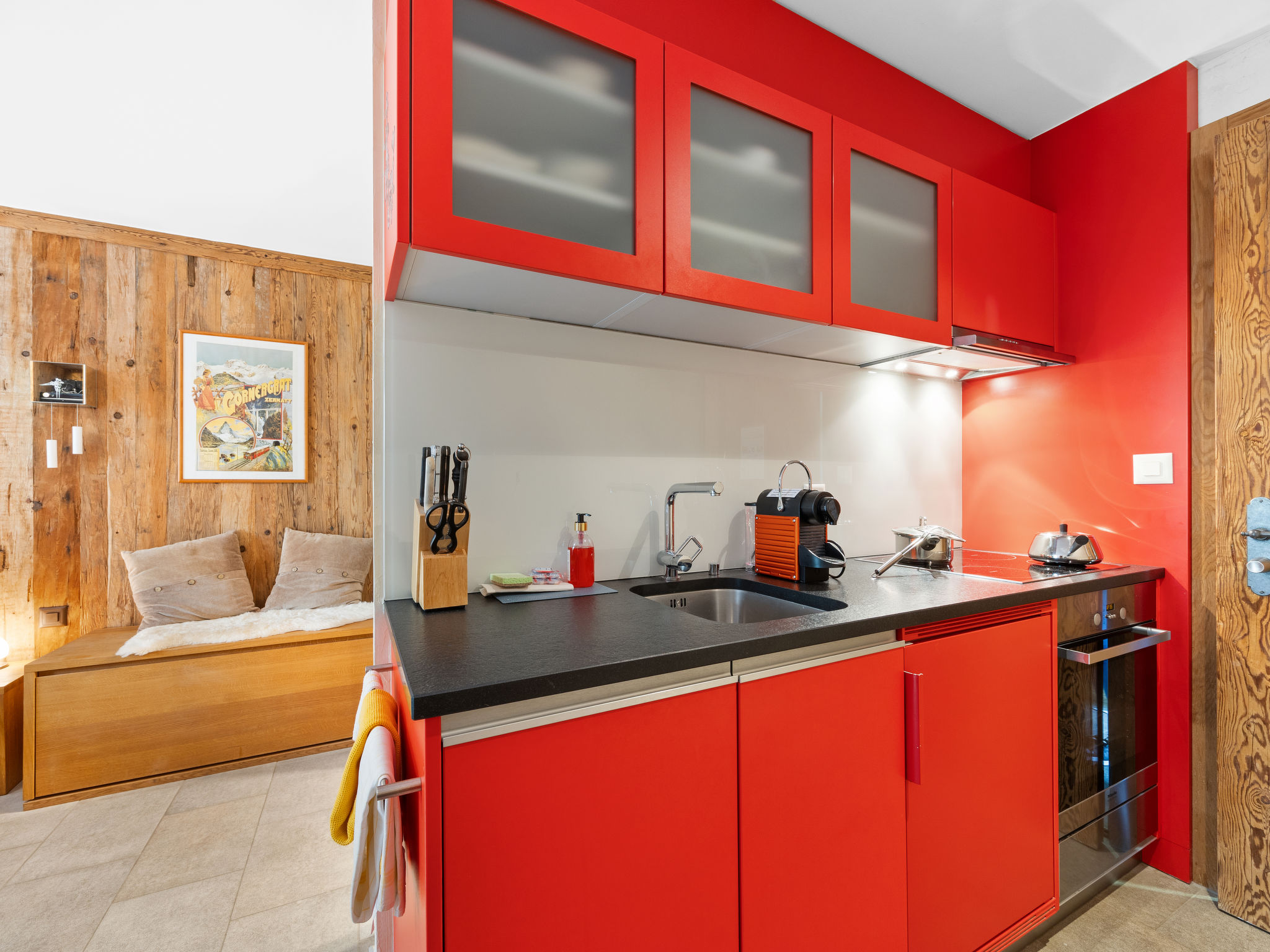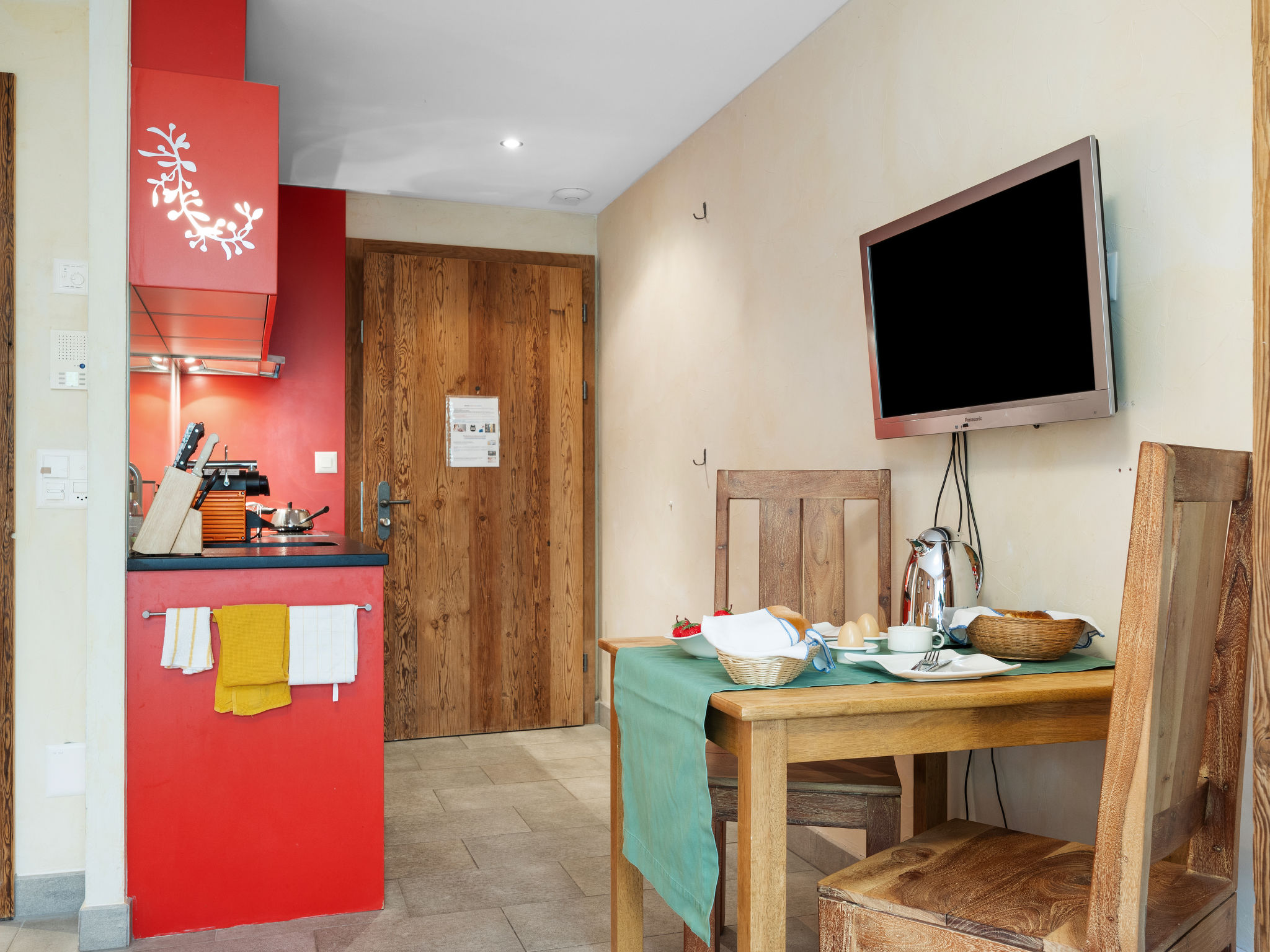Monolocale 24 m2, al pianterreno. Arredamento lussuoso e di buon gusto: soggiorno/camera con 1 letto doppio, tavolo da pranzo, TV, radio, CD e DVD. Uscita sulla terrazza. Cucina aperta nell'ingresso (forno, lavastoviglie, 4 piastre ad induzione, tostapane, bollitore elettrico, macchina da caffè elettrica, capsule per la macchina da caffè (Nespresso) extra, set per raclette, set per fondue (formaggio)). Doccia/WC. Piccola terrazza, esposizione ovest. Mobili da terrazza. A disposizione: cassaforte, asciugacapelli. Internet (wifi, gratis). Prego notare: appartamento per non fumatori.