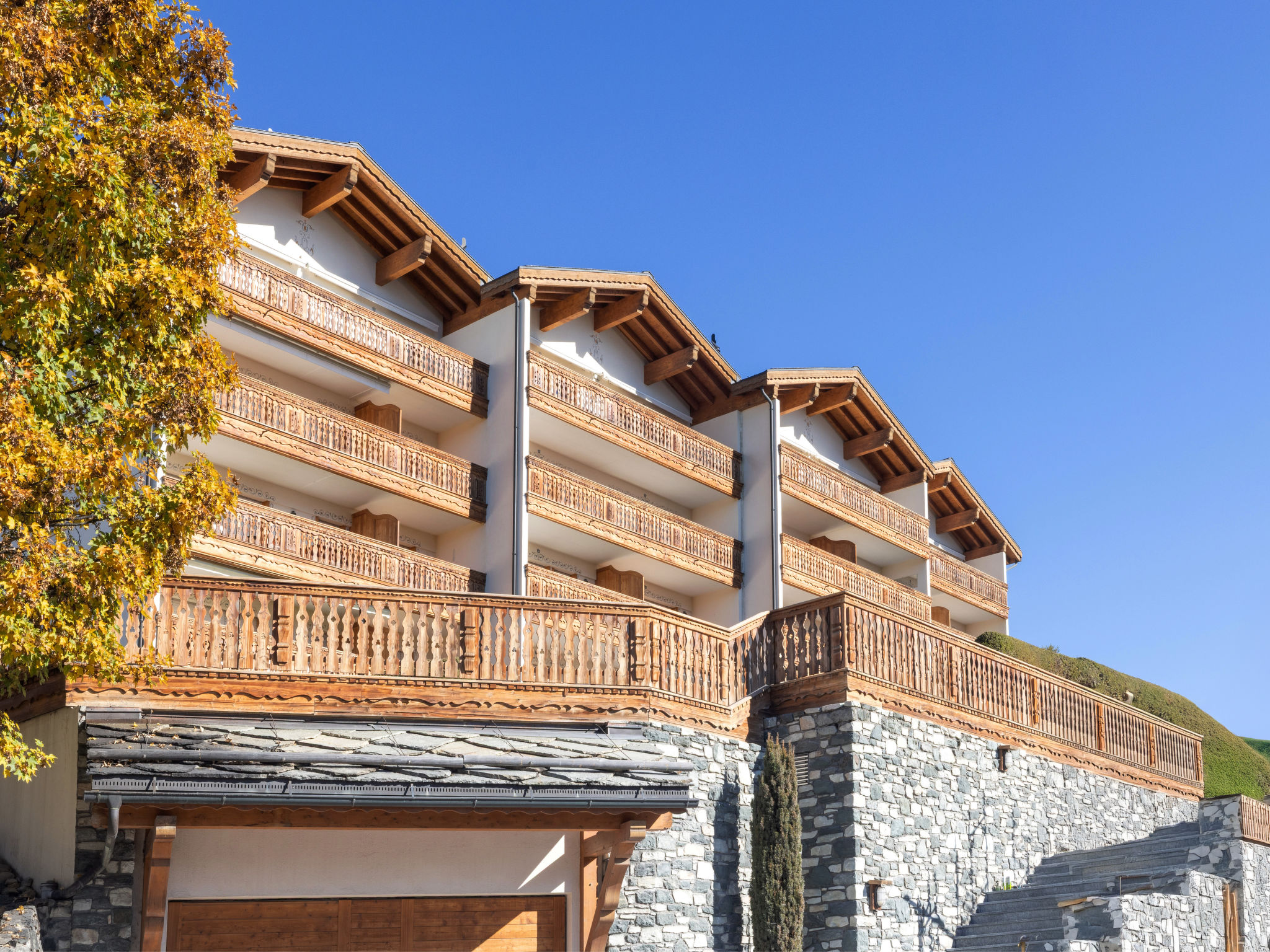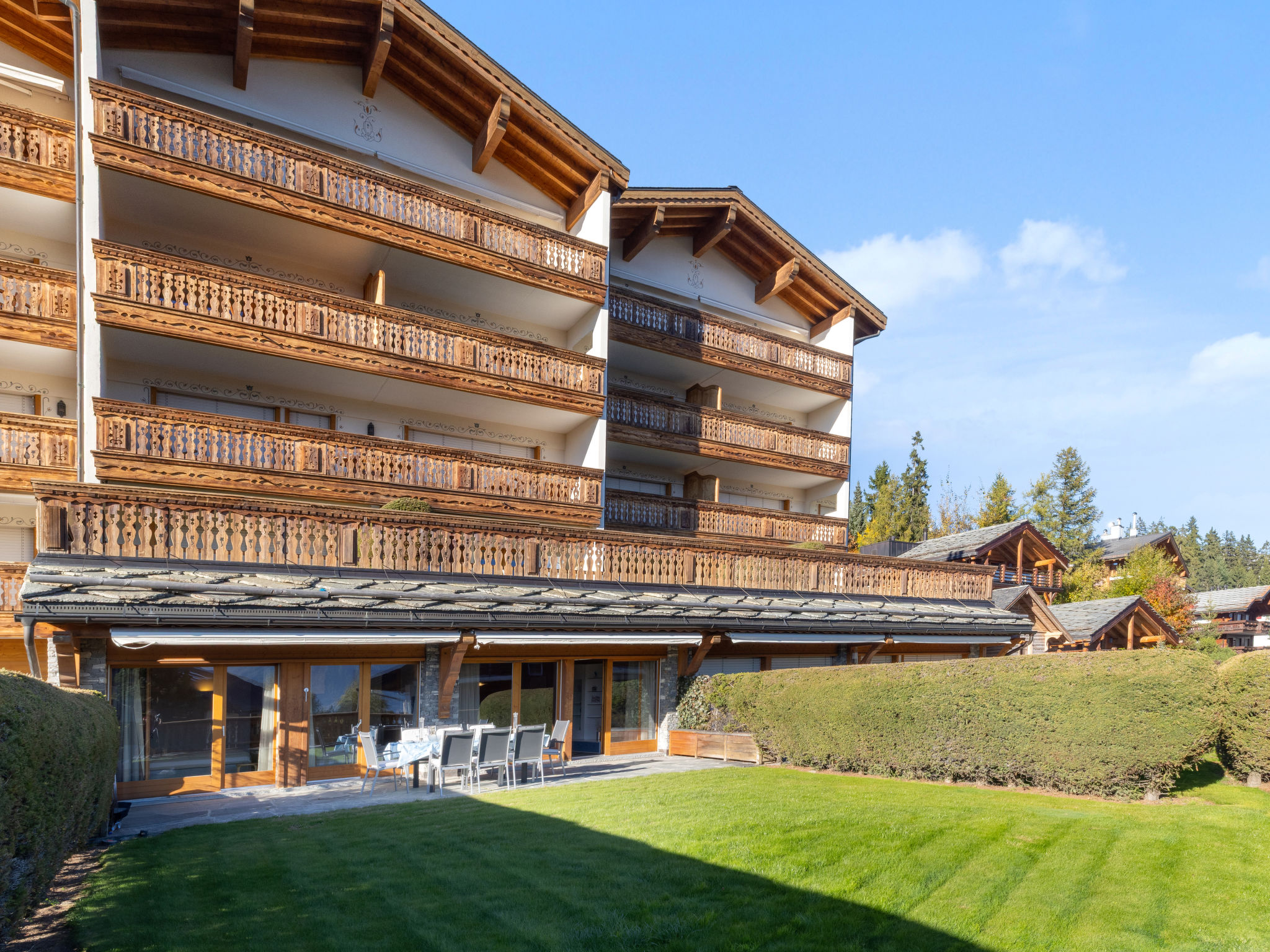 "Antares R05", apt. di 5 locali 140 m2, piano rialzato. Arredamento confortevole e con arredo in legno: soggiorno/sala da pranzo grande con TV (via cavo) (schermo piatto), radio e tapparelle elettriche. Uscita sulla terrazza. 1 camera con 1 letto doppio (2 x 80 cm, lunghezza 200 cm), vasca/WC, TV (via cavo) e tapparelle elettriche. 1 camera con 1 letto doppio (2 x 80 cm, lunghezza 200 cm), TV (via cavo) e tapparelle elettriche. Uscita sulla terrazza. 1 camera con 1 letto doppio (2 x 80 cm, lunghezza 200 cm), TV (via cavo) e tapparelle elettriche. Uscita sulla terrazza. 1 camera, senza finestra con 1 letto ribaltabile doppio (2 x 80 cm, lunghezza 200 cm). Cucina aperta (forno, lavastoviglie, 4 piastre cottura in vetroceramica, tostapane, bollitore elettrico, forno a microonde, macchina da caffè elettrica, capsule per la macchina da caffè (Nespresso) extra, set per raclette, set per fondue (chinoise, formaggio)). Vasca/WC, doccia/WC. Riscaldamento a pavimento. Grande terrazza 30 m2, esposizione sud. Mobili da terrazza. Vista sulle montagne. A disposizione: ferro da stiro, asciugacapelli. Internet (wifi, gratis). Garage nr. 8 (1 Auto), altezza 220 cm, larghezza 370 cm. Prego notare: appartamento per non fumatori. Massimo 2 animali/cani consentiti.