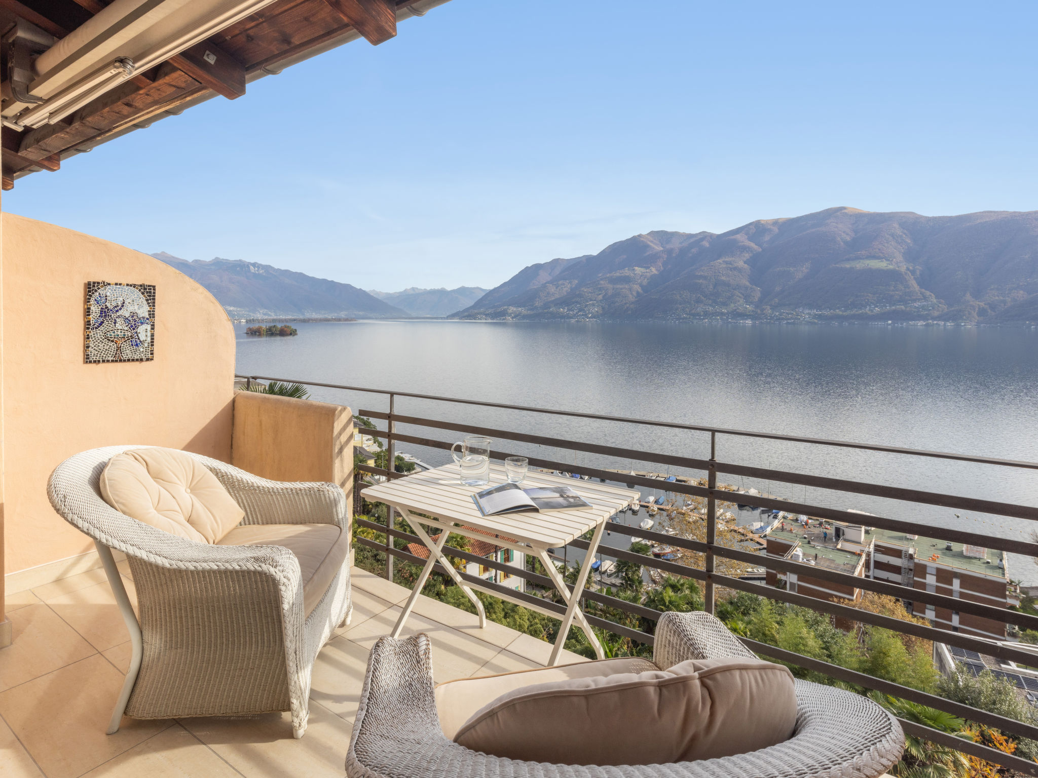 "Brissago Blue", appartamento su due livelli monolocale 45 m2 su 2 piani, al piano superiore, esposizione sud-est. In parte mansardato, arredamento accogliente e con arredo in legno: soggiorno/sala da pranzo con tavolo da pranzo, TV, tv con canali internazionali e ventilatore. Uscita sulla terrazza, esposizione sud e esposizione est. Piccola cucina (lavastoviglie, 4 piastre cottura in vetroceramica, tostapane, bollitore elettrico, macchina da caffè elettrica, capsule per la macchina da caffè (Delizio) extra). Vasca o doccia/WC. Riscaldamento. Riscaldamento utilizzabile dal 25.10. al 15.04. Piano superiore: soppalco mansardato, aperto altezza del soffitto 185 - 250 cm con abbaino con 1 letto doppio (2 x 90 cm, lunghezza 200 cm). Pavimenti in legno, pavimenti in pietra. Terrazza 10 m2. Mobili da terrazza. Magnifica vista panoramica sul lago, sulle montagne e sulla località. A disposizione: ferro da stiro, asciugacapelli. Internet (wifi). Parcheggio, altezza 180 cm, larghezza 200 cm. Prego notare: appartamento per non fumatori. Massimo 1 animale/cane consentito. Uno o più posti letto adibiti a zona notte si trovano in area aperta o di passaggio (come soppalco, corridoio, alcova e simili). NL-00012945