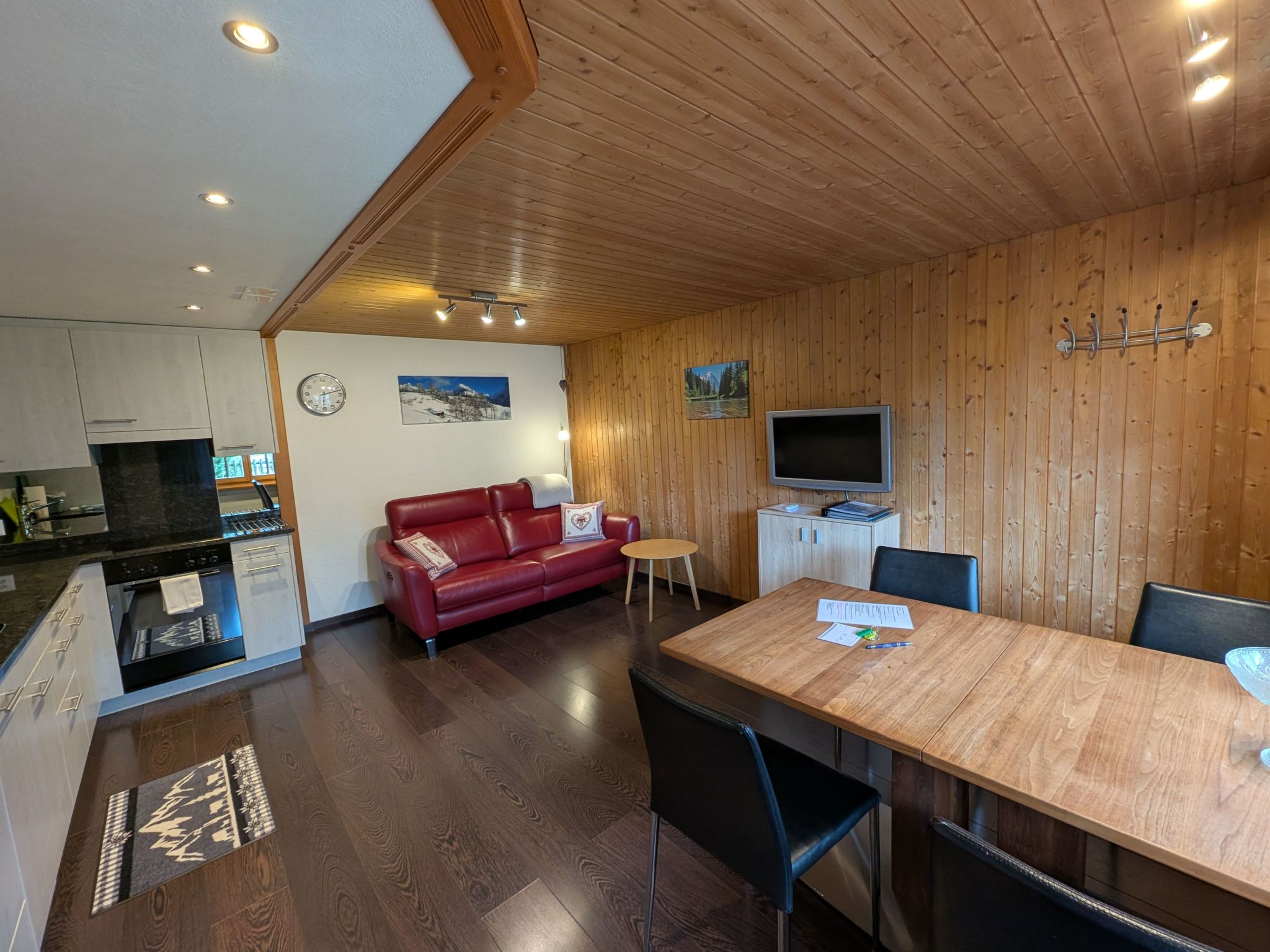 Welcome to your dream holiday in the charming 2-room flat in Chalet Stieregg, located in the heart of Grindelwald. This beautiful ground floor flat offers a perfect combination of cosiness and modern comfort on 44 m², ideal for couples or small families who want to enjoy the breathtaking scenery of the Swiss Alps in a stylish ambience.Inside, you will find a tastefully furnished flat that leaves nothing to be desired. The bedroom has a comfortable double bed measuring 180 x 200 cm and a large wardrobe for all your belongings. The living room is furnished with an inviting leather sofa with relax function and a dining table. The adjoining modern kitchen is perfectly equipped with a dishwasher, microwave, oven, kettle, filter and Nespresso coffee machines, fondue set and raclette oven. The bathroom has a toilet and shower as well as a washbasin with mirror cabinet.The chalet's outdoor area with its cosy terrace invites you to enjoy the spectacular view of the Eiger in peace and quiet. There is also a car park right next to the house. For your convenience, there is also a laundry room with washing machine and a ski room for shared use.The surroundings of Grindelwald not only offer an impressive Alpine landscape, but also a wide range of leisure activities. Whether mountaineering, ice skating, golf, mountain biking, paragliding, cycling tours, tobogganing or skiing - every nature and sports enthusiast will find their happiness here. Striking mountains such as the Eiger, Wetterhorn, Mönch and Jungfrau set impressive accents in the imposing mountain scenery.Enjoy an unforgettable stay in Grindelwald, where relaxation and adventure go hand in hand. Our Chalet Stieregg is the ideal base for your excursions to the Jungfraujoch, Kleine Scheidegg and many other highlights in the region. Look forward to relaxing days in one of the most beautiful corners of Switzerland, with all the comfort you could wish for - for a holiday that leaves nothing to be desired.
