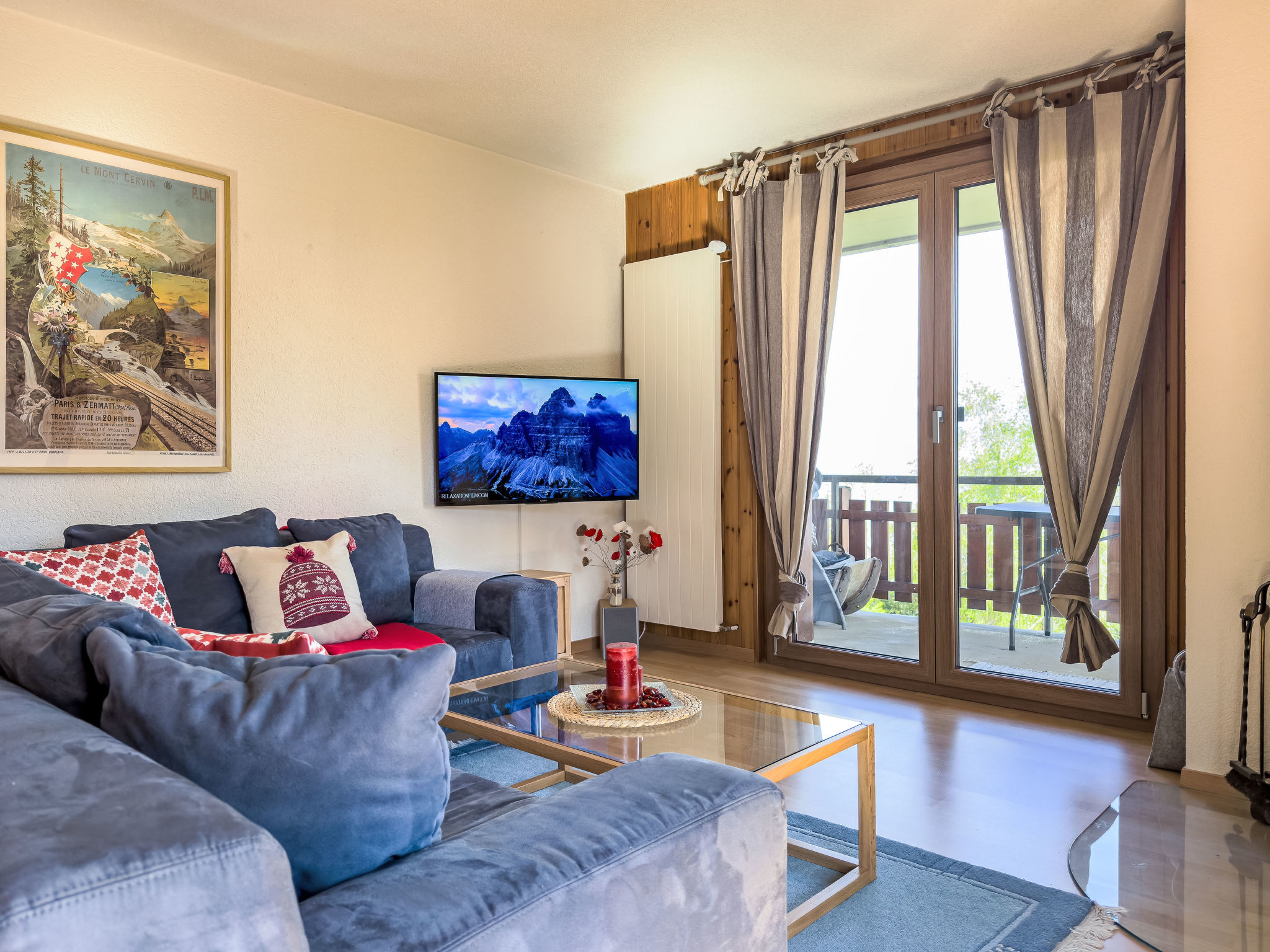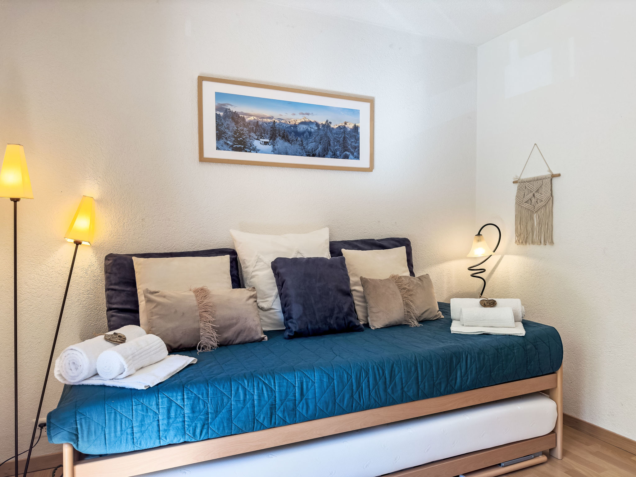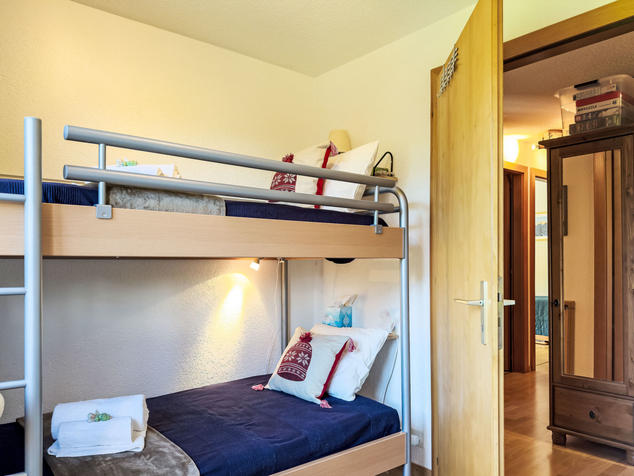 "Chamois AZ10", apt. di 4 locali 100 m2 al 1. piano. Luminoso, in parte restaurato, arredamento gradevole e di buon gusto: ingresso. Soggiorno/sala da pranzo con stufa svedese e TV (via cavo). Uscita sul balcone. 1 camera con 1 x 2 letti a castello (90 cm, lunghezza 190 cm). 1 camera con 1 letto alla francese (160 cm, lunghezza 200 cm). Uscita sul balcone. 1 camera con 1 letto estraibile (2 pers. 2 x 90 cm, lunghezza 190 cm). Uscita sul balcone. Cucina aperta (forno, lavastoviglie, 4 piastre cottura in vetroceramica, bollitore elettrico, forno a microonde, macchina da caffè elettrica, capsule per la macchina da caffè (Nespresso) extra, set per raclette, set per fondue (formaggio)). Vasca/WC, doccia/WC. 2 grandi balconi, esposizione nord-est e esposizione sud-est. Mobili da balcone, barbecue. Splendida vista sulle montagne. A disposizione: Internet (wifi, gratis). Prego notare: appartamento per non fumatori.
