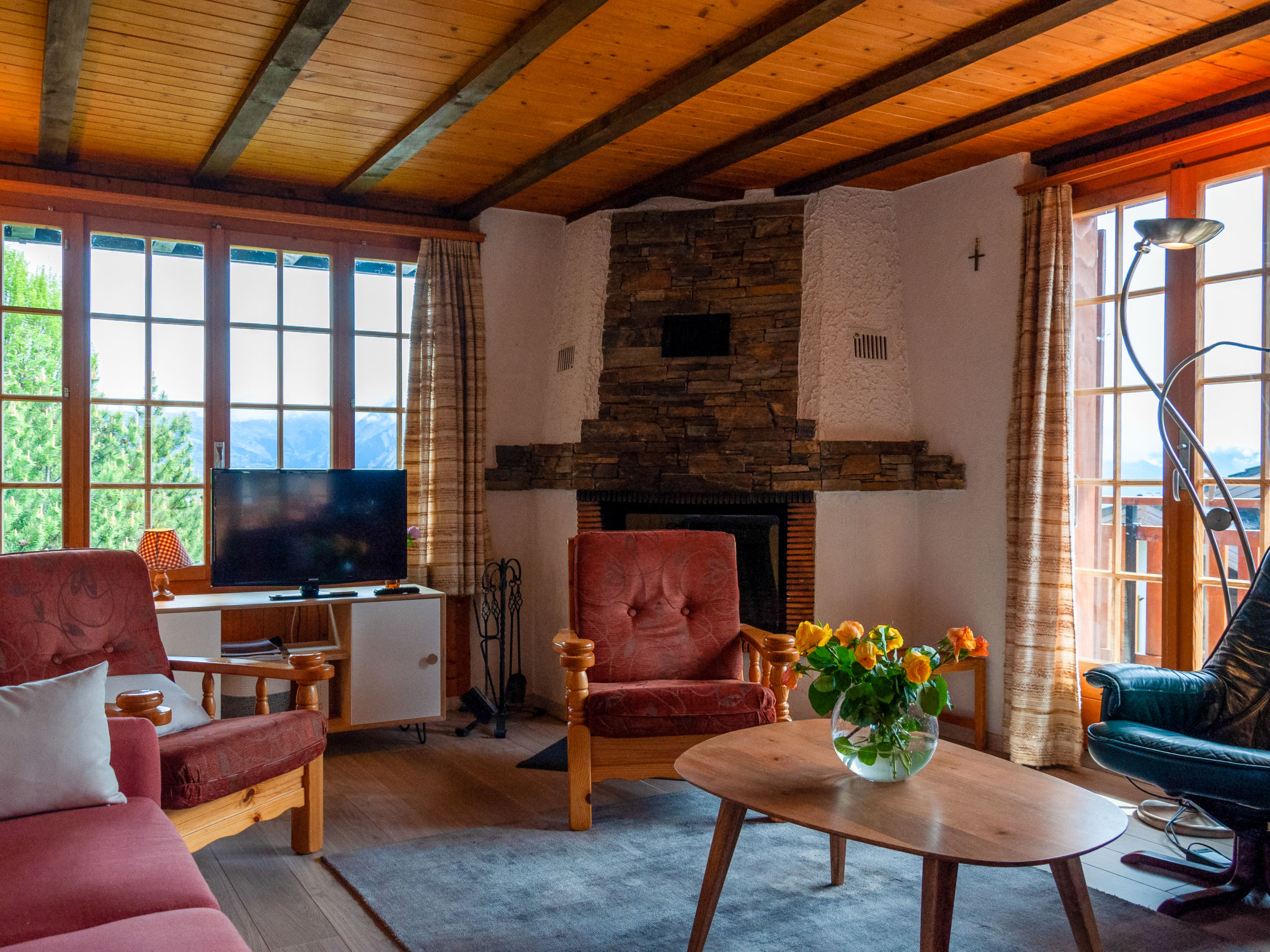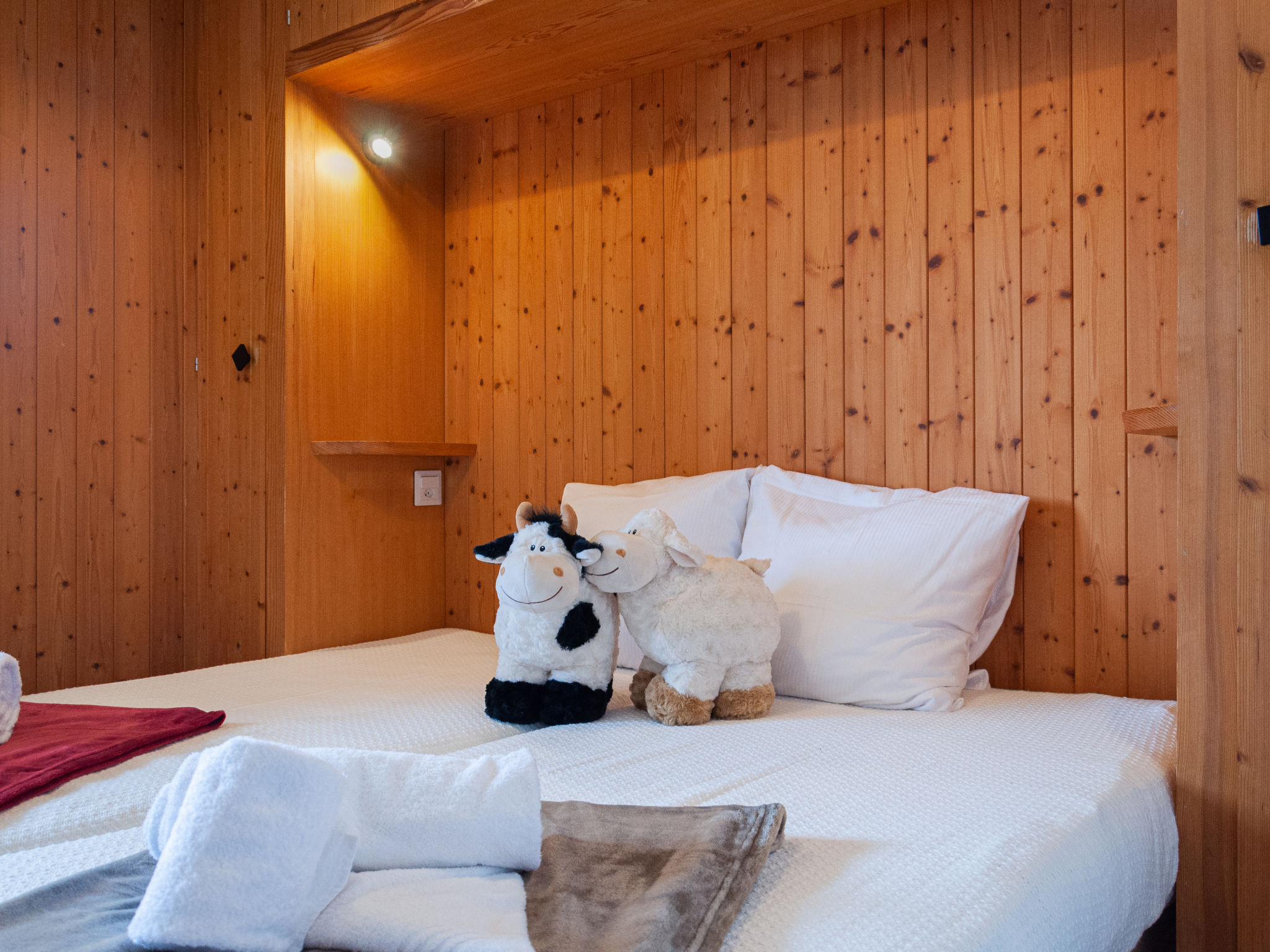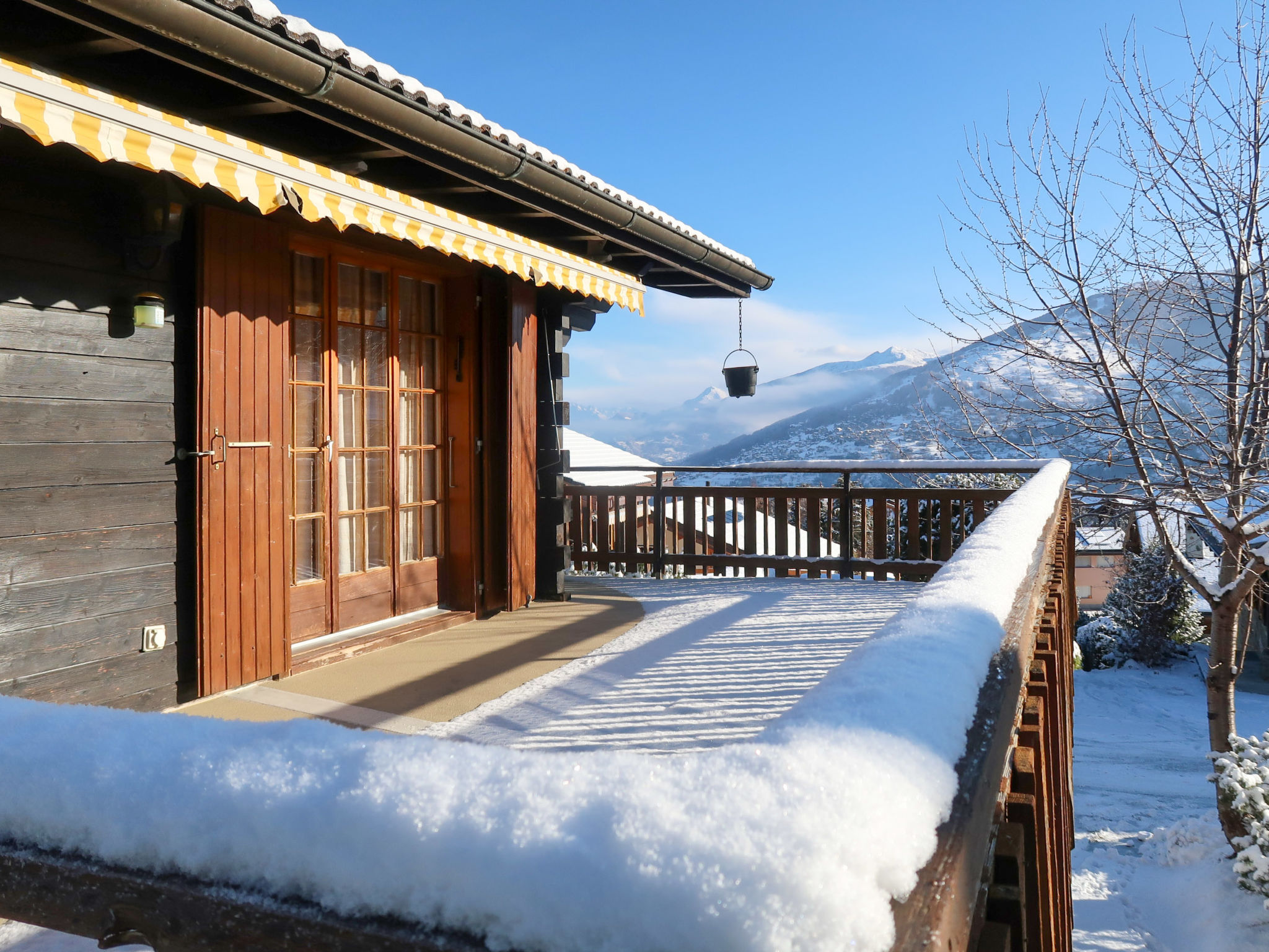 "Petite Plaisance", chalet 4 locali 95 m2. Arredamento funzionale e gradevole: ingresso. Soggiorno/sala da pranzo con camino e TV (via cavo). Uscita sulla terrazza. Cucina aperta (forno, lavastoviglie, 4 piastre ad induzione, tostapane, bollitore elettrico, forno a microonde, macchina da caffè elettrica, capsule per la macchina da caffè (nespresso) extra, set per raclette, set per fondue (formaggio)). WC separato. Riscaldamento elettrico. Piano inferiore: 1 camera con 2 letti (90 cm, lunghezza 200 cm). 1 camera con 2 letti (90 cm, lunghezza 200 cm), vasca/WC e lavabo doppio. Uscita verso il patio. 1 camera con 2 letti (90 cm, lunghezza 200 cm). Semicupio, WC separato. Piano attico: soppalco mansardato, aperto altezza del soffitto 80 - 120 cm. Balcone, esposizione est, grande terrazza, esposizione sud e esposizione est, giardino, esposizione ovest. Mobili da terrazza, barbecue. Splendida vista sulle montagne e sulla valle. A disposizione: lavatrice, asciugatrice, seggiolone, lettino per bimbi. Internet (wifi). Parcheggio, garage, altezza 190 cm, larghezza 230 cm. Prego notare: appartamento per non fumatori. Massimo 1 animale/cane consentito.
