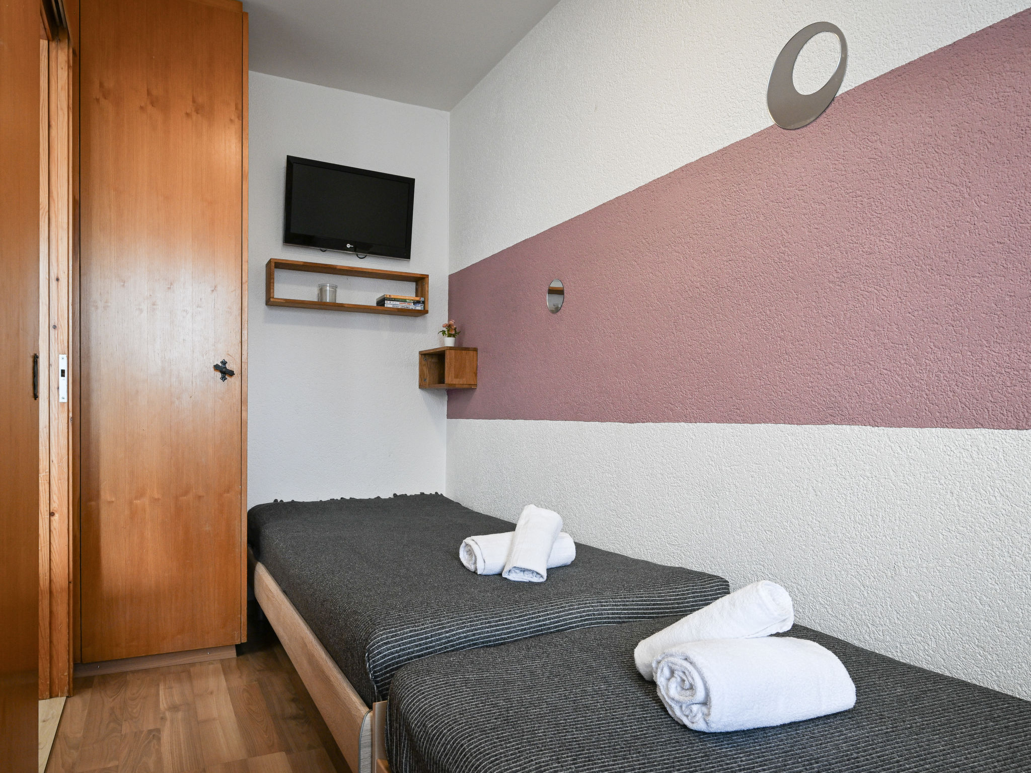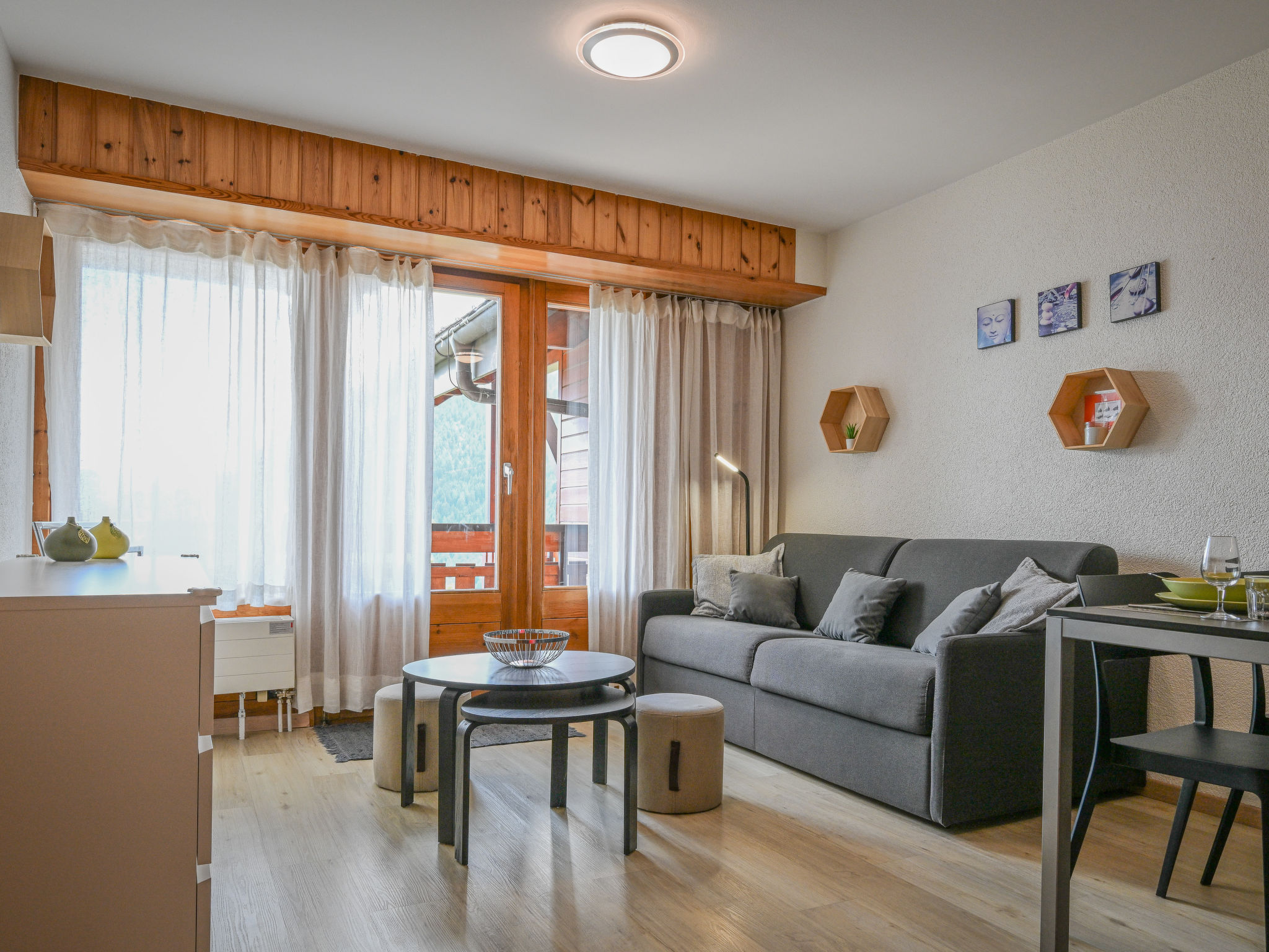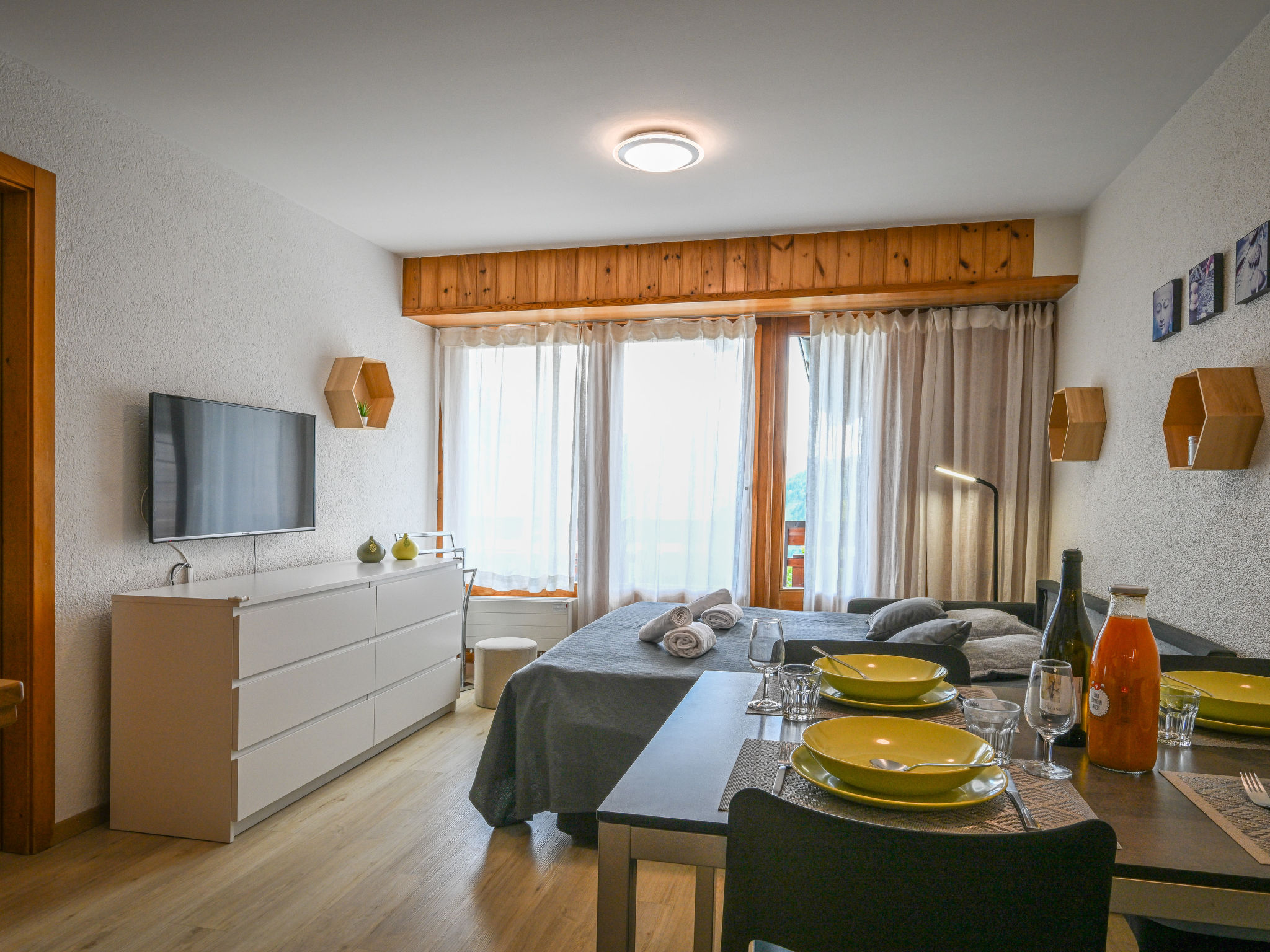 "Eaux-Vives 213", apt. di 2 locali 42 m2, esposizione sud. Arredamento gradevole e di buon gusto: ingresso. Soggiorno/sala da pranzo con 1 divano letto. Uscita sul balcone. 1 camera piccola con 2 letti (90 cm, lunghezza 180 cm). Cucina aperta (forno, lavastoviglie, 4 piastre cottura in vetroceramica, tostapane, macchina da caffè elettrica, capsule per la macchina da caffè (Dolce Gusto) extra, set per raclette, set per fondue (chinoise, formaggio)) con tavolo da pranzo. Doccia/WC. Grande balcone. Mobili da balcone. Bella vista sulle montagne. A disposizione: Internet (wifi, gratis). Garage nr. 213. Prego notare: appartamento per non fumatori. 1 animale/cane di piccola taglia consentito.