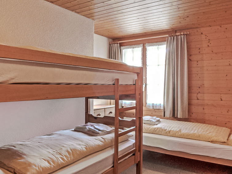 "Chäs Gruebi Apt.S", apt. di 4 locali 108 m2 al 2. piano. Arredamento confortevole e accogliente: soggiorno/sala da pranzo con 1 divano letto (80 cm, lunghezza 180 cm), 1 divano letto doppio (140 cm, lunghezza 180 cm), camino, TV (via cavo), radio e DVD. 2 camere, ogni camera con 1 letto doppio (2 x 80 cm, lunghezza 200 cm), doccia/WC. 1 camera con 1 letto (90 cm, lunghezza 190 cm), 1 x 2 letti a castello (90 cm, lunghezza 190 cm). Piccola cucina (4 punti cottura, forno, lavastoviglie, tostapane, bollitore elettrico, macchina da caffè elettrica, capsule per la macchina da caffè (Nespresso) extra, set per fondue (formaggio)). Vasca/WC. Riscaldamento. Balcone. Bella vista sulle montagne. A disposizione: ferro da stiro, asciugacapelli, legna (extra). Internet (wifi, gratis). Prego notare: appartamento per non fumatori.