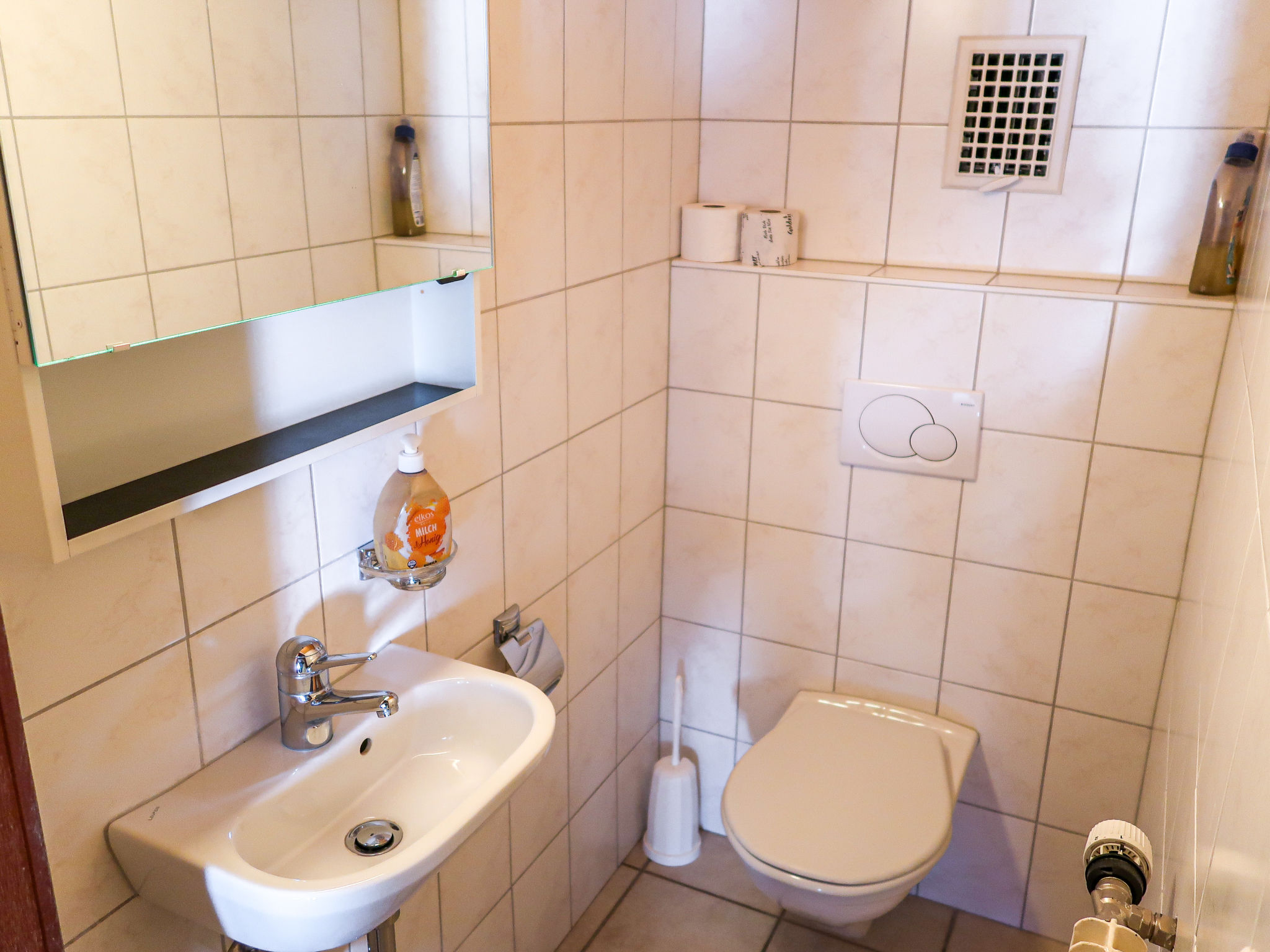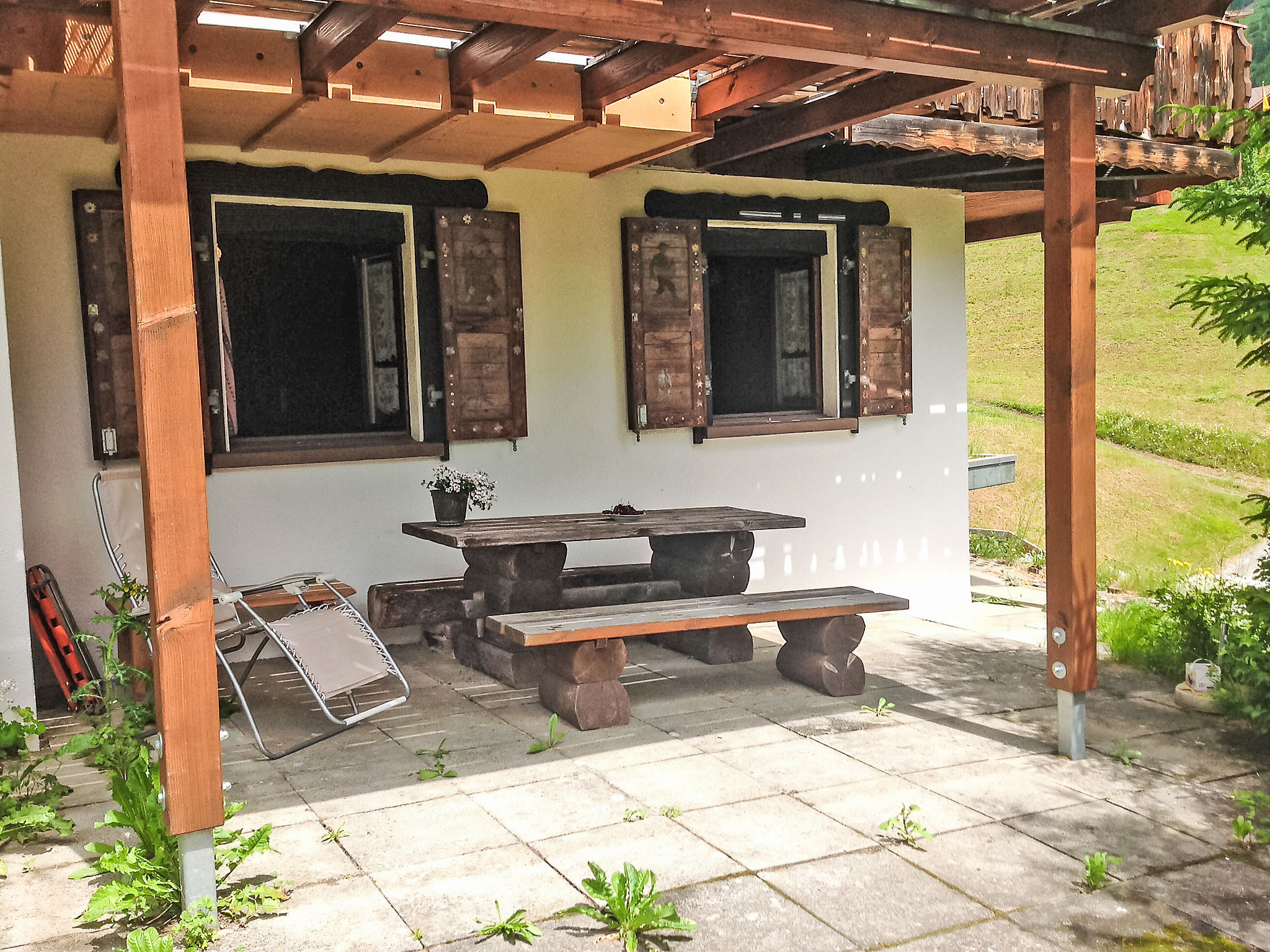 Apt. di 3 locali 50 m2, al pianterreno, esposizione sud. Arredamento semplice e accogliente: soggiorno/sala da pranzo piccolo con angolo pranzo e TV (satellite) (schermo piatto). 1 camera piccola con 1 letto doppio (180 cm, lunghezza 200 cm). 1 camera con 2 letti (90 cm, lunghezza 200 cm), lavabo. Piccola cucina aperta (4 punti cottura, forno, forno a microonde, macchina da caffè elettrica, set per raclette). Doccia, WC separato. Riscaldamento a gasolio. Patio 35 m2, in parte coperto. Mobili da terrazza, sedie a sdraio (5). Bella vista sulle montagne, sulla valle, sul paesaggio e sulla località. A disposizione: Internet (wifi, gratis). Parcheggio. Prego notare: appartamento per non fumatori. Massimo 1 animale/cane consentito.