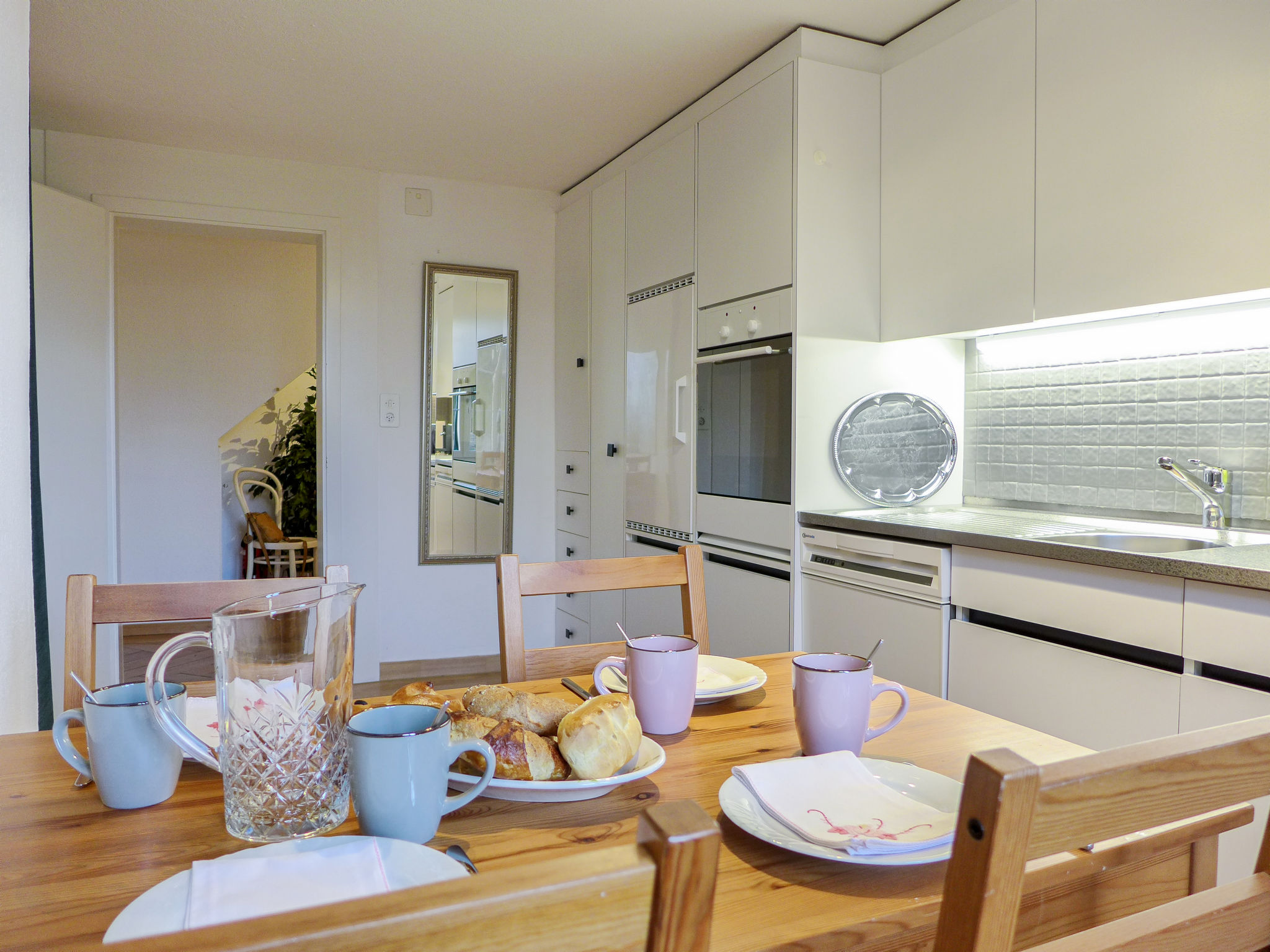 Apt. di 3 locali 70 m2 al 1. piano. Spazioso e luminoso, arredamento funzionale e accogliente: soggiorno/sala da pranzo grande con tavolo da pranzo e TV (via cavo). 1 camera piccola con 2 letti (80 cm, lunghezza 190 cm). 1 camera grande con 1 letto doppio (160 cm, lunghezza 200 cm). Grande cucina (3 punti cottura, forno, lavastoviglie, tostapane, bollitore elettrico, congelatore, macchina da caffè elettrica, capsule per la macchina da caffè (Delizio) extra, set per raclette, set per fondue (formaggio)) con piccolo tavolo da pranzo. Vasca/WC. Pavimenti in legno. Grande gazebo 16 m2, esposizione est e esposizione sud. Mobili da balcone. Splendida vista sulle montagne, sulla località e sul fiume. A disposizione: ferro da stiro, asciugacapelli. Internet (wifi, gratis). Parcheggio (1 Auto). Prego notare: casa per non fumatori. Allarme antifumo, estintore.
