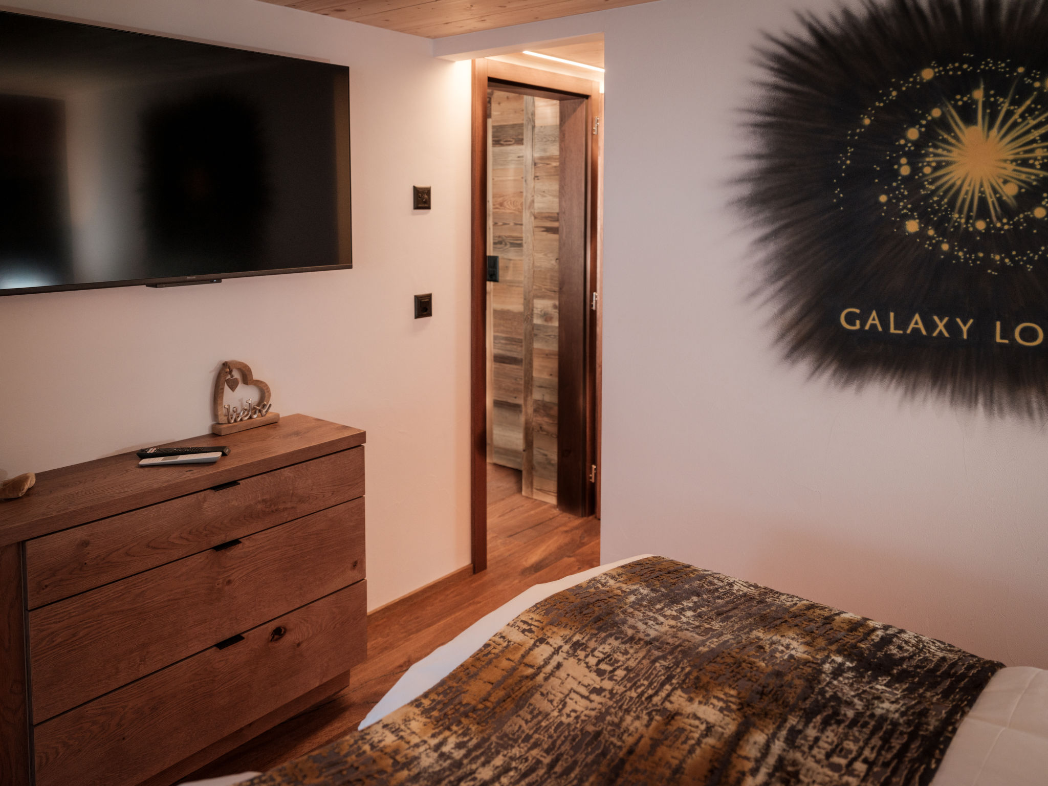 "Galaxy Lodge", apt. di 3 locali 52 m2 su 2 piani al 1. piano, esposizione est. Completamente restaurato nel 2023, arredamento gradevole e moderno: soggiorno con 1 divano letto doppio (160 cm, lunghezza 200 cm), TV. Uscita sul balcone. 1 camera con 1 letto doppio (1 x 180 cm, lunghezza 200 cm). Cucina (forno, lavastoviglie, 4 piastre cottura in vetroceramica, tostapane, bollitore elettrico, congelatore, macchina da caffè elettrica). Doccia/WC. Riscaldamento. Piano superiore: 1 camera con 1 letto doppio (1 x 180 cm, lunghezza 200 cm). Piccolo balcone, esposizione ovest. Parziale vista sulle montagne. A disposizione: asciugacapelli. Internet (wifi, gratis). Prego notare: appartamento per non fumatori.