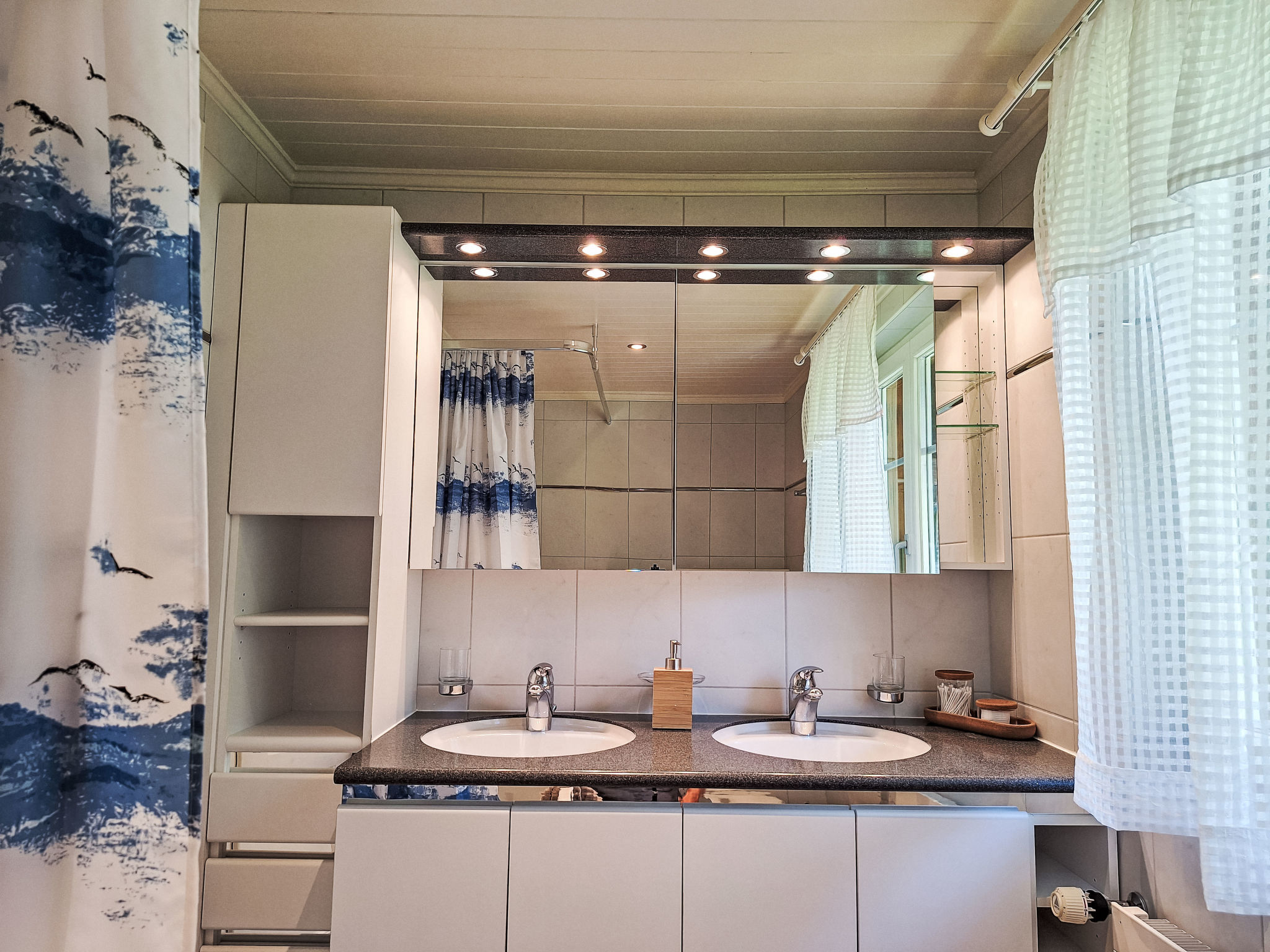 "Haus am See 4B", chalet 5 locali su 3 piani. Spazioso e luminoso, arredamento molto confortevole e accogliente: soggiorno con stufa svedese e TV (via cavo). Uscita sul balcone. Sala da pranzo. Uscita sul balcone. Cucina (forno, lavastoviglie, 4 piastre cottura in vetroceramica, tostapane, bollitore elettrico, forno a microonde, macchina da caffè elettrica). WC separato. Piano superiore: 2 camere, ogni camera con 1 letto (90 cm, lunghezza 200 cm). 1 camera matrimoniale grande con 1 letto doppio (180 cm, lunghezza 200 cm). Uscita sul balcone. Vasca/doccia/WC, lavabo doppio. 2 balconi, esposizione sud balcone, esposizione ovest. Magnifica vista sul lago, sulle montagne e sul paesaggio. A disposizione: asciugacapelli. Internet (wifi). Prego notare: casa per non fumatori. Allarme antifumo, estintore. La proprietà si trova direttamente sul lago e non è recintata.