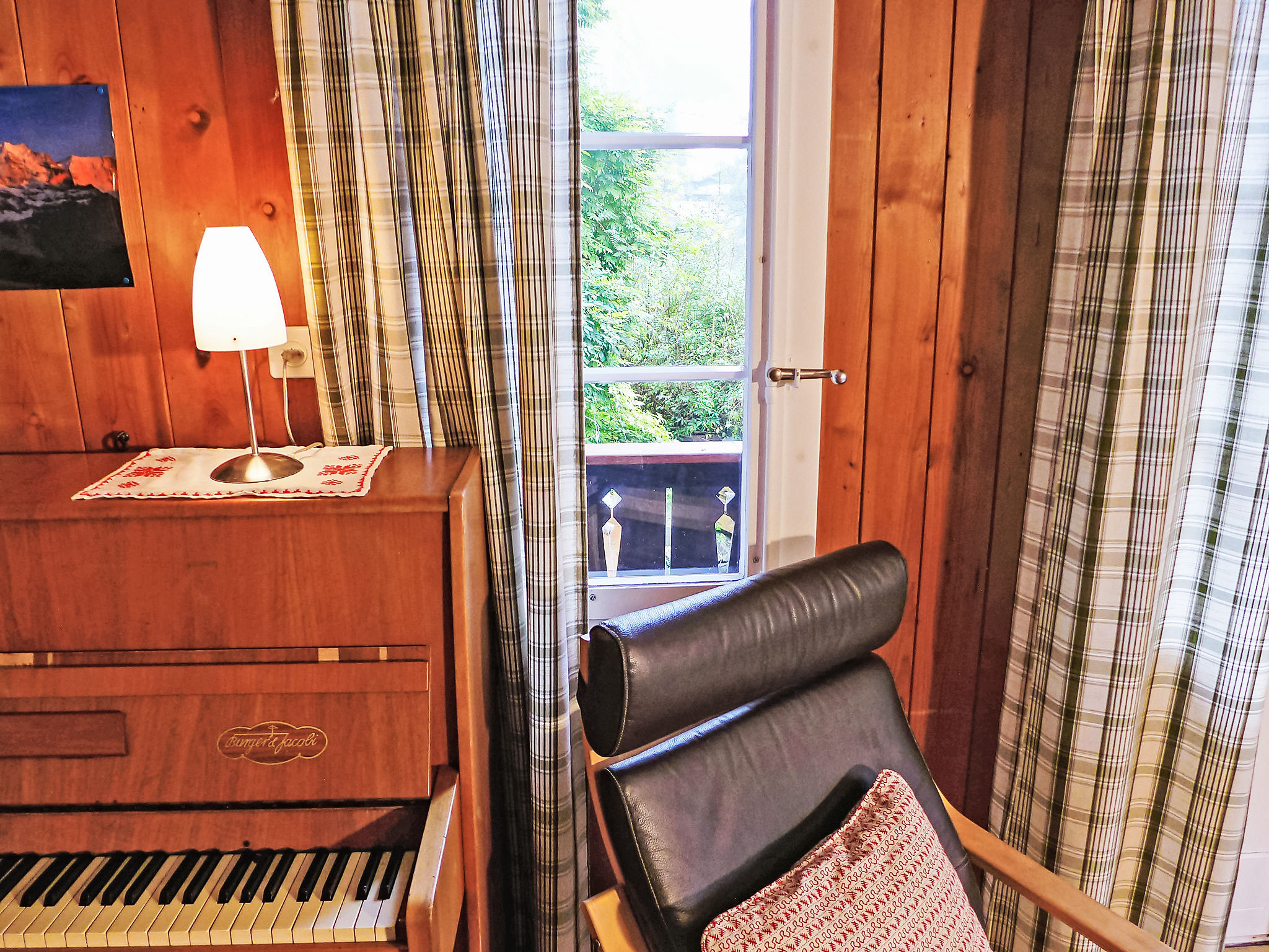 Apt. di 2 locali 60 m2, piano rialzato, esposizione sud. Arredamento rustico e accogliente: soggiorno/camera grande 35 m2 con 1 letto estraibile (2 x 90 cm), TV (via cavo), radio e CD. Uscita sul balcone, verso il patio. 1 camera matrimoniale con 1 letto doppio (2 x 90 cm, lunghezza 200 cm). Cucina aperta (4 punti cottura, forno, forno a microonde, macchina da caffè elettrica, capsule per la macchina da caffè (Nespresso) extra, set per raclette, set per fondue (formaggio)) con stufa svedese e angolo pranzo. Vasca/WC. Riscaldamento elettrico. Grande balcone 15 m2, esposizione sud-ovest. Mobili da terrazza. Magnifica vista sulle montagne e sul paesaggio. A disposizione: legna (extra). Internet (wifi, gratis). Parcheggio (1 Auto) a 100 m. Prego notare: appartamento per non fumatori. Massimo 1 animale/cane consentito.