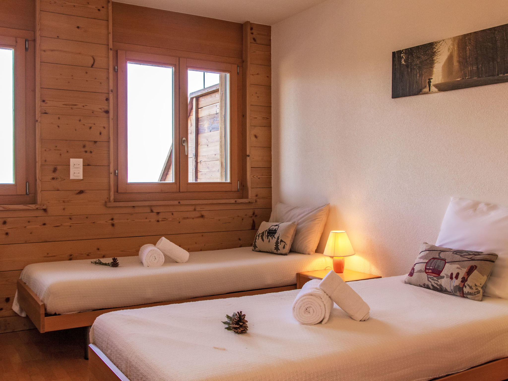 "Grands Ducs 101G", apt. di 4 locali 95 m2 al 1. piano. Arredamento confortevole: soggiorno/sala da pranzo con finestra panoramica con camino, TV (via cavo), video e impianto stereo. Uscita sulla terrazza. 1 camera con 1 letto alla francese (180 cm, lunghezza 200 cm). Uscita sul giardino. 2 camere, ogni camera con 2 letti (90 cm, lunghezza 200 cm). Cucina aperta (forno, lavastoviglie, 4 piastre cottura in vetroceramica, forno a microonde, congelatore, set per raclette, set per fondue (formaggio)). Vasca/WC, doccia/WC. Grande terrazza 105 m2, esposizione nord e esposizione ovest, giardino 70 m2. Mobili da terrazza. Vista panoramica sulle montagne e sulla valle. A disposizione: seggiolone, lettino per bimbi, asciugacapelli. Internet (wifi, gratis). Parcheggio nr. 101, garage, altezza 210 cm, larghezza 230 cm. Prego notare: appartamento per non fumatori.