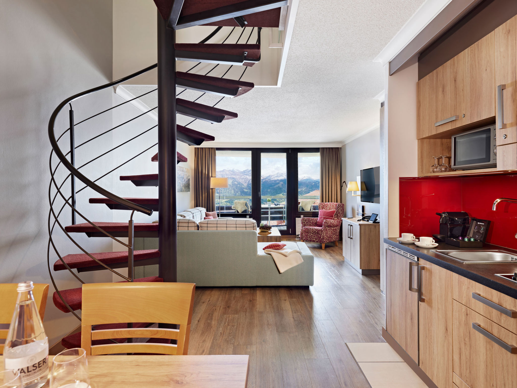 "Komfort Maisonette, Dorint Blümlisalp", apt. di 2 locali 56 m2 su 2 piani. Soggiorno/sala da pranzo con 2 divani letto, TV (via cavo) e radio. 1 camera con 1 letto doppio. Angolo cottura (2 punti cottura, lavastoviglie, forno a microonde, macchina da caffè elettrica, capsule per la macchina da caffè (Nespresso) extra). Vasca/WC. Balcone, esposizione sud. Splendida vista panoramica. A disposizione: telefono, lettino per bimbi fino 2 anni. Internet (wifi, gratis). Massimo 1 animale/cane consentito.