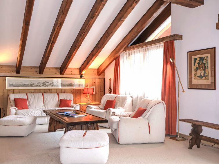 Apt. di 3 locali 152 m2 su 2 piani al 4. piano, esposizione sud-ovest. Arredamento semplice e confortevole: soggiorno/camera con 1 divano letto doppio (140 cm, lunghezza 200 cm), camino (solo con funzione decorativa), tv digitale. Uscita sul balcone, esposizione sud. 1 camera matrimoniale con 1 letto doppio (2 x 90 cm, lunghezza 200 cm). Cucina aperta (forno, lavastoviglie, 4 piastre cottura in vetroceramica, forno a microonde, congelatore, macchina da caffè elettrica). Vasca/WC. Riscaldamento. Piano superiore: (scala a chiocciola) 1 camera matrimoniale con 1 letto doppio (2 x 90 cm, lunghezza 200 cm). Uscita sul balcone, esposizione sud. Vasca/doccia/WC. Mobili da balcone. Parziale vista sul cervino. A disposizione: lavatrice. Internet (wifi, gratis). Prego notare: appartamento per non fumatori.