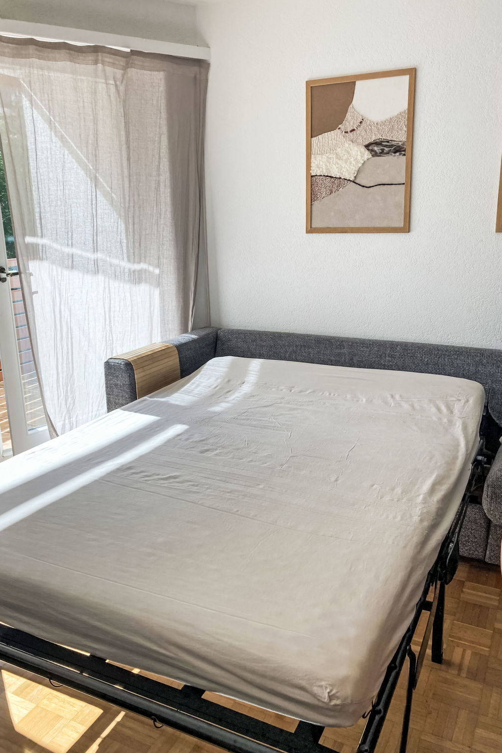 "Dala", apt. di 3 locali 60 m2 al 3. piano. Luminoso, completamente restaurato nel 2023, arredamento gradevole e accogliente: soggiorno/sala da pranzo con 1 divano letto (140 cm, lunghezza 200 cm), angolo pranzo e tv digitale. Uscita sul balcone. 1 camera matrimoniale con 1 letto doppio (160 cm, lunghezza 200 cm). 1 camera con 1 letto (90 cm, lunghezza 200 cm), 1 letto doppio (1 x 140 cm, lunghezza 200 cm). Grande cucina (forno, lavastoviglie, 4 piastre cottura in vetroceramica, tostapane, bollitore elettrico, forno a microonde, congelatore, macchina da caffè elettrica). Uscita sul balcone. Doccia/WC. 2 balconi. Mobili da balcone. Bella vista sulle montagne e sulla località. A disposizione: Internet (wifi, gratis). Prego notare: appartamento per non fumatori.