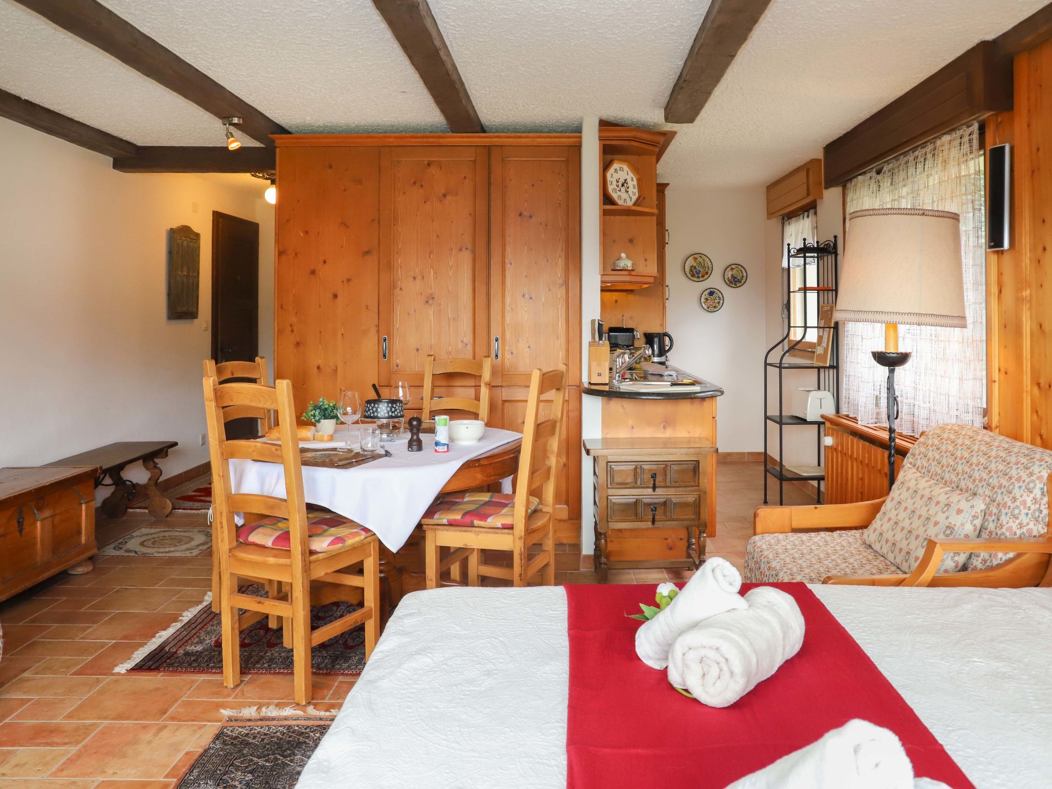"Courtillière 4" monolocale 40 m2, al pianterreno, esposizione sud. Arredamento funzionale e gradevole: soggiorno/sala da pranzo grande con 1 divano letto doppio (1 x 160 cm, lunghezza 200 cm). Uscita sul giardino, esposizione sud e esposizione est. Angolo cottura (forno, lavastoviglie, forno a microonde, macchina da caffè elettrica, capsule per la macchina da caffè (Nespesso) extra, set per raclette, set per fondue (formaggio)). Doccia/WC. Grande giardino 60 m2, esposizione sud e esposizione est. Mobili da balcone, sedie a sdraio. Bella vista sulle montagne e sulla pista da sci. A disposizione: Internet (wifi). Garage nr. 19, 014 vicino alla casa. Prego notare: appartamento per non fumatori, casa per non fumatori.