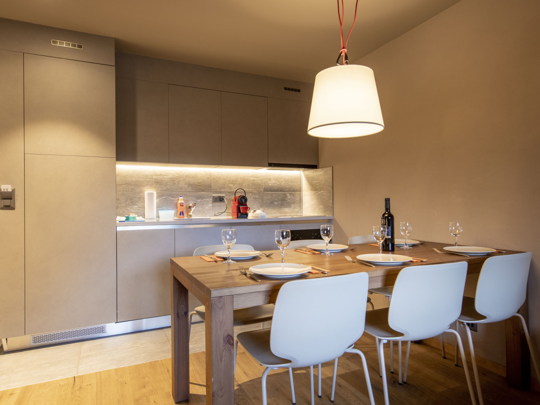 "3 room apartment DELUXE", apt. di 3 locali 52 m2, esposizione ovest. Arredamento confortevole e accogliente: soggiorno/sala da pranzo con 1 divano letto doppio, tavolo da pranzo, tv con canali internazionali e schermo piatto. 1 camera con 1 letto doppio (2 x 90 cm, lunghezza 210 cm). 1 camera con 1 letto doppio (2 x 90 cm, lunghezza 210 cm), doccia/WC. Uscita sul balcone. Cucina aperta (forno, lavastoviglie, 4 piastre cottura in vetroceramica, macchina da caffè elettrica, capsule per la macchina da caffè (Nespresso) extra, set per raclette, set per fondue (chinoise, formaggio)). Doccia, WC separato. Riscaldamento a pavimento. Pavimenti in parquet. Balcone 5 m2, esposizione ovest. Mobili da balcone. A disposizione: asciugacapelli. Internet (wifi, gratis). Prego notare: casa per non fumatori. 1 animale/cane consentito. Allarme antifumo. L'oggetto in affitto è una casa-tipo / un appartamento-tipo. Il set per fonduta (carne o formaggio) e un forno per raclette possono essere presi in prestito alla reception dietro pagamento di una cauzione.